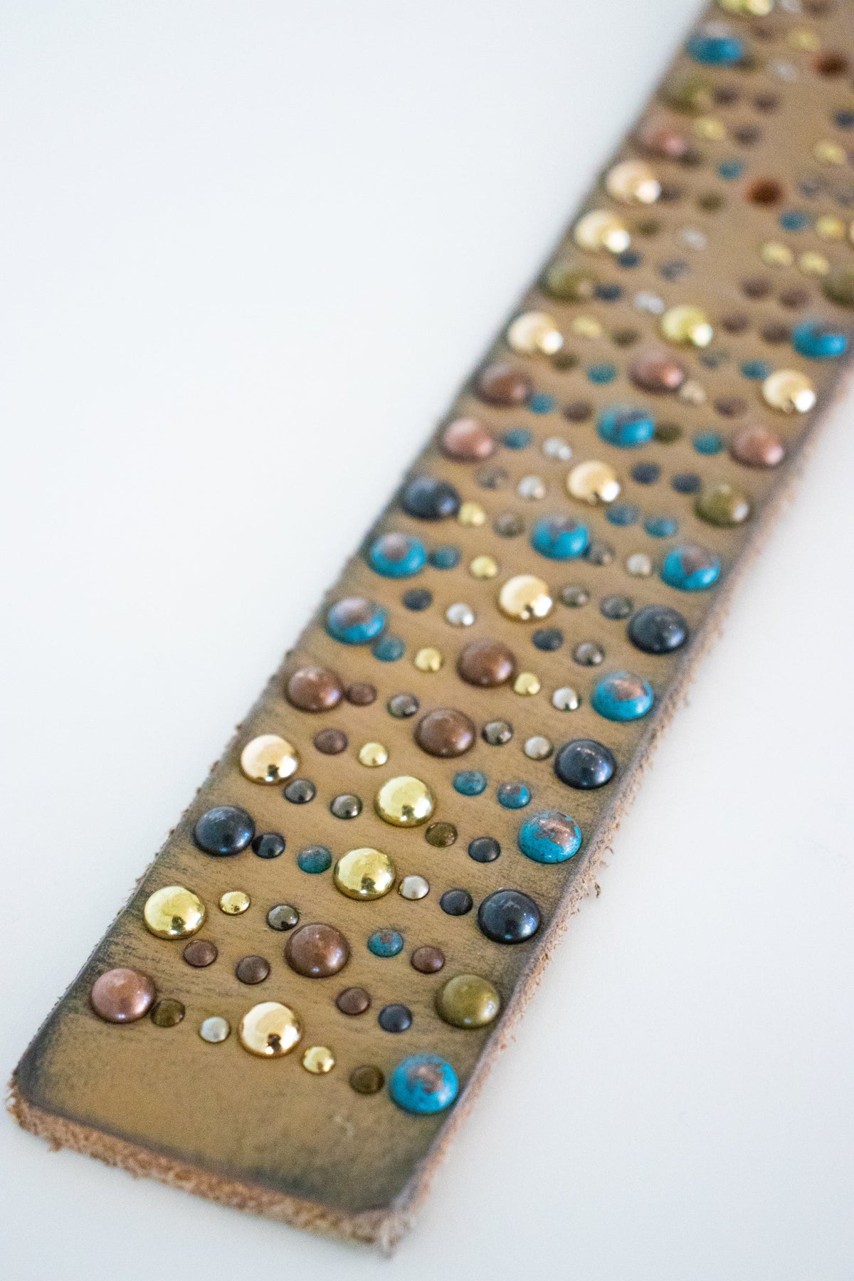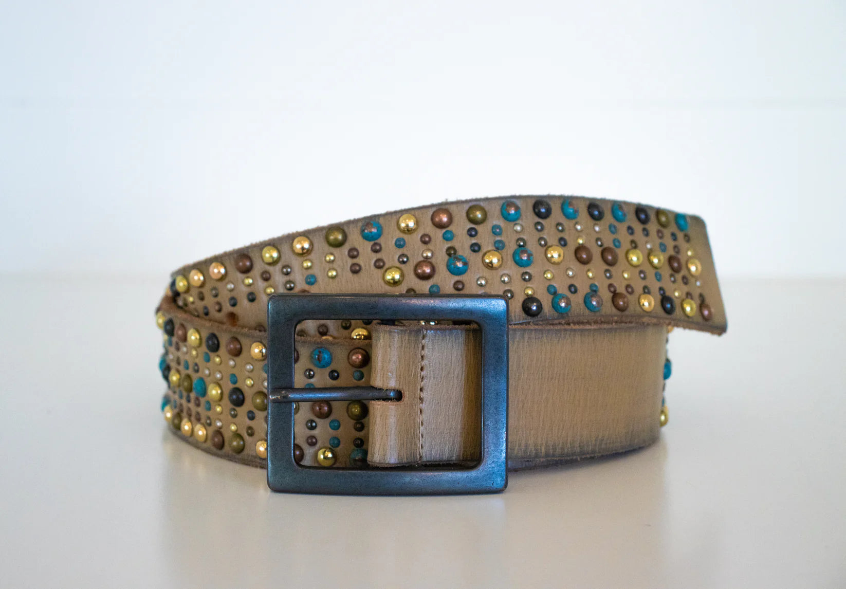 Make a bold statement with the Montana Stud Belt, where premium tan genuine leather meets eye-catching metalwork. This 4cm-wide design features striking stud details in blackened silver, copper, gold, and turquoise that elevate any outfit with sophisticated edge. Anchored by a durable blackened silver and zinc alloy buckle, it's crafted for those who refuse to blend in. A versatile showstopper that transitions effortlessly from casual to dressed-up occasions.