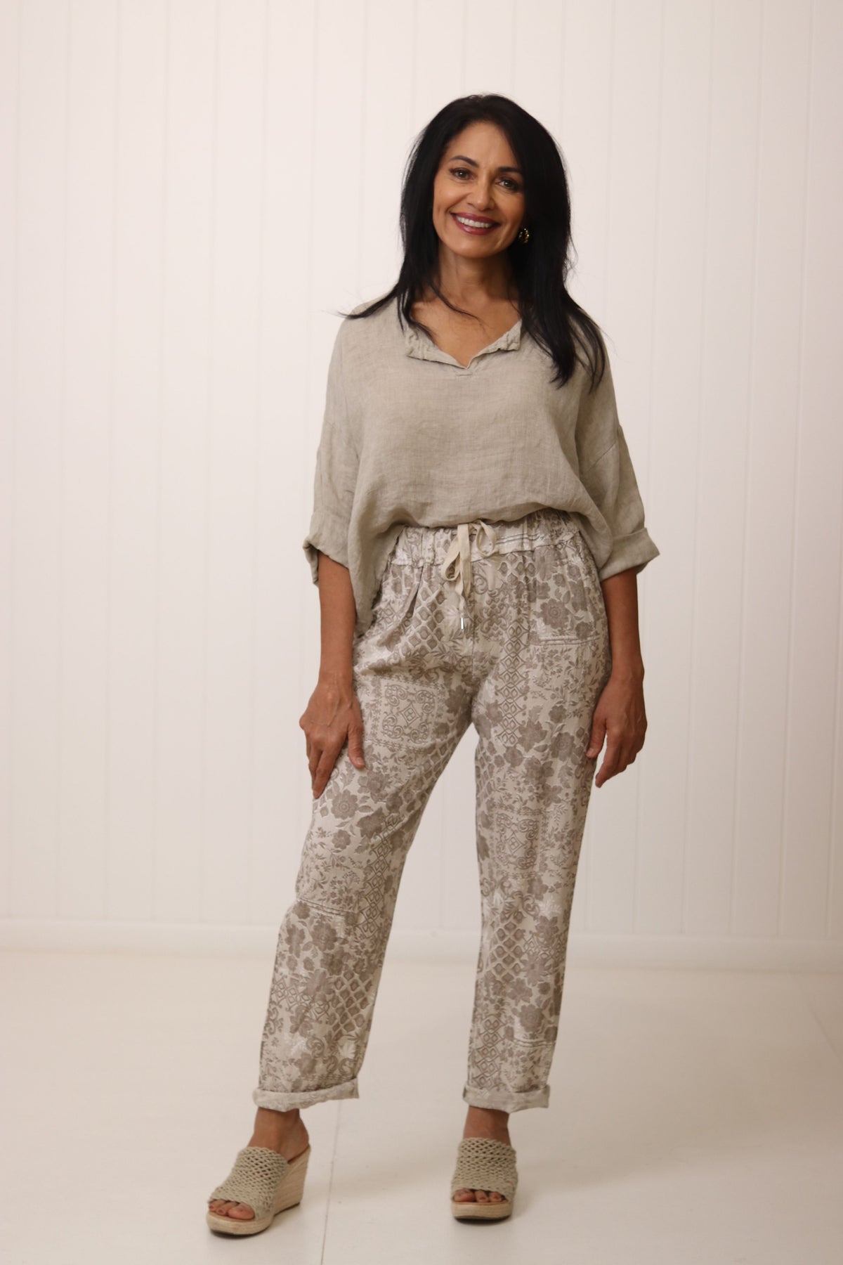 The Aria Viscose Print Pant combines comfort and style with its elastic waistband and adjustable tie-up waist, ensuring a perfect fit. Crafted from a breathable viscose and linen blend, these pants feature convenient side and back pockets for added functionality. The elegant print adds a sophisticated touch, making them ideal for both casual and refined looks.