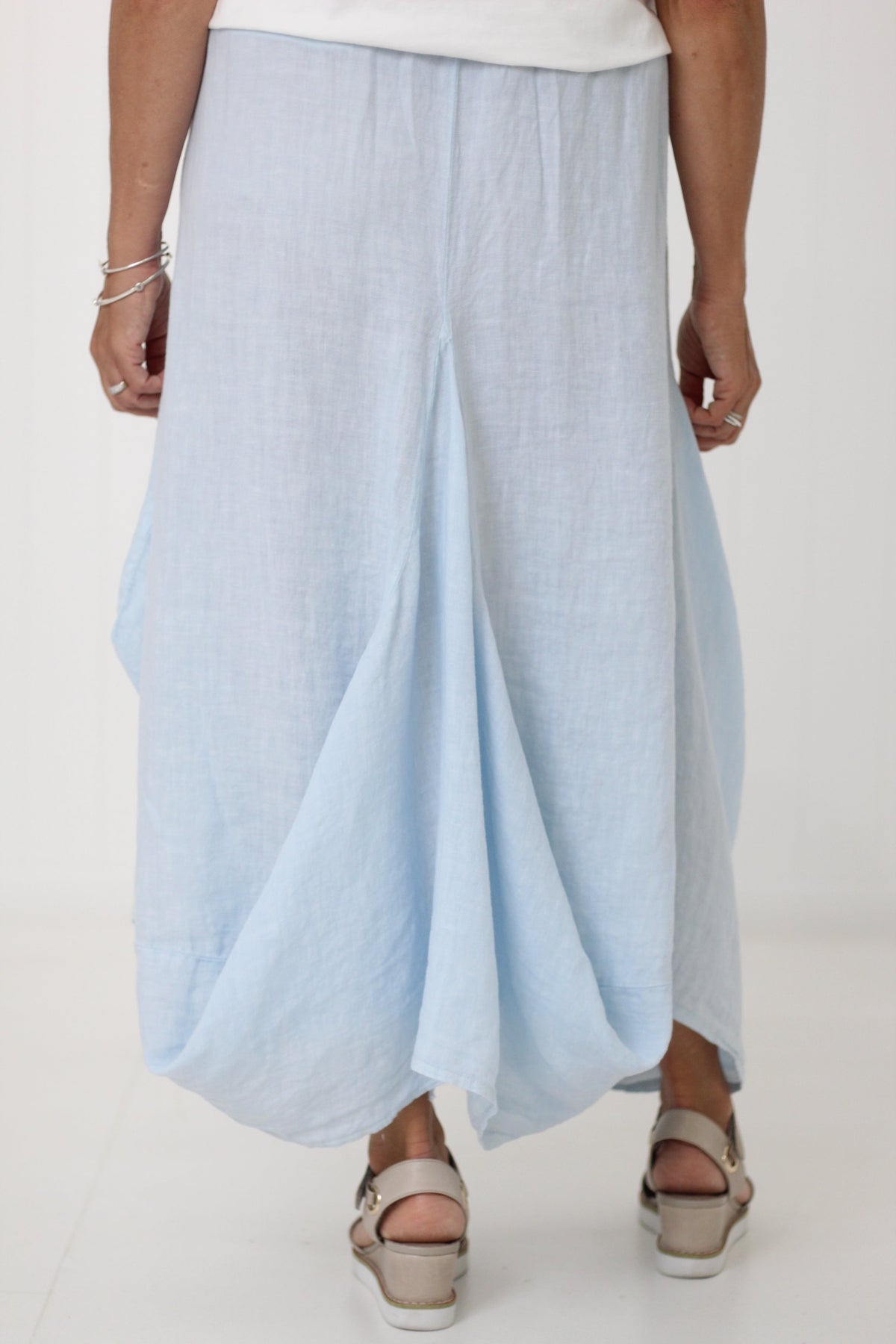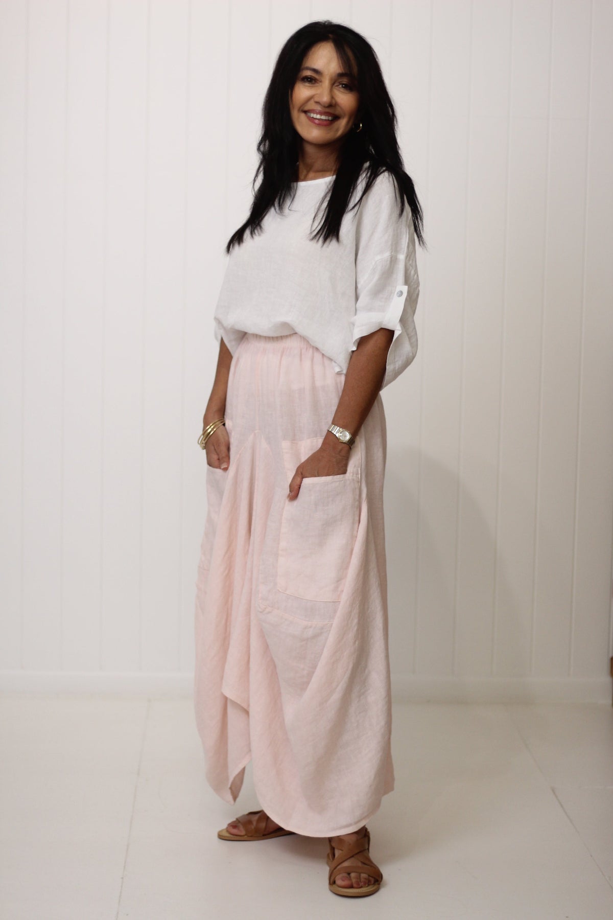 Discover the timeless elegance of the Marinella Skirt. Made of luxurious Italian linen, this skirt features an elastic waist for a comfortable fit and a draped front for a flattering silhouette. Its large pockets add feature and functionality, making it the perfect staple. This skirt is wonderful for its style, quality & versatility!