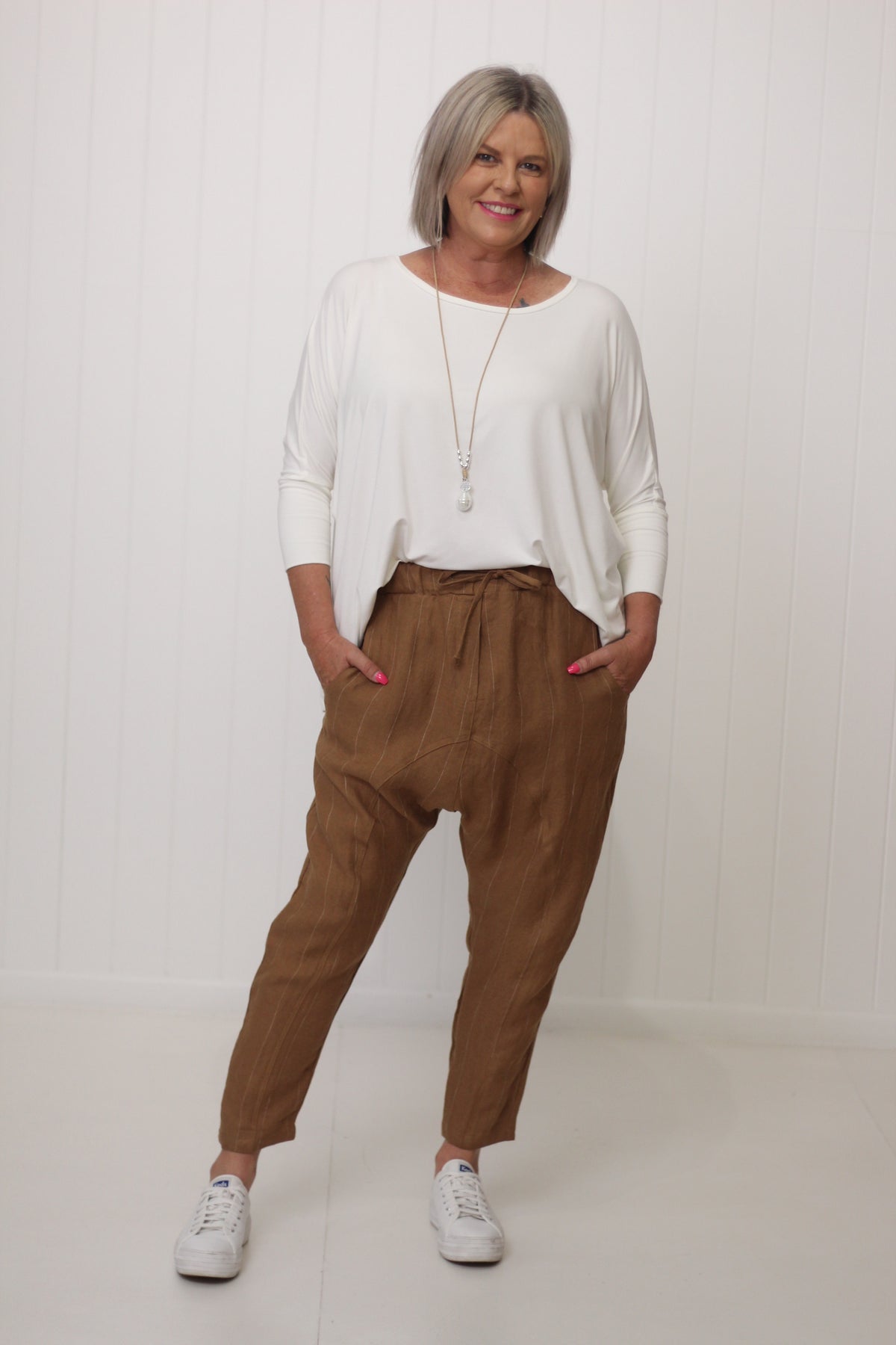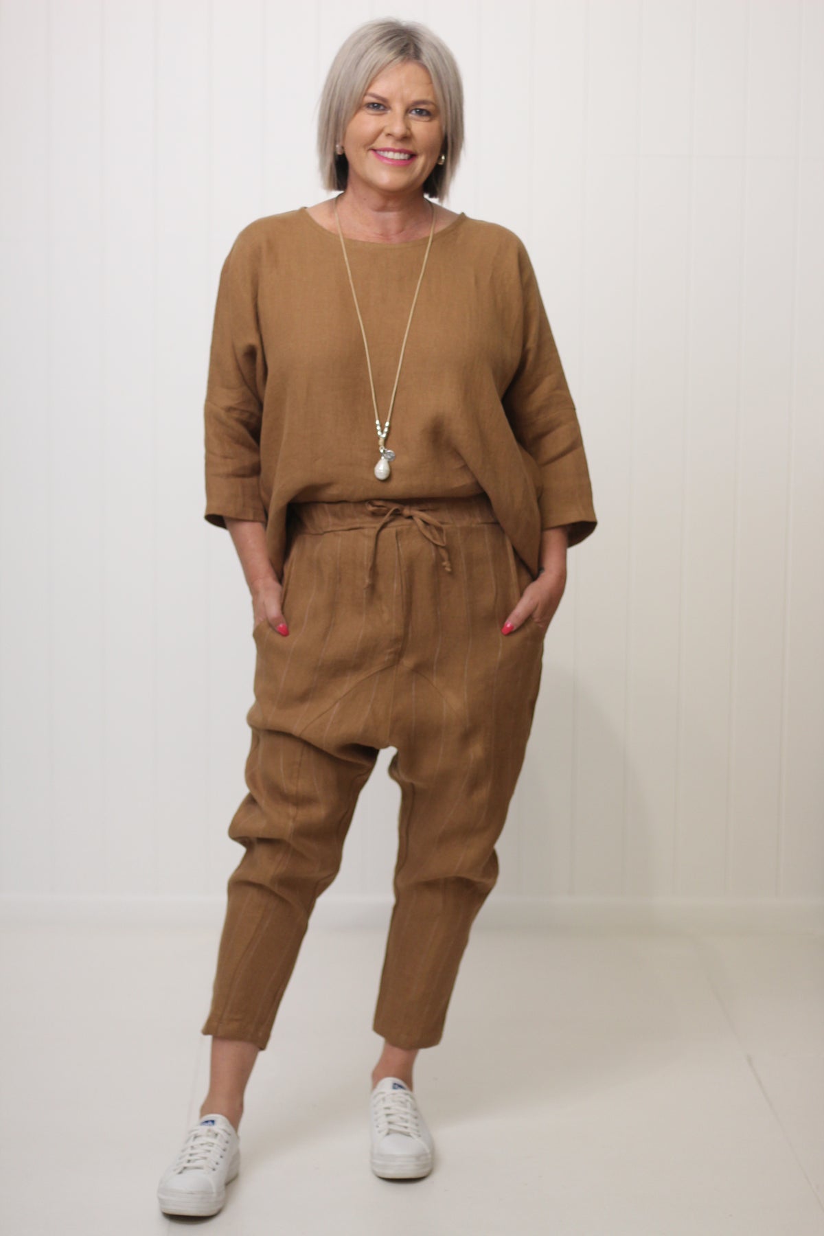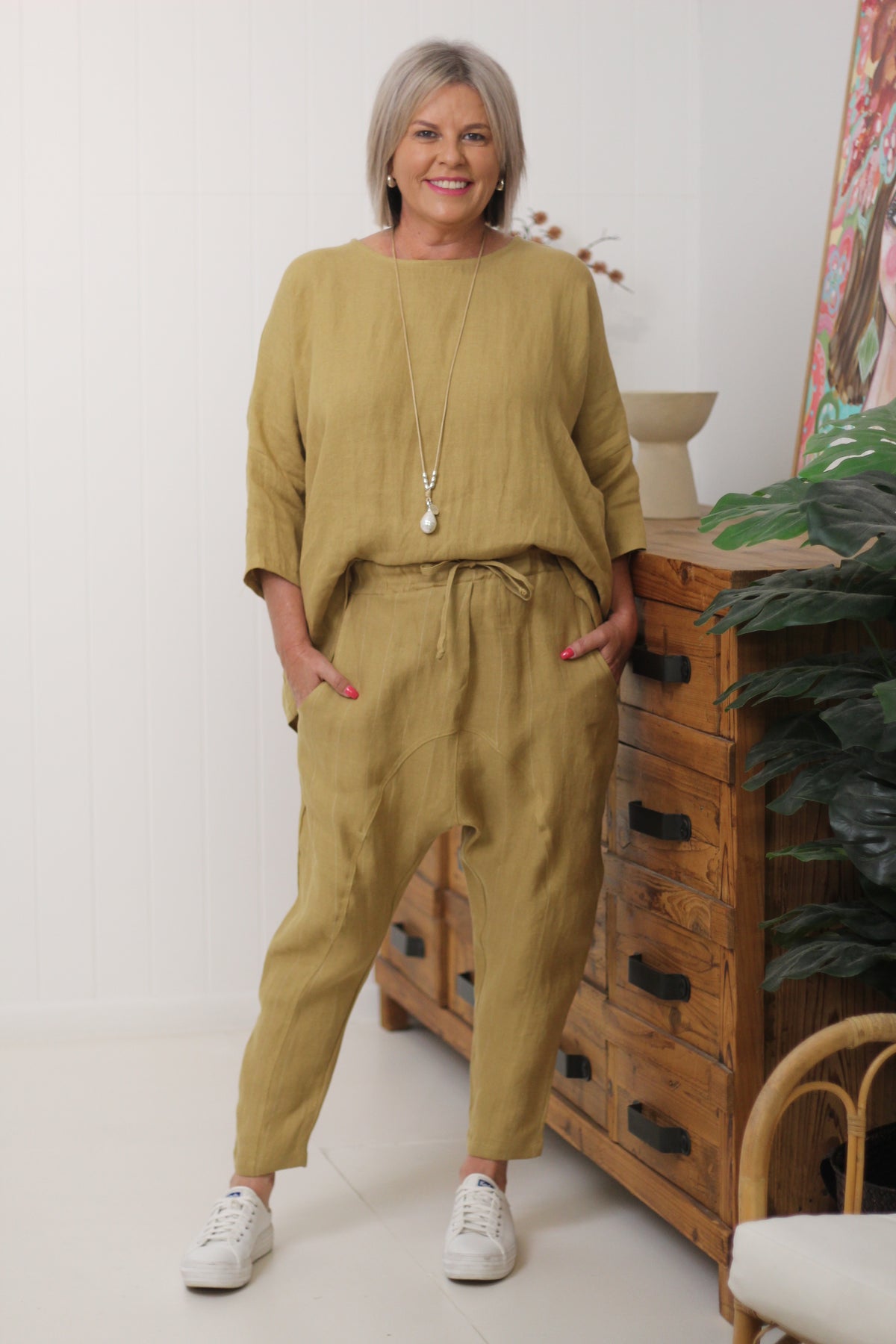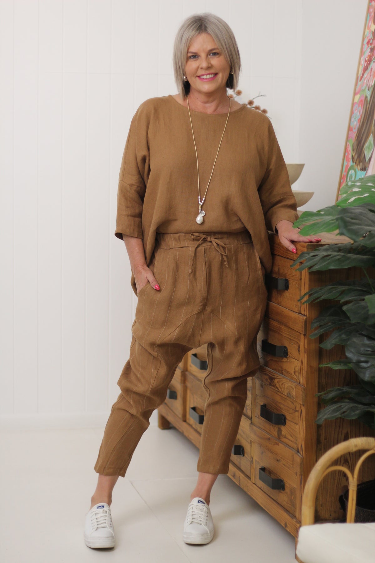 Kay is size 10, wearing XS and has styled with our Bamboo Hinley Top Sleeved and our Hinley Top in linen.