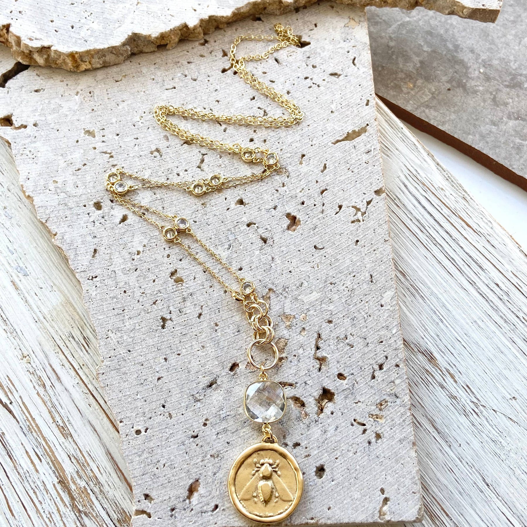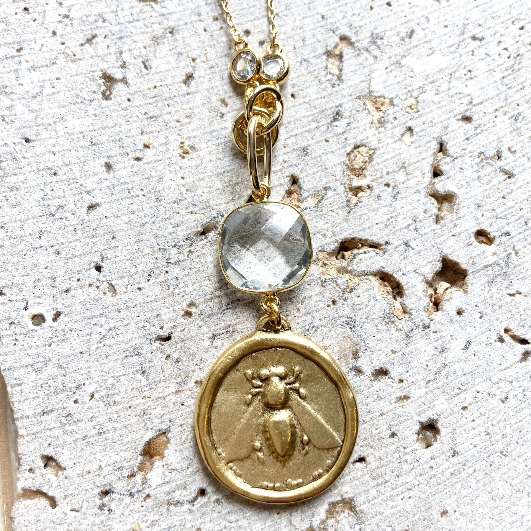 Reversible hand casted bee/crown gold queen bee long gold necklace. Genuine crystal quartz 32”