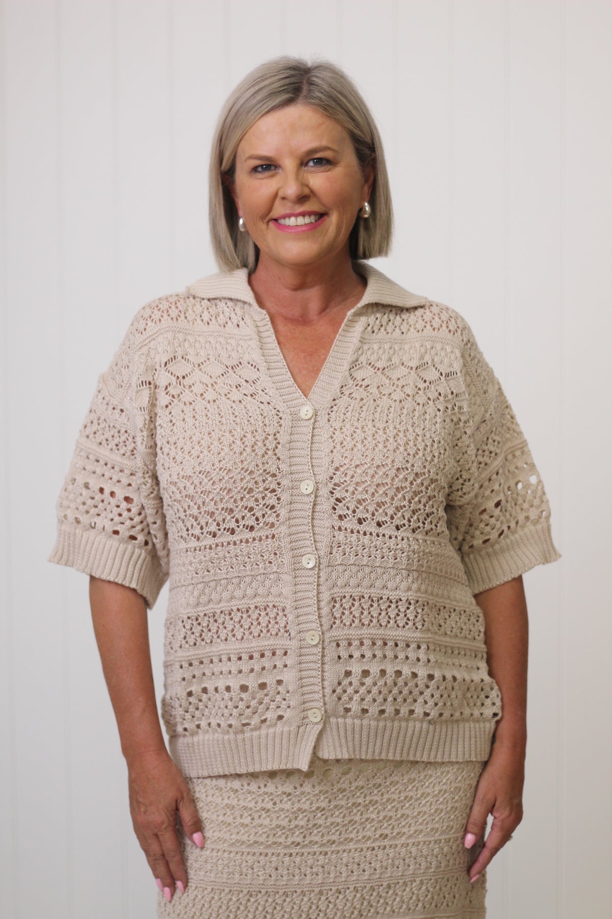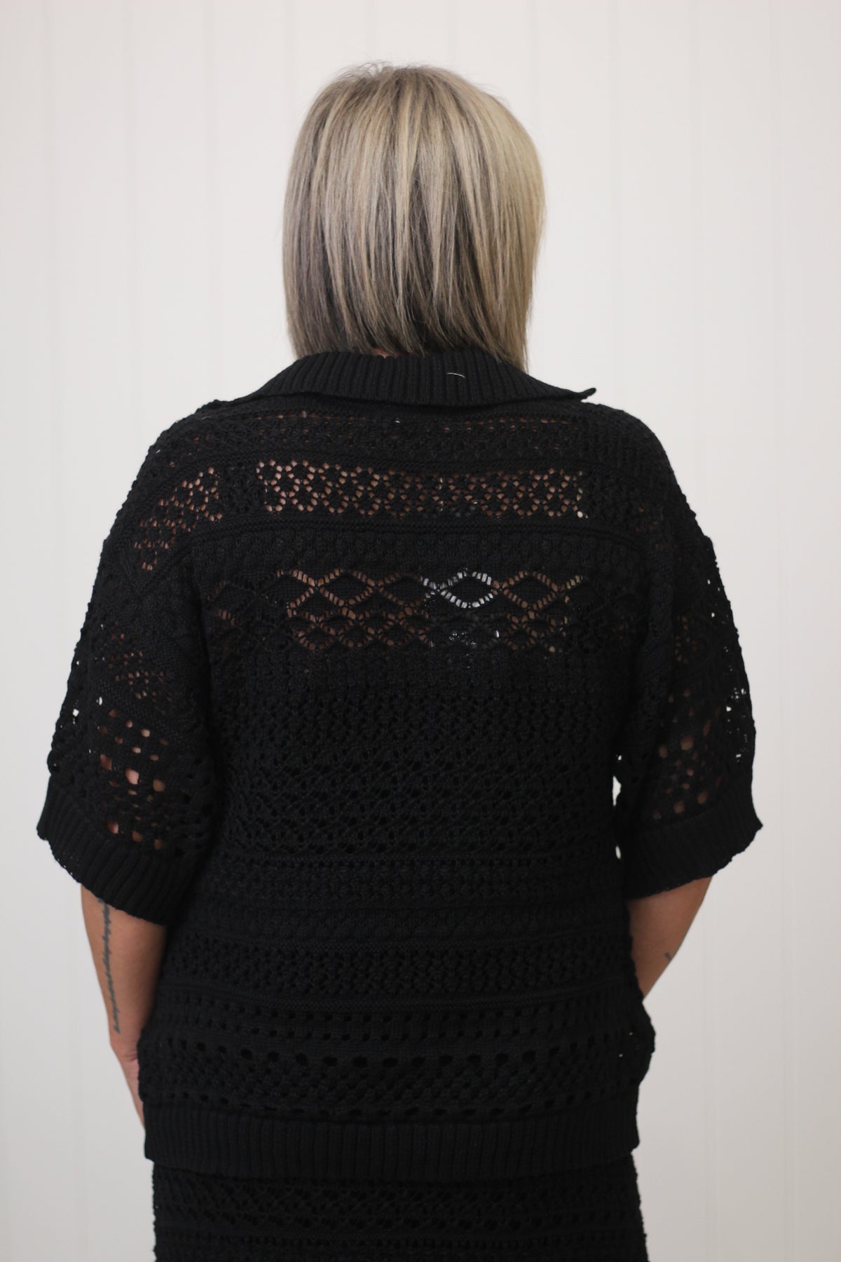 The LaSol Shirt beautifully designed with versatility in mind. This knitted button-up shirt features a classic collar, flattering V-neckline, and elegant elbow-length sleeves, finished with refined ribbed edging. Its intricate patterned design creates a subtle sheer effect, making it perfect for layering over a cami or wearing open as a lightweight jacket.
