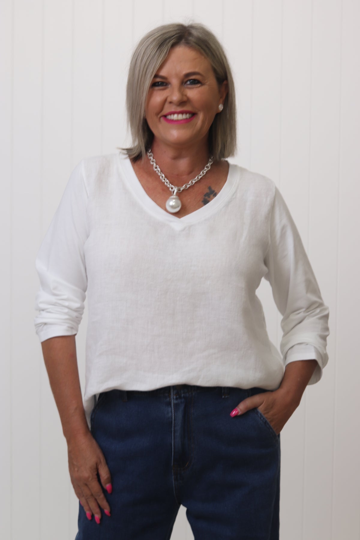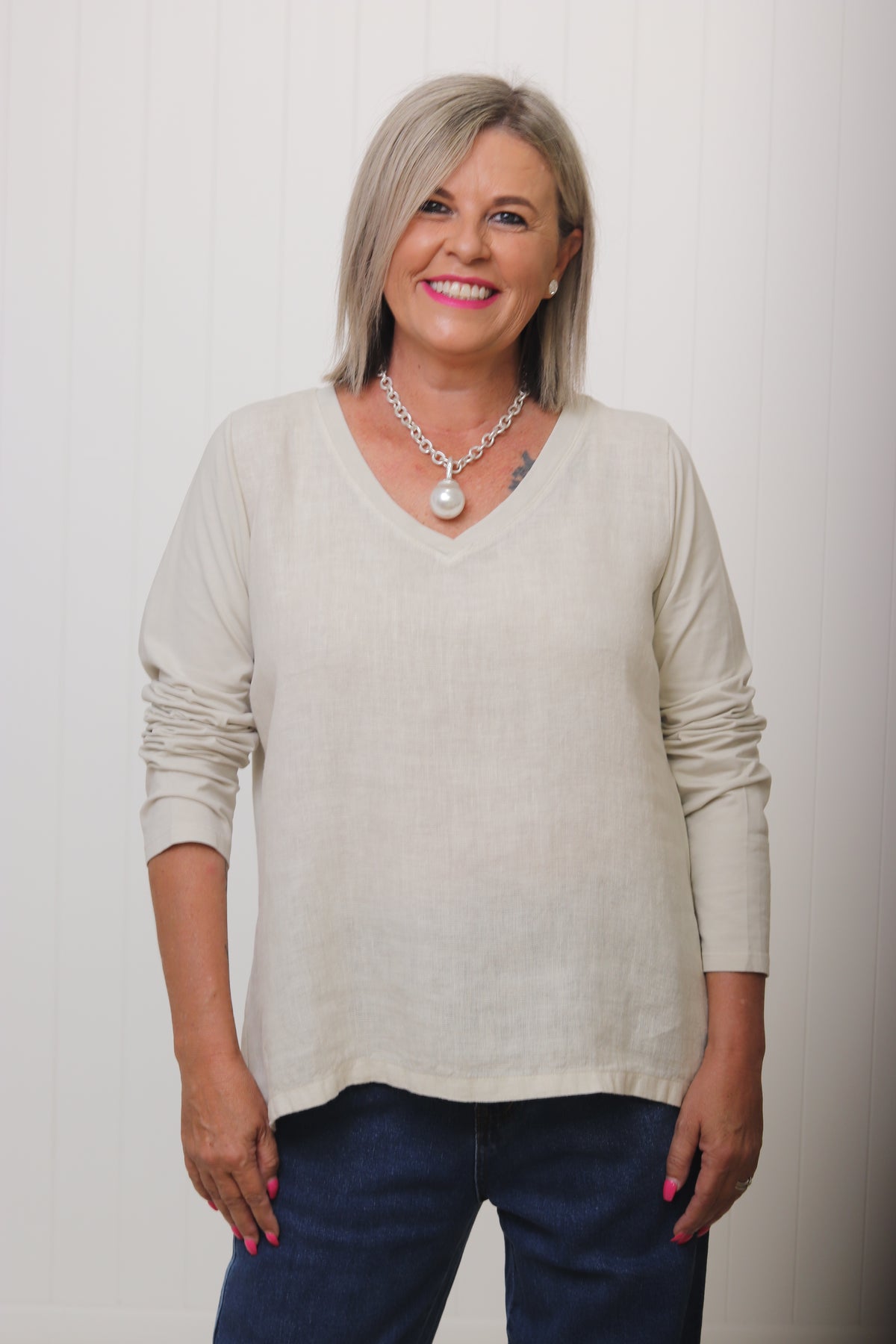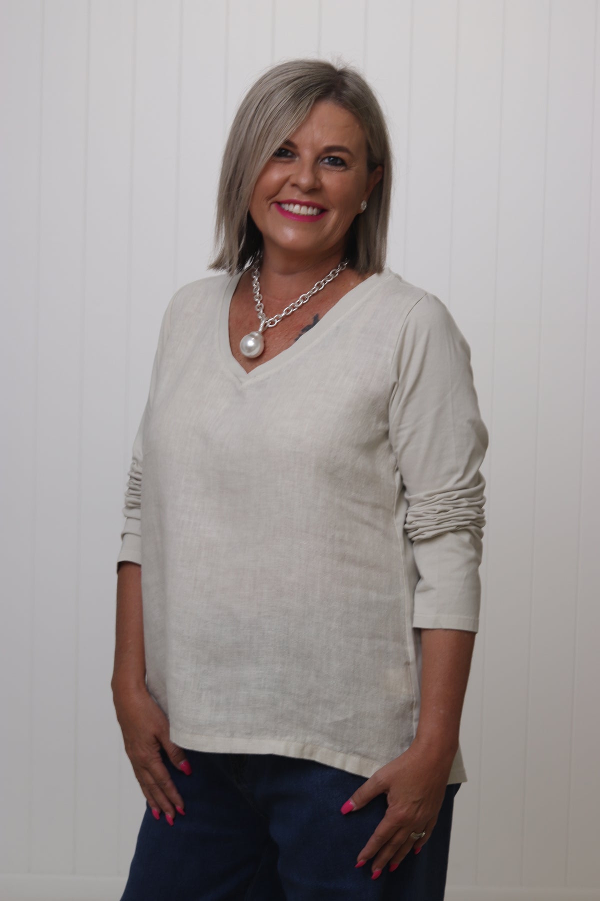 The Amalia Top is one of our most popular Costa Vita Purolino styles and now she comes with a full length sleeve making her perfect for styling when it is a little cooler. An essential piece for any wardrobe. With its smart yet casual look, it's perfect for everyday wear. Made with a 100% linen front and cotton back and sleeves, it offers both comfort and style. The slight varition we made from the original was to remove the wooden buttons off the neckline to allow for winter styling under jumpers and jackets. This creates a fantastic timeless style to allow endless options for the addition of jewellery and scarves.