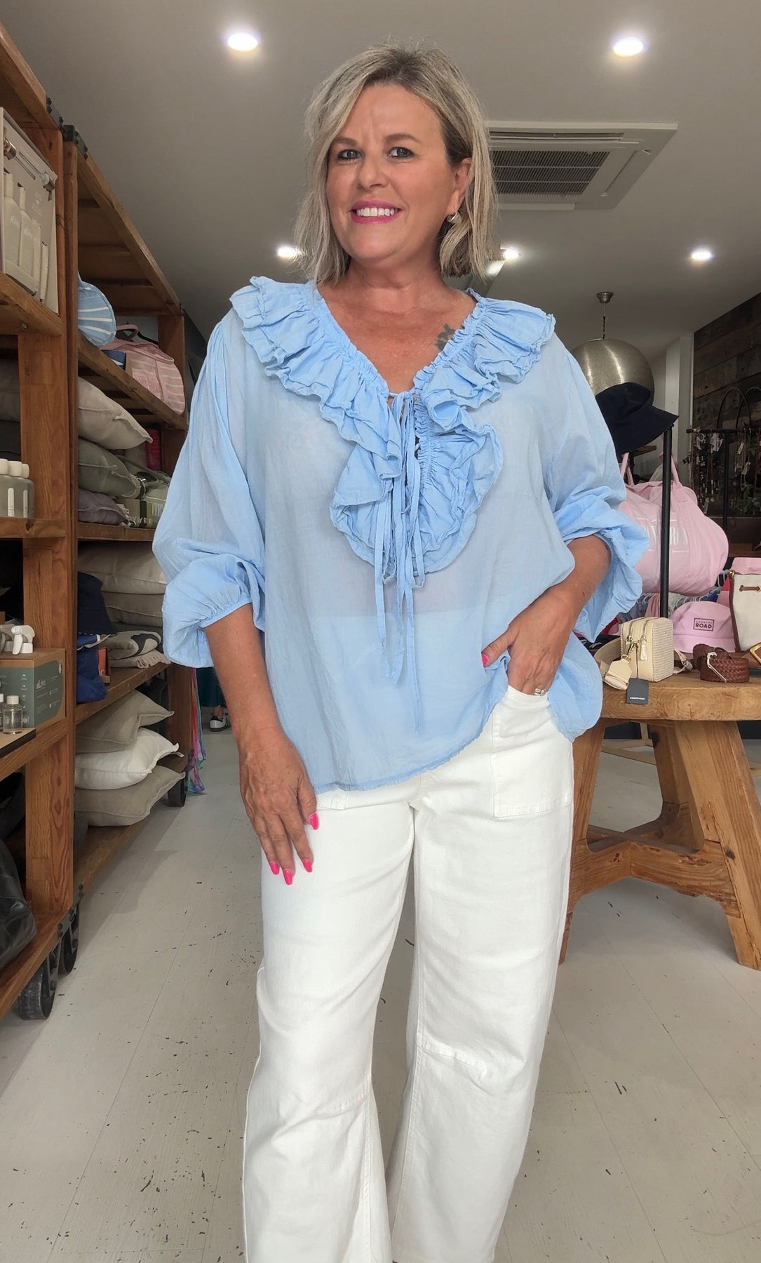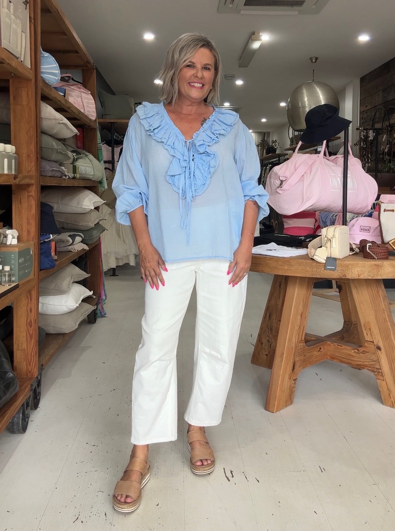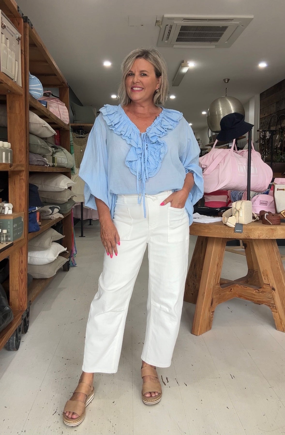 Kay is a size 10 for reference. Kay has styled the Chablis top with our Bestie Jeans.