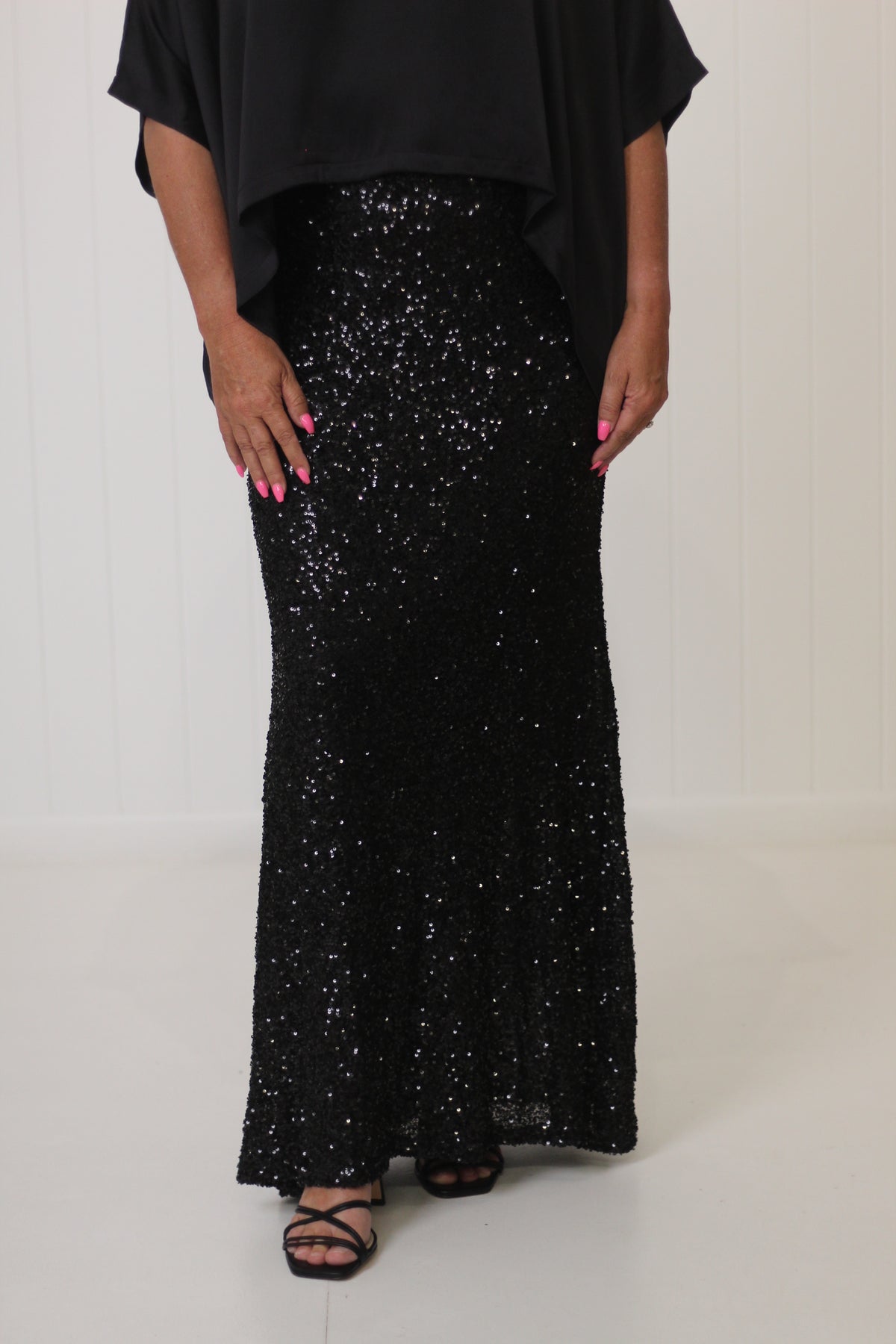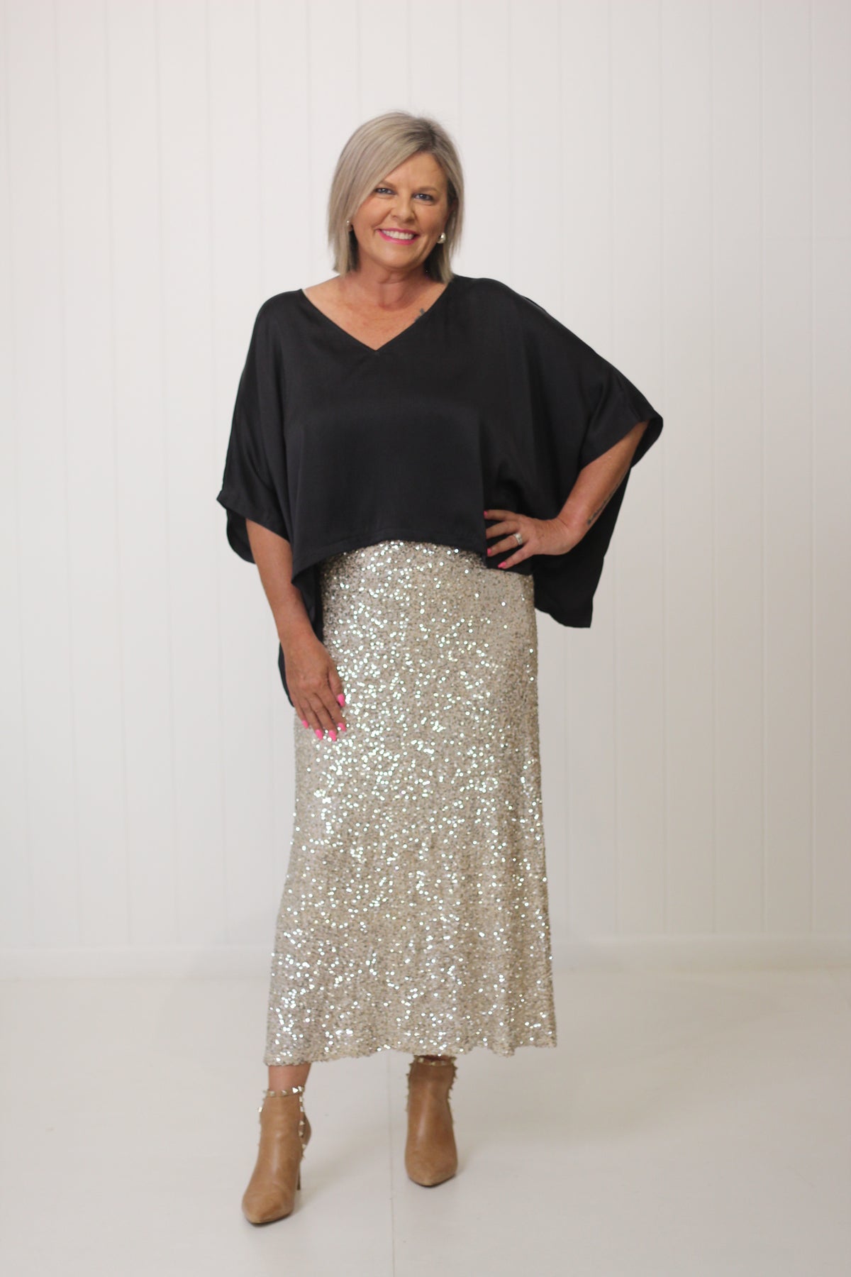 Kay is a size 10-12 and is wearing the size SM. Kay has styled the Suzie Sequin Skirt with our Mitzy Silk Top (IN STORE ONLY) and the matching Kelli Sequin Top