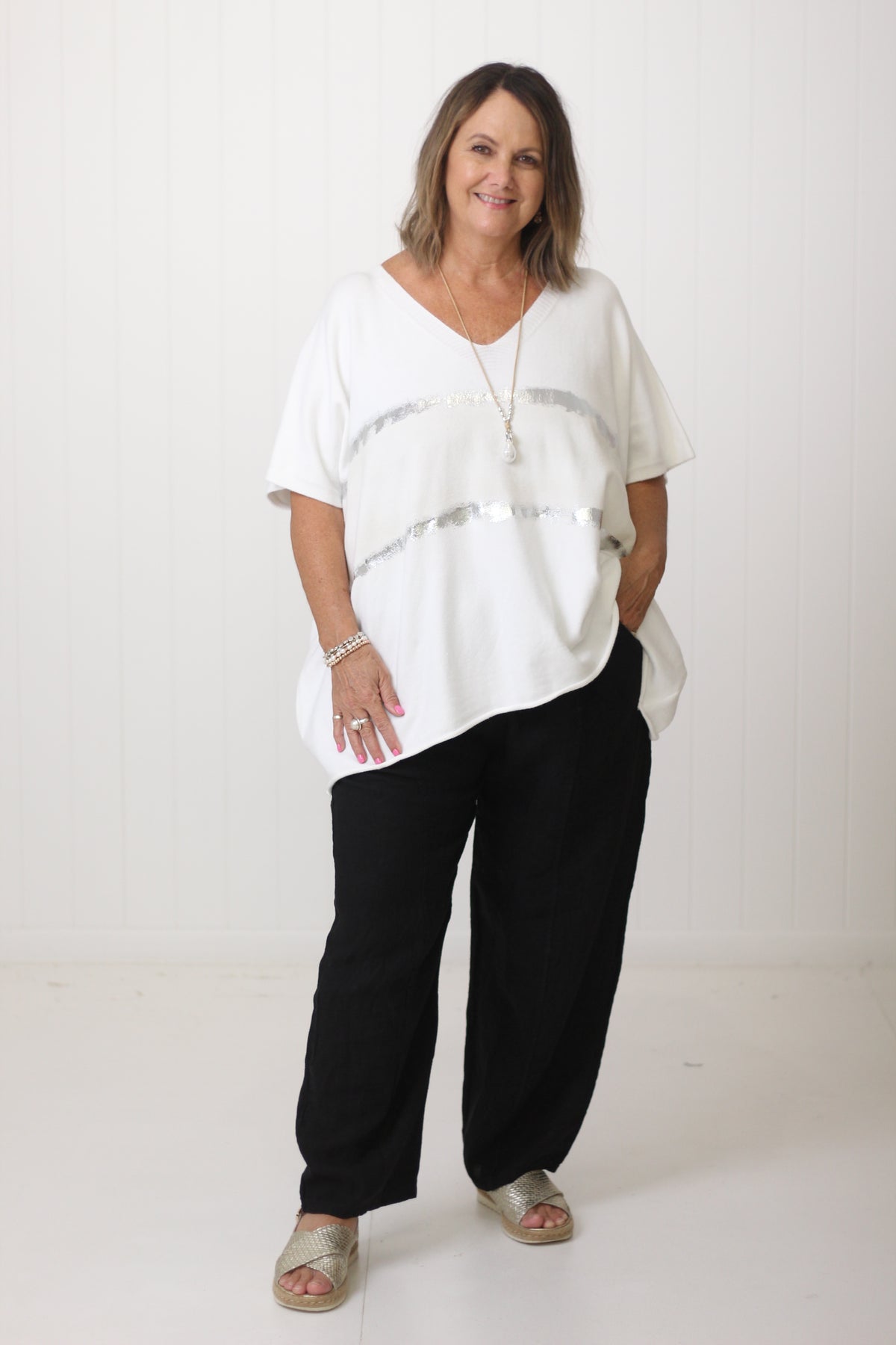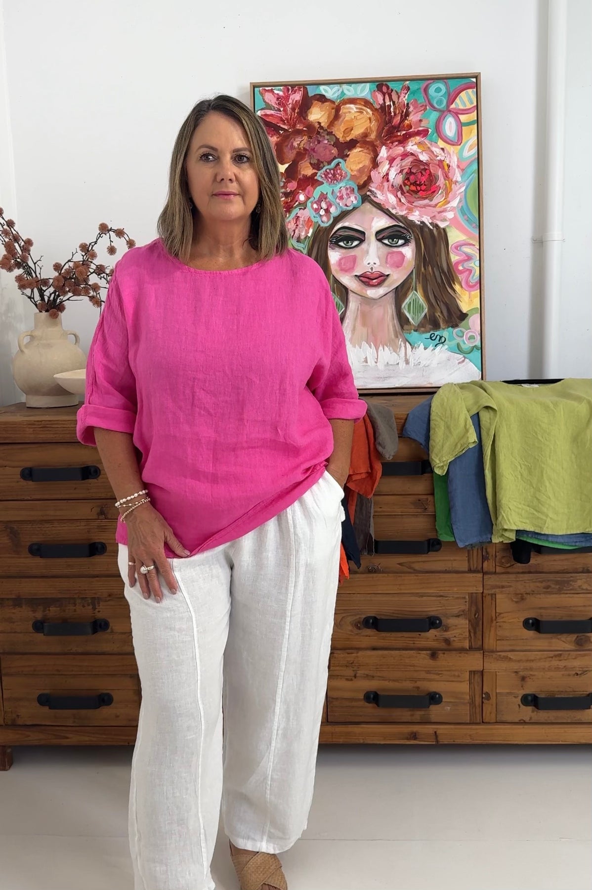 Kath is size 14 and has styled with our Greta Top White, Cris Pant White with the Greta Top Fuchsia
