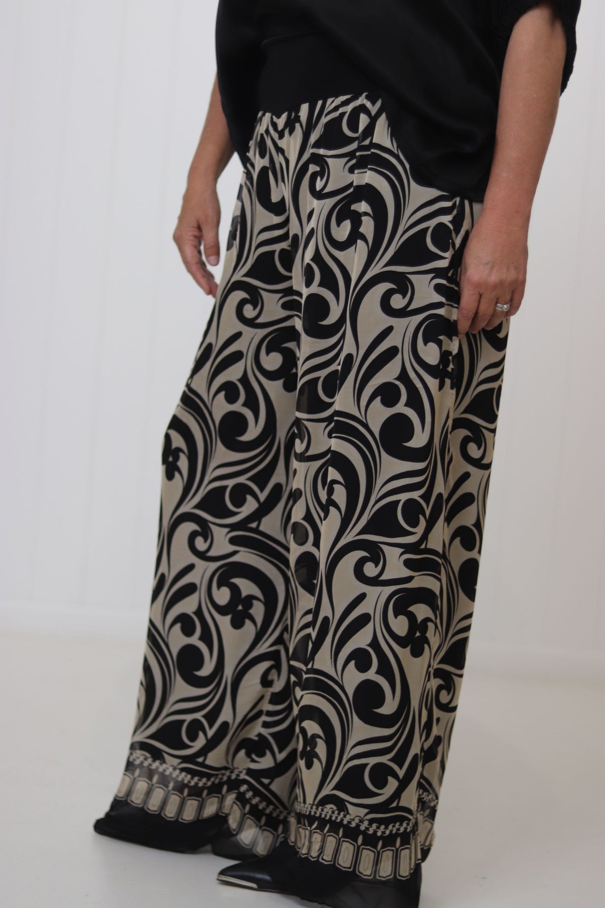 The Marlow Silk Pant, crafted in Italy from a refined linen and silk blend, displays a bold black and cream pattern bordered in black. Featuring an elastic wide waistband and fully lined legs, it provides a lightweight, sheer, and fluid fit. Pair it with the matching Marlow Silk top for a sophisticated and polished look.