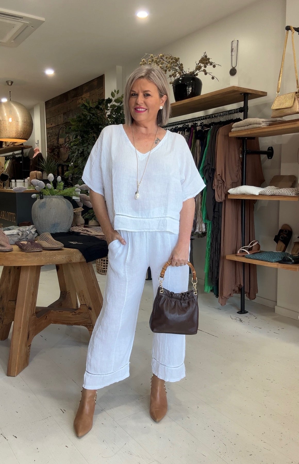 The Nicki Pant is crafted from lovely soft linen for a flawless shape and comfortable crop length. Its unique feature insert adds a subtle design twist, while functional side pockets enhance everyday practicality.