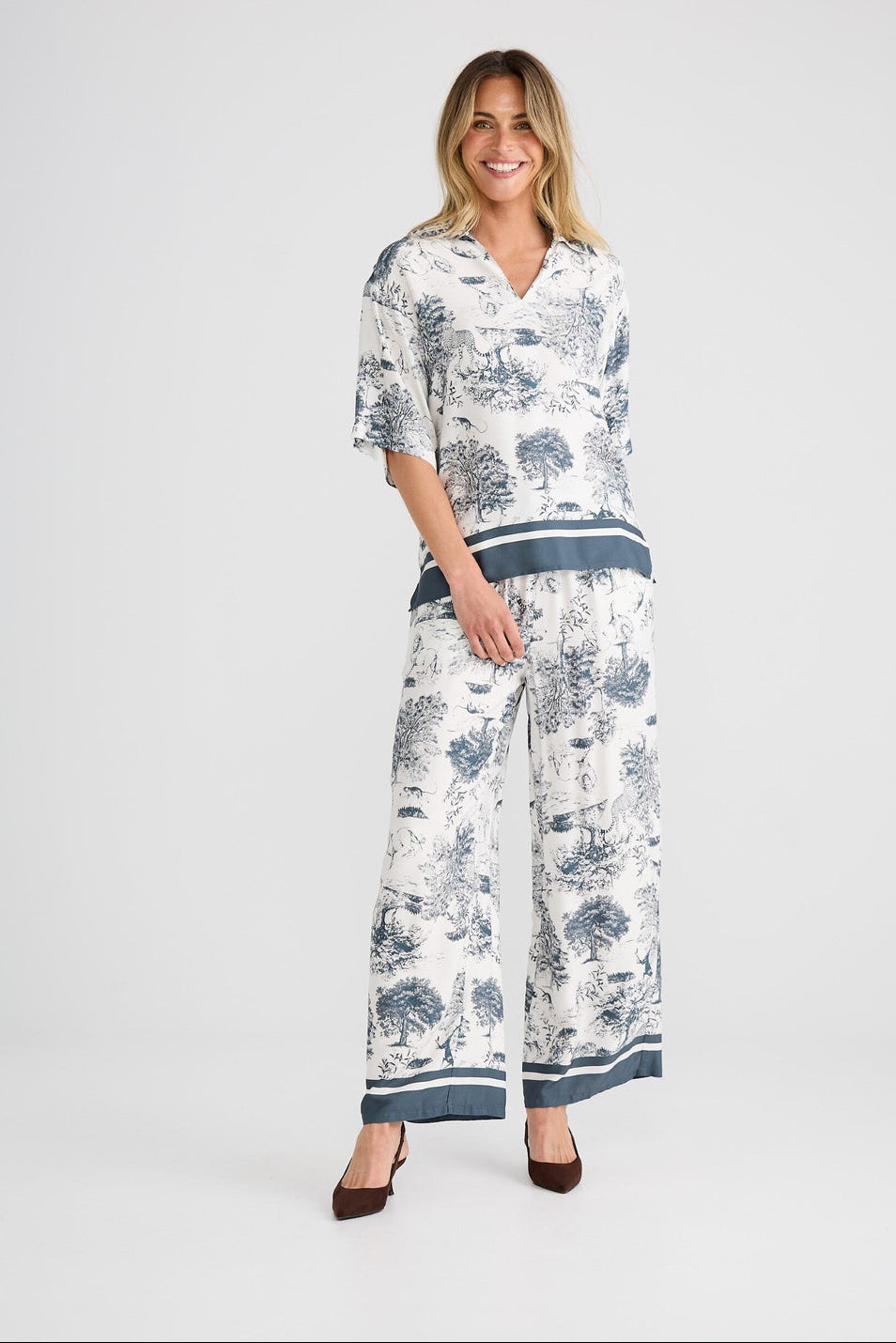 The gorgeous Keera shirt features the most divine print with a contrast border and creates a stunning set with the matching Glenda pant or wear as separtates with your fave denim jeans!
