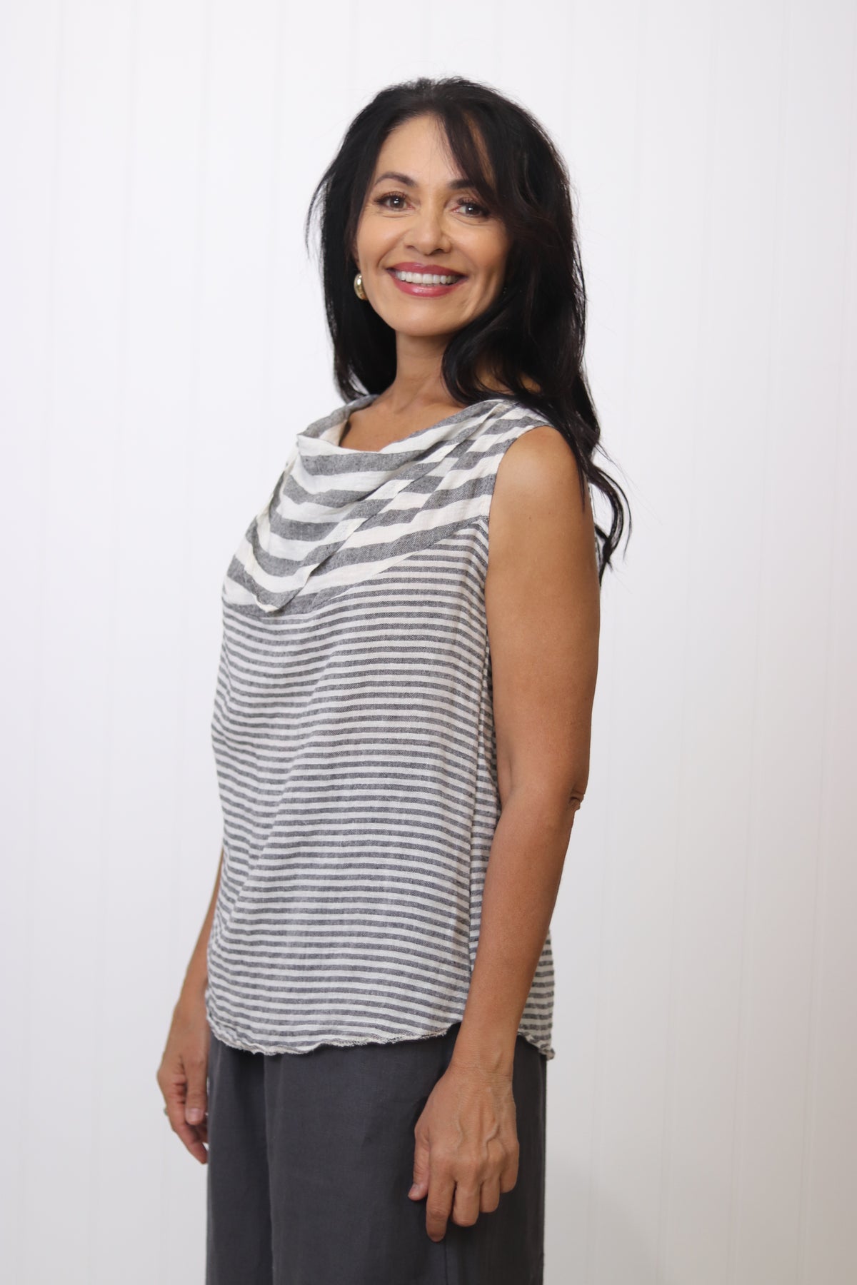 Redefine your look with the Catania Cowl Top. This lightweight linen blend top features a chic cowl neck and an interplay of bold and thin stripes for a modern and flattering look. Stand out from the crowd with its unique design and add visual interest to your wardrobe.