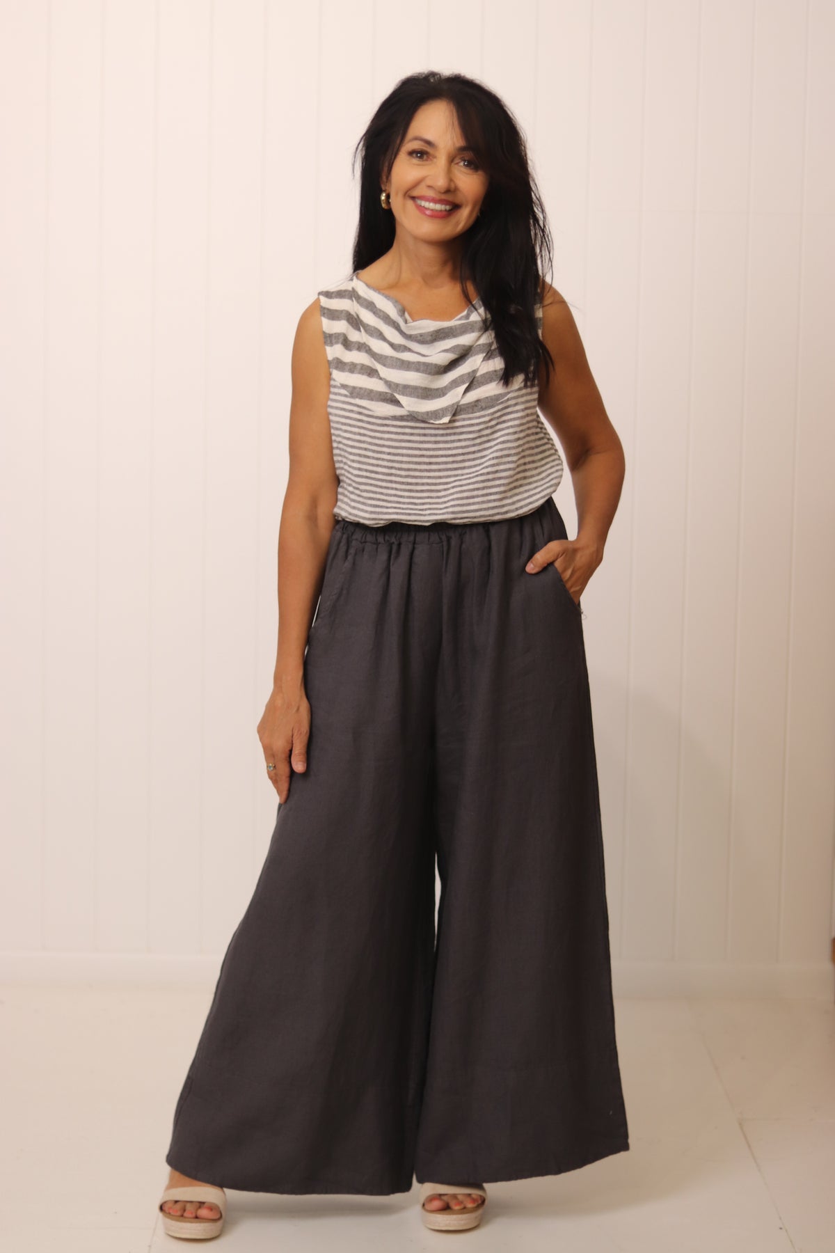 Drina is a size 8 and is wearing the XS. Drina has styled the Catania Cowl Top with the Taya Pant.