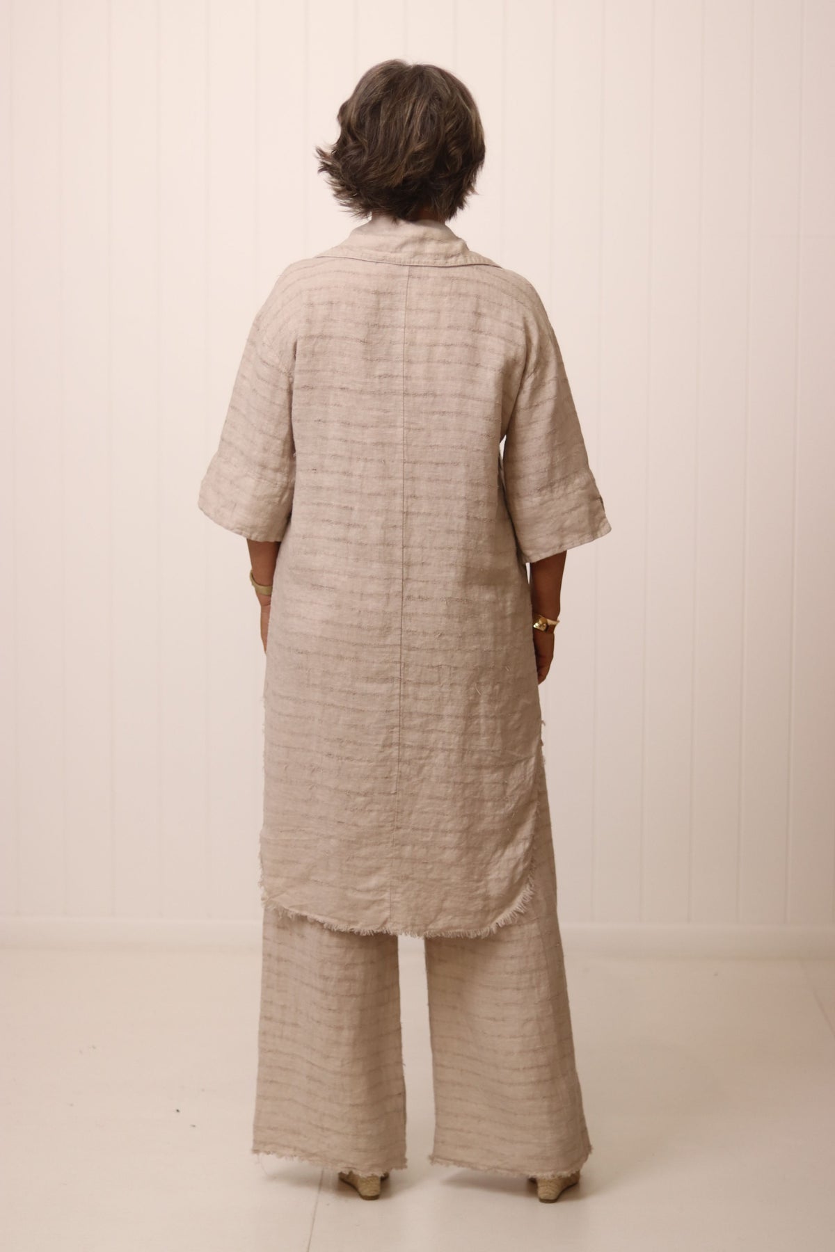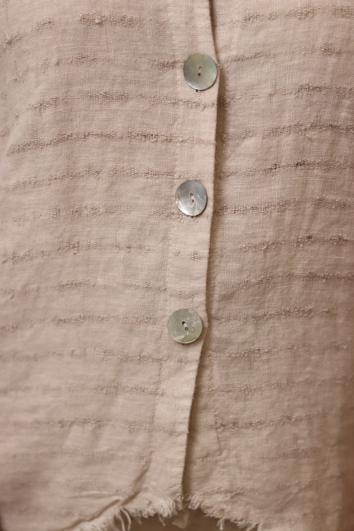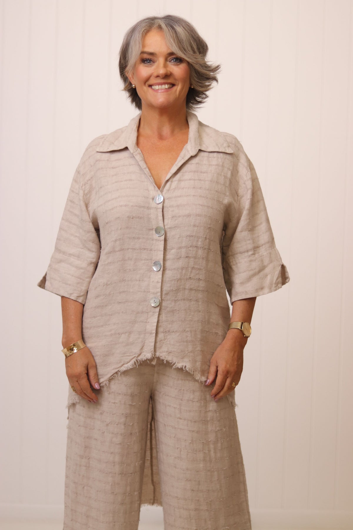 The Val Top offers unique design details. Featuring a classic collared neckline and button closure, it offers a polished yet relaxed look. The subtle stripe weave and distressed edging add texture and character, while the wide hemmed mid-length sleeves with small split details enhance its stylish appeal. Designed with a flattering high-low hem, the Val Top provides the perfect balance of comfort and versatility.