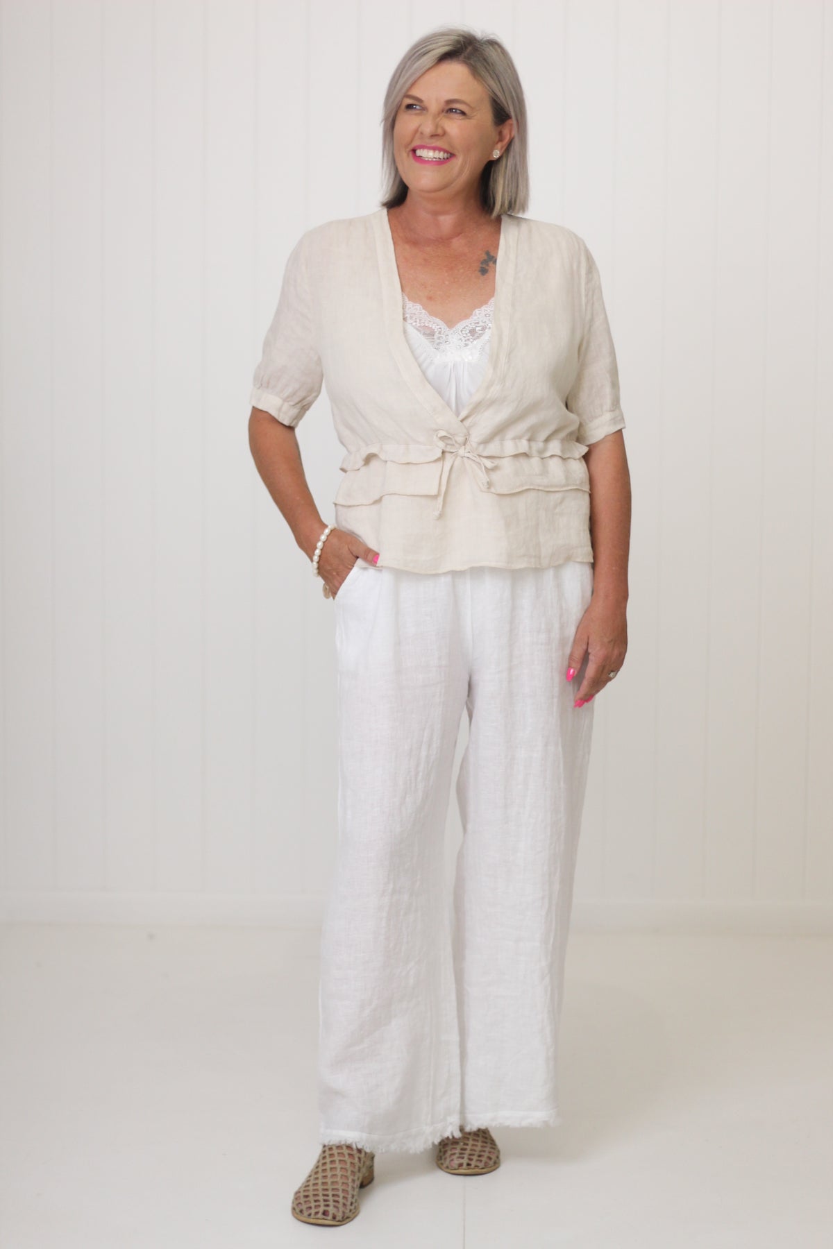 This Linen Drawstring Top is made from 100% linen, giving it a lightweight and breathable feel. The deep V-neckline and drawstring waist tie add a flattering touch, while the frill detailing and mid length sleeves add a cute and stylish element. Stay cool and comfortable in this beautiful one size piece.