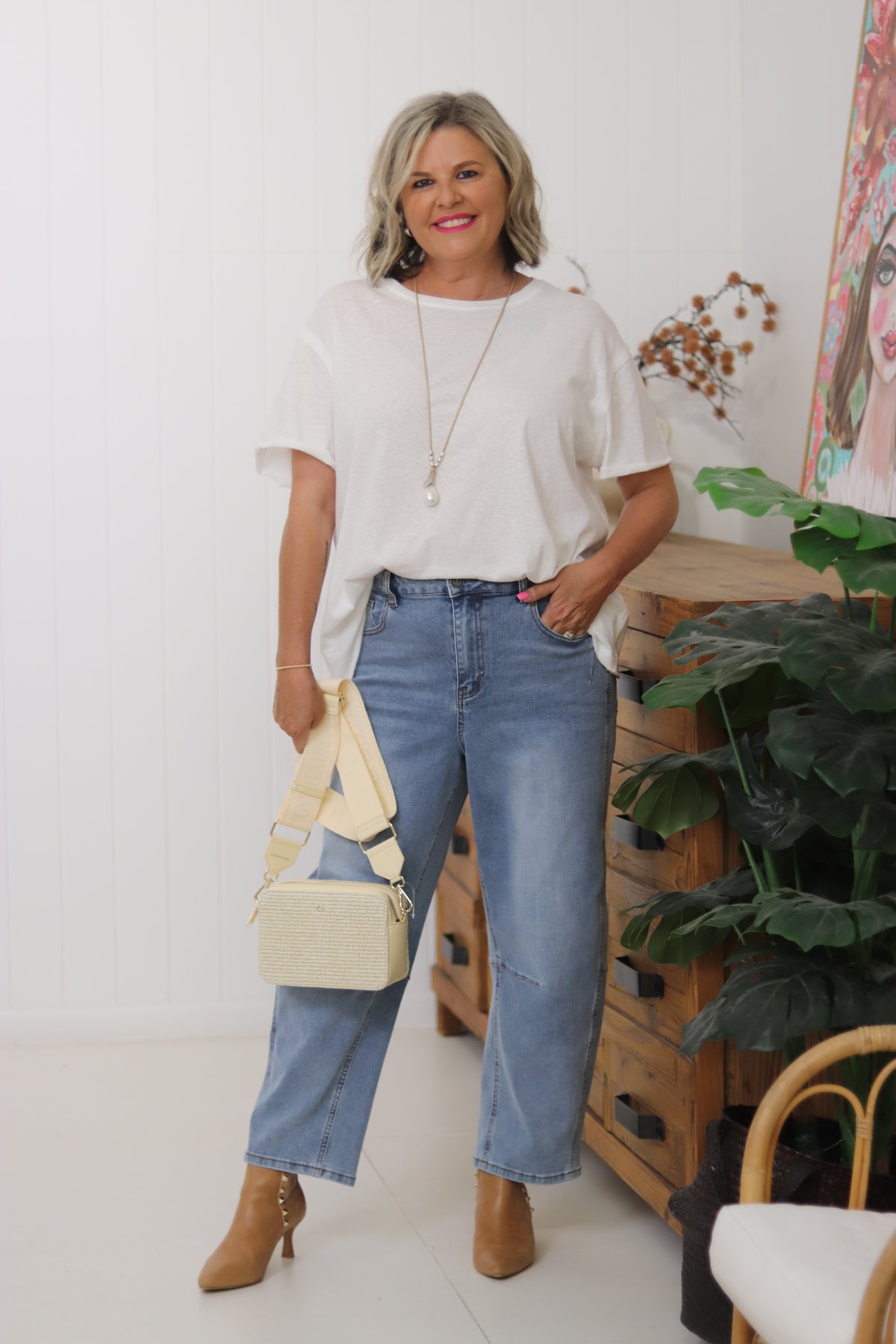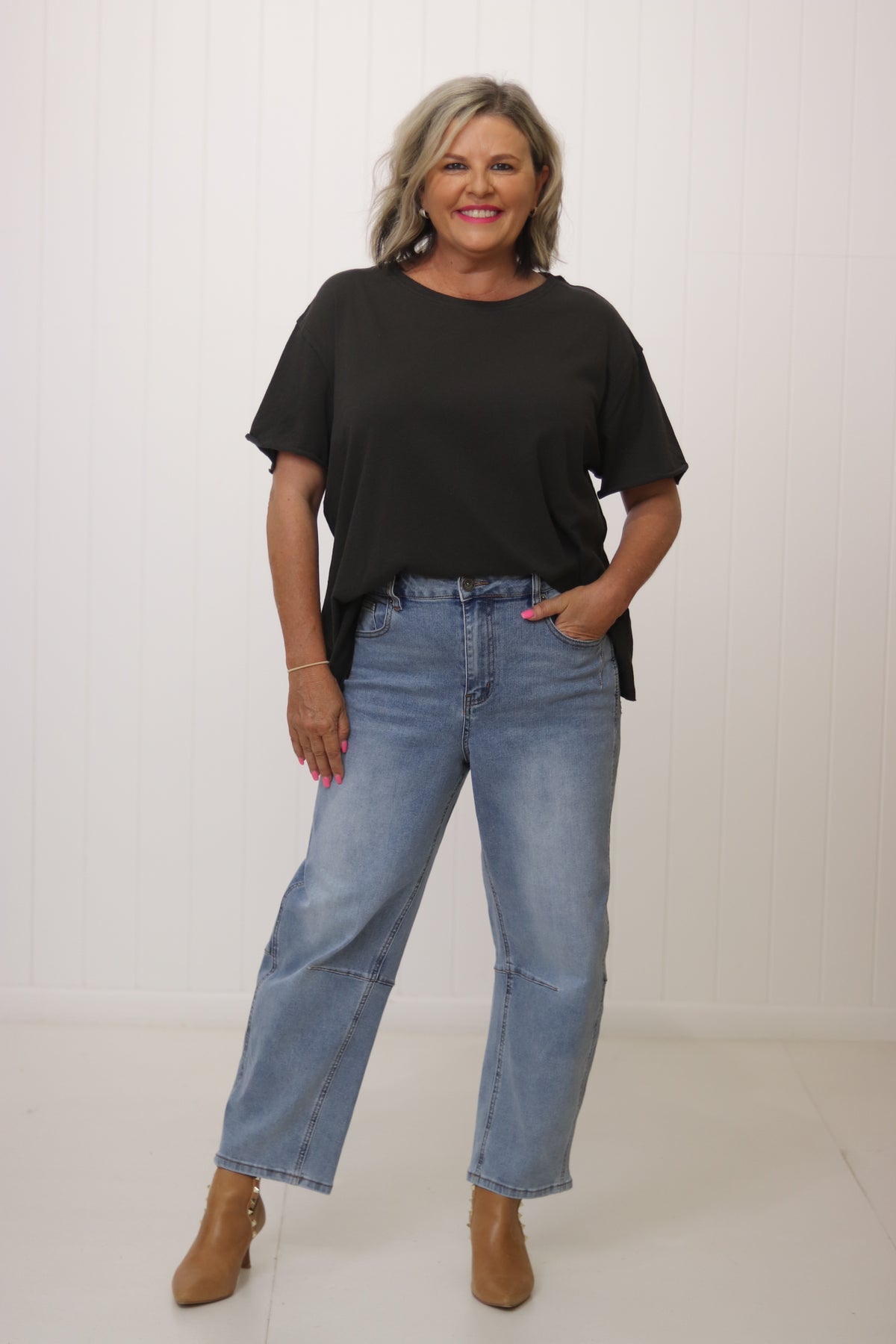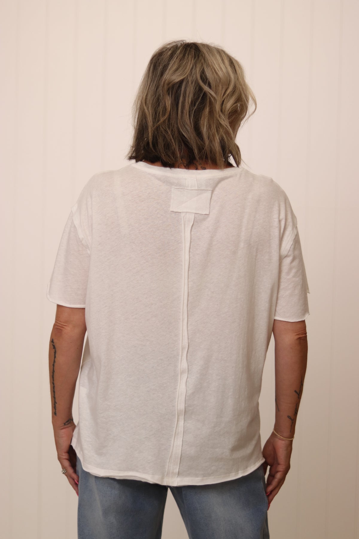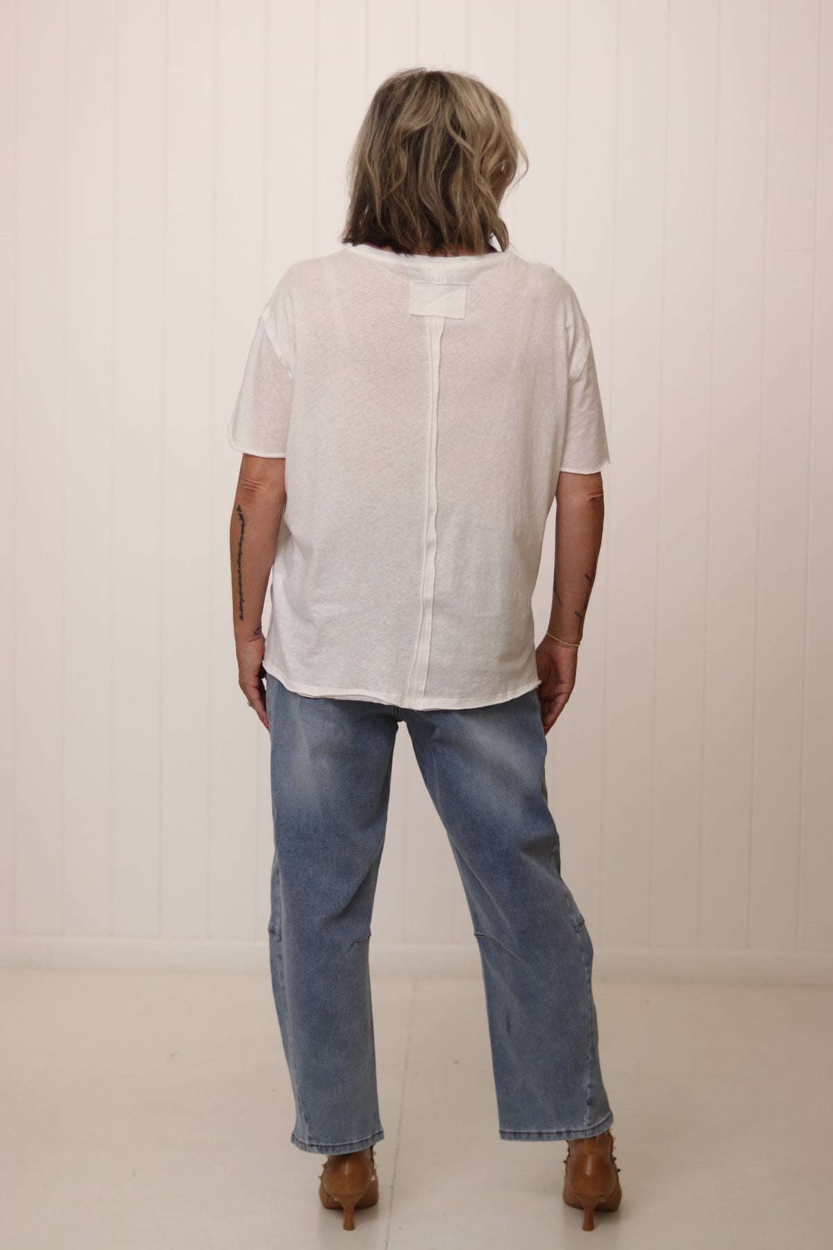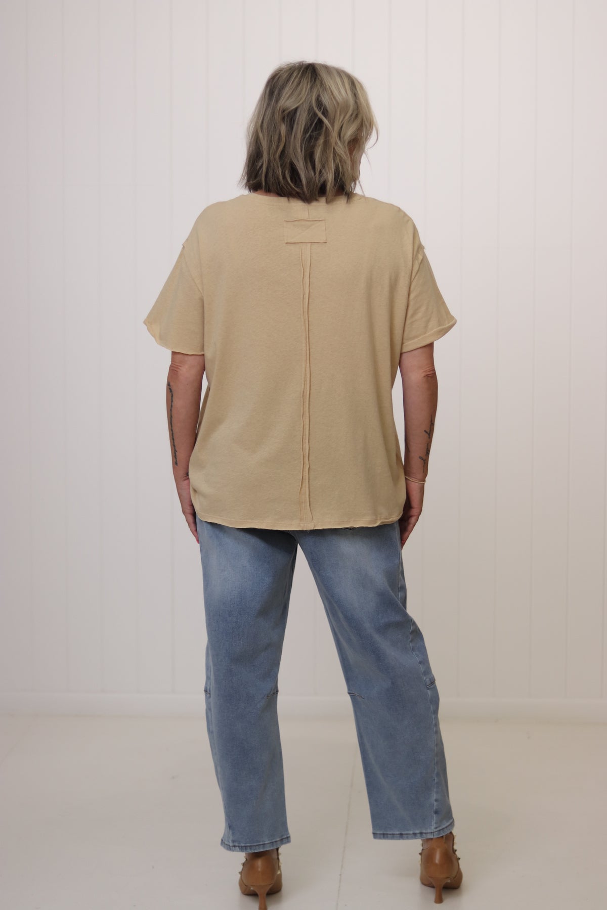 The Charlotte Tee has everything we love about a wardrobe staple. She is super soft already with a lived in feel. The flattering boxy shape making her perfect to wear out or tucked. She is perfect teamed with shorts , jeans or your fave linen pants for effortless casual or add a long sparkly necklace and silk pants for drinks and dinner!