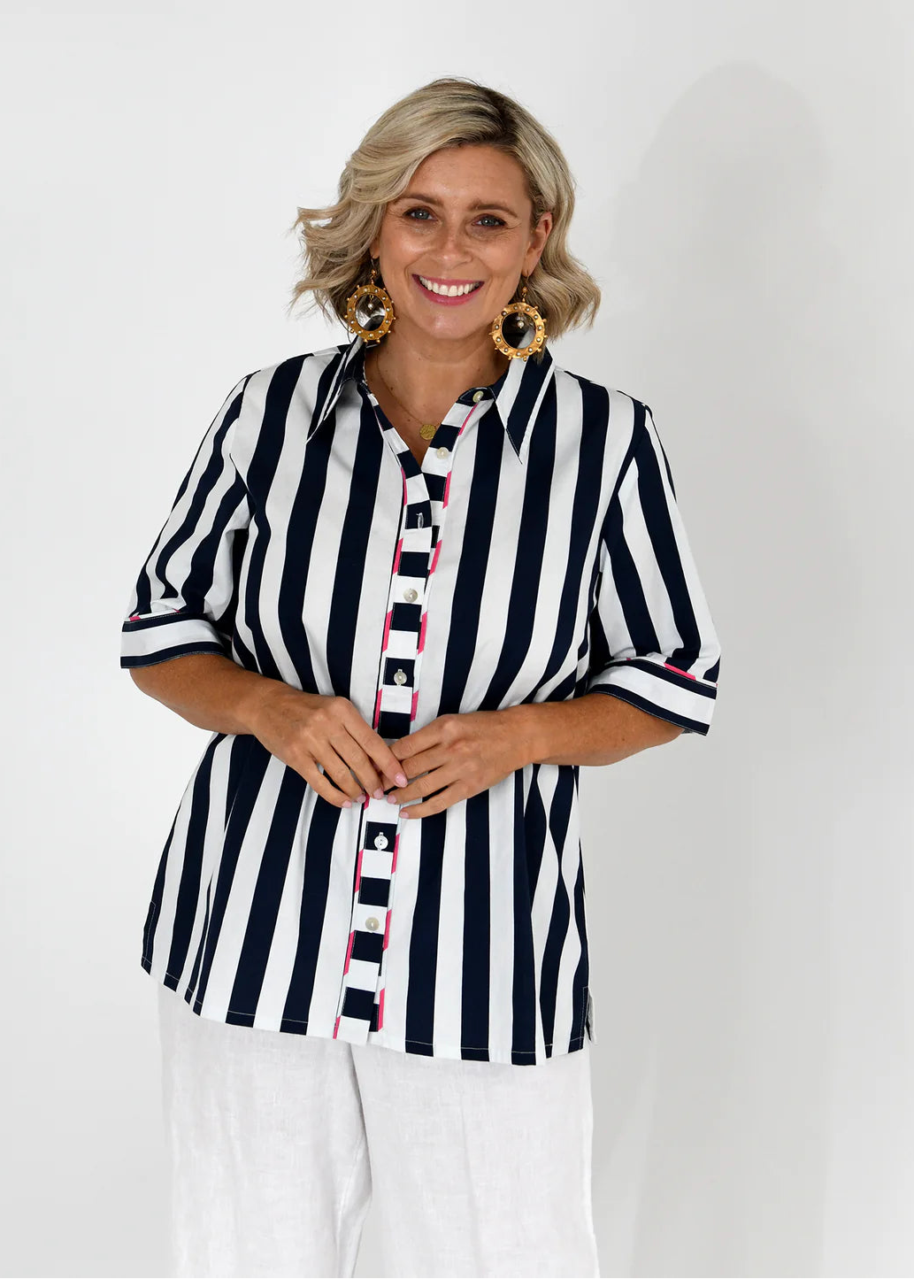 With a crisp button-down front, short sleeves accented by bold pink trim, and a flattering comfortable fit, this shirt radiates timeless elegance.