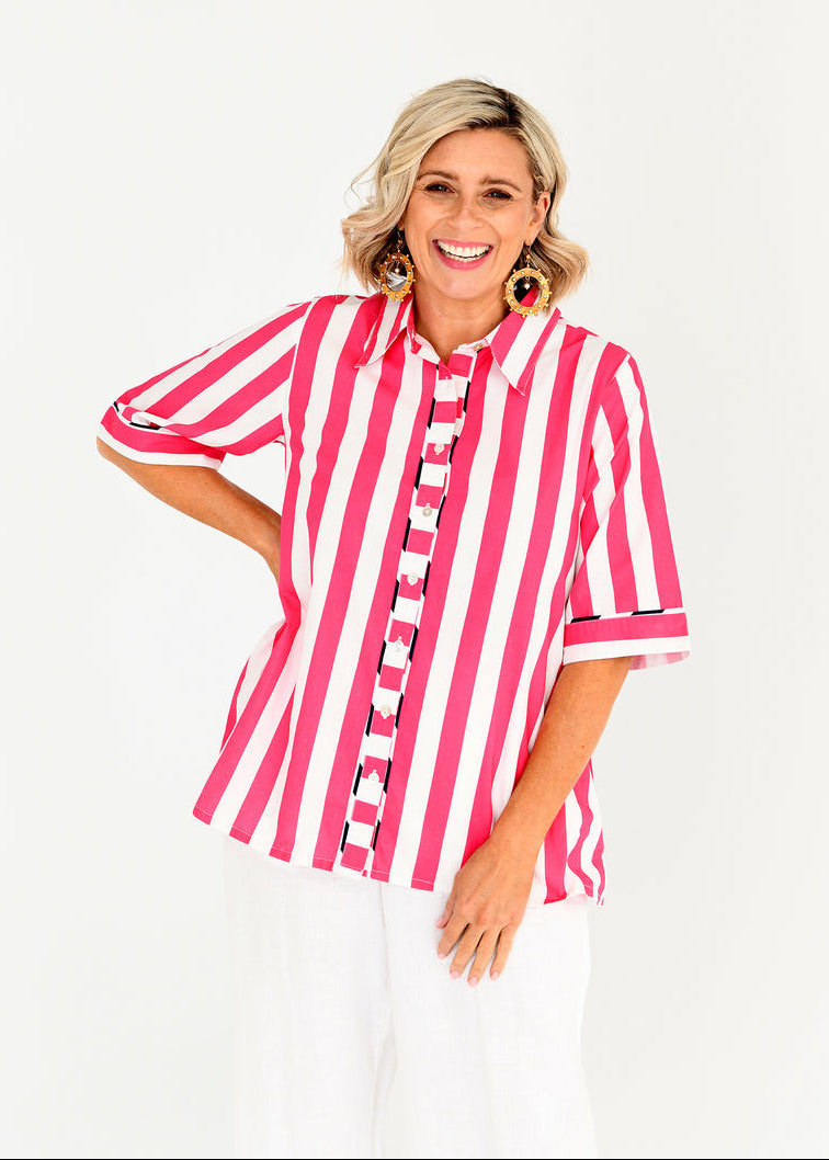 The Rosa Shirt, crafted from luxurious cambric fabric which feels soft against the skin and drapes elegantly, is perfect for all-day wear, redefining casual elegance with its vibrant pink and white striped design.