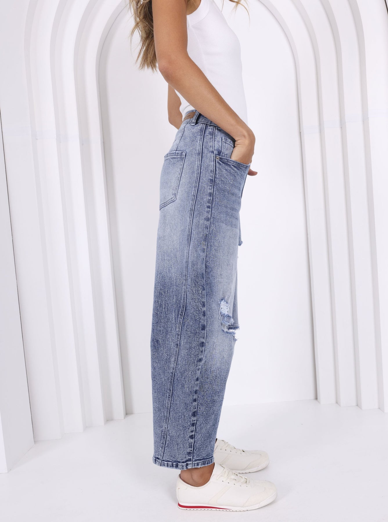 Relaxed, easy, and just the right amount of cool, the Theo Barrel Jean brings modern denim comfort to everyday dressing. Cut in a light blue wash with soft fading and gentle distressing, this style features a relaxed barrel leg that tapers at the ankle for a flattering laid-back shape. Designed to sit mid to high rise on the waist, it’s the perfect weekend jean that moves with you through errands, coffee runs and long travel days.