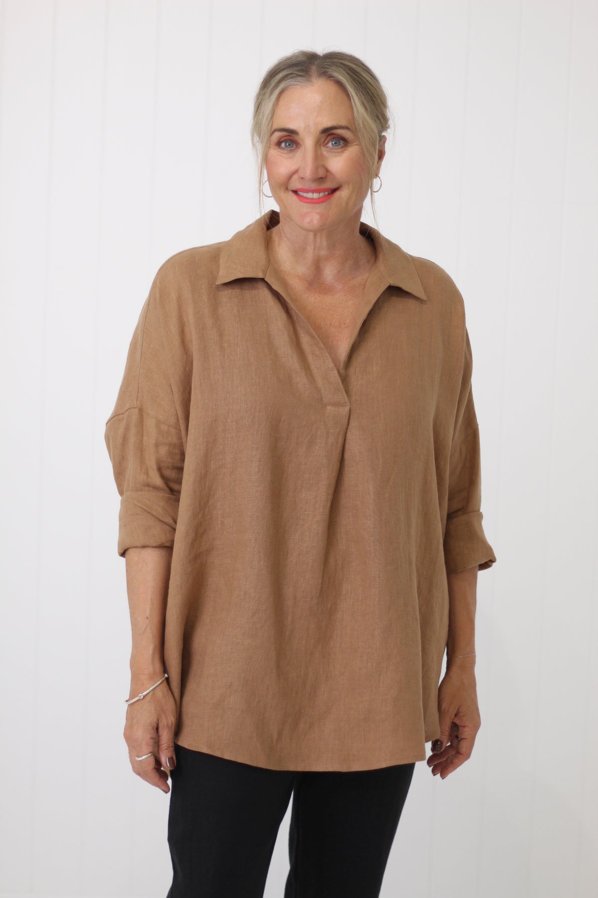 Discover the Janeese Top, a luxurious linen blouse with a unique and stylish collared neckline. Made in Australia as part of the bestselling Pearce range, it offers a sophisticated yet relaxed look. A generous one size fit that runs up to size 20, adjustable sleeve length the Janeese Top offers versatility and style for any occasion. Style with the JP Pant, Pearce Pant or your Fave Jeans and Joggers.