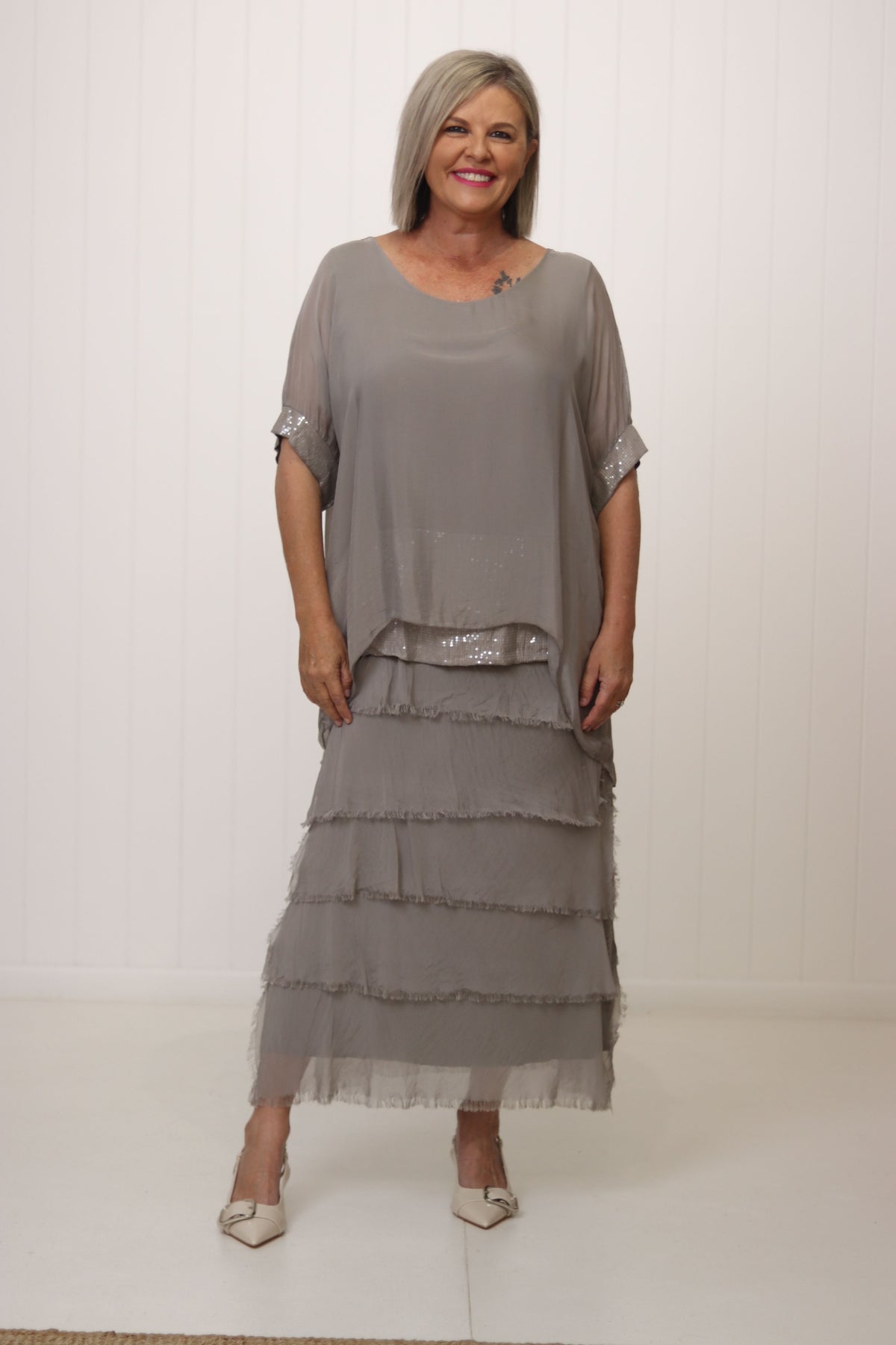 The Anya Dress boasts features a round neckline, sheer short sleeves, and a tiered, flowy sheer silk overlay. With a maxi length and singlet shape, this dress is both stylish and comfortable. A gorgeous dress for a special occasion and with that little bit of added sparkle ✨