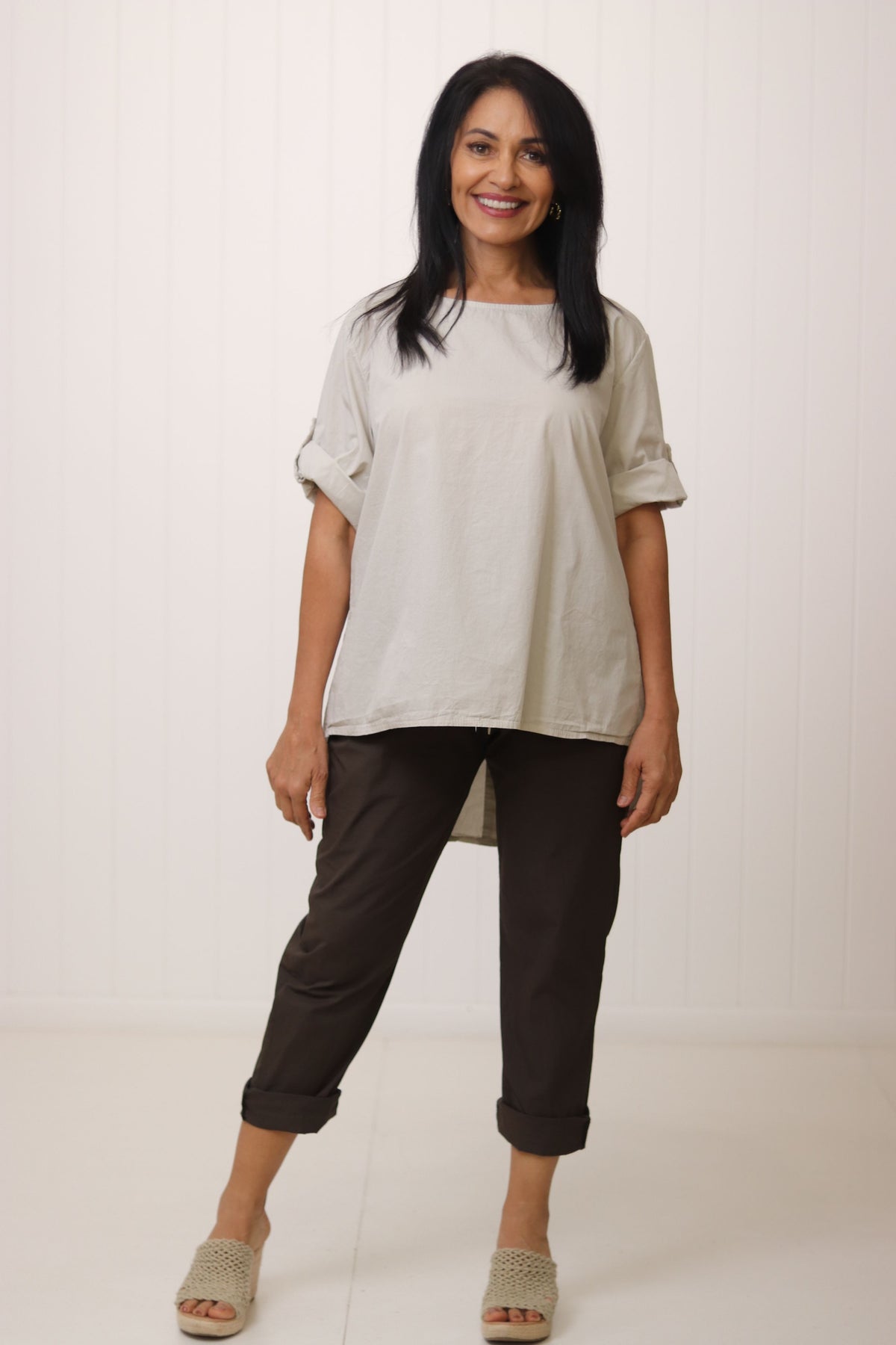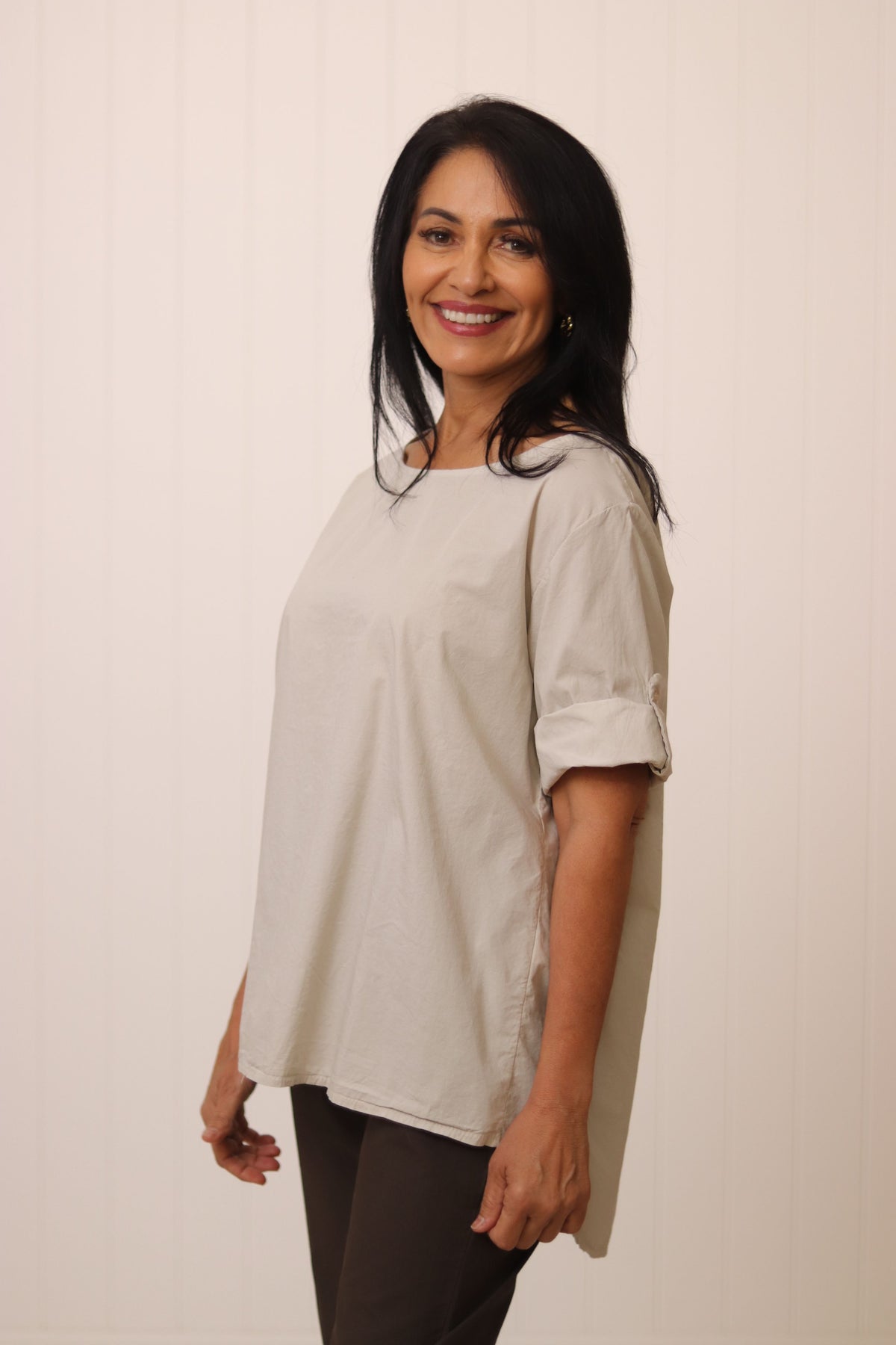The Aurora Button Detail Top features a lightweight cotton fabric for breathable comfort. Its rounded neckline and versatile sleeves can be worn extended or rolled up and secured with a button, offering adaptable styling. Designed with a modern silhouette, the hem is longer at the back and shorter at the front, complemented by distinctive button-up detailing on the back for a refined finish. This top combines effortless wearability with subtle design elements ideal for a polished, expert look.