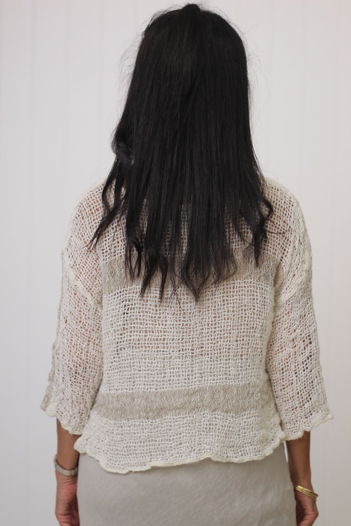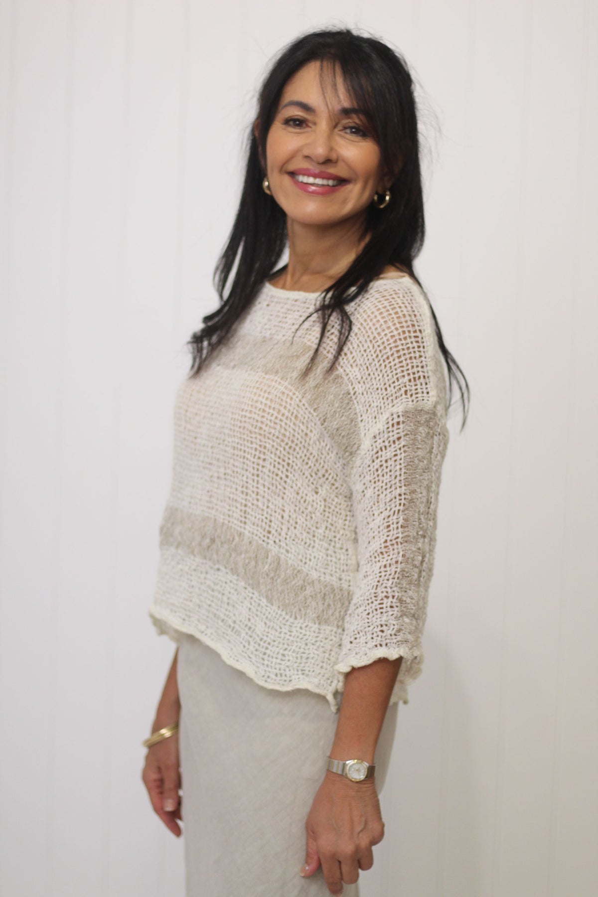 The Box Top Sleeved Canapa Natural Stripe Top is made from a 100% linen fabric with a standout textured weave, providing a breathable and stylish piece. The stripe design adds a touch of sophistication, while the longer sleeve and round neckline offer both comfort and versatility. This crop top will transform any outfit, it's simply stunning!