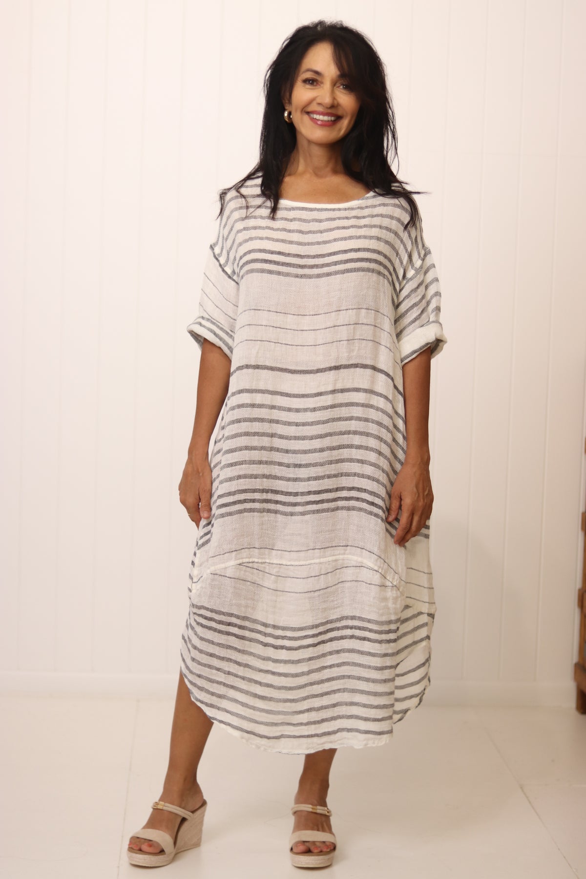 Indulge in the luxurious feel of Italian linen with the Camille Dress. This versatile piece features a refreshing tulip silhouette in soft grey tones. The relaxed fit through the midsection and lightly paneled detailing provide subtle shaping, while the rolled sleeves and round neck add casual charm. Perfect for year-round wear.