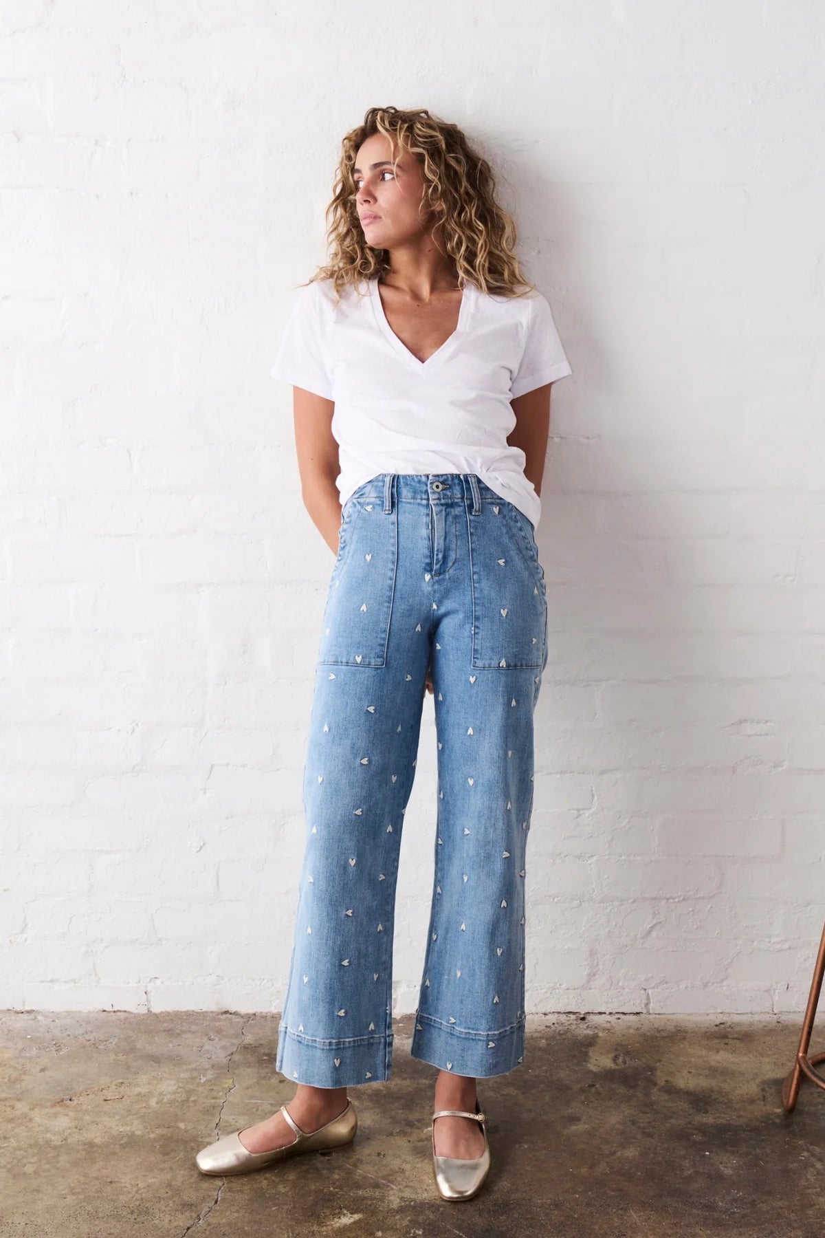 We've added a little bit more love to our super comfortable denim utility pant with an embroidered heart detail. The Celeste Pant | Heart features utility-style pockets, a fuller straight leg with a slight flare and the perfect length that looks great showing off some ankle on a taller girl or sitting on the shoe for someone more petite.