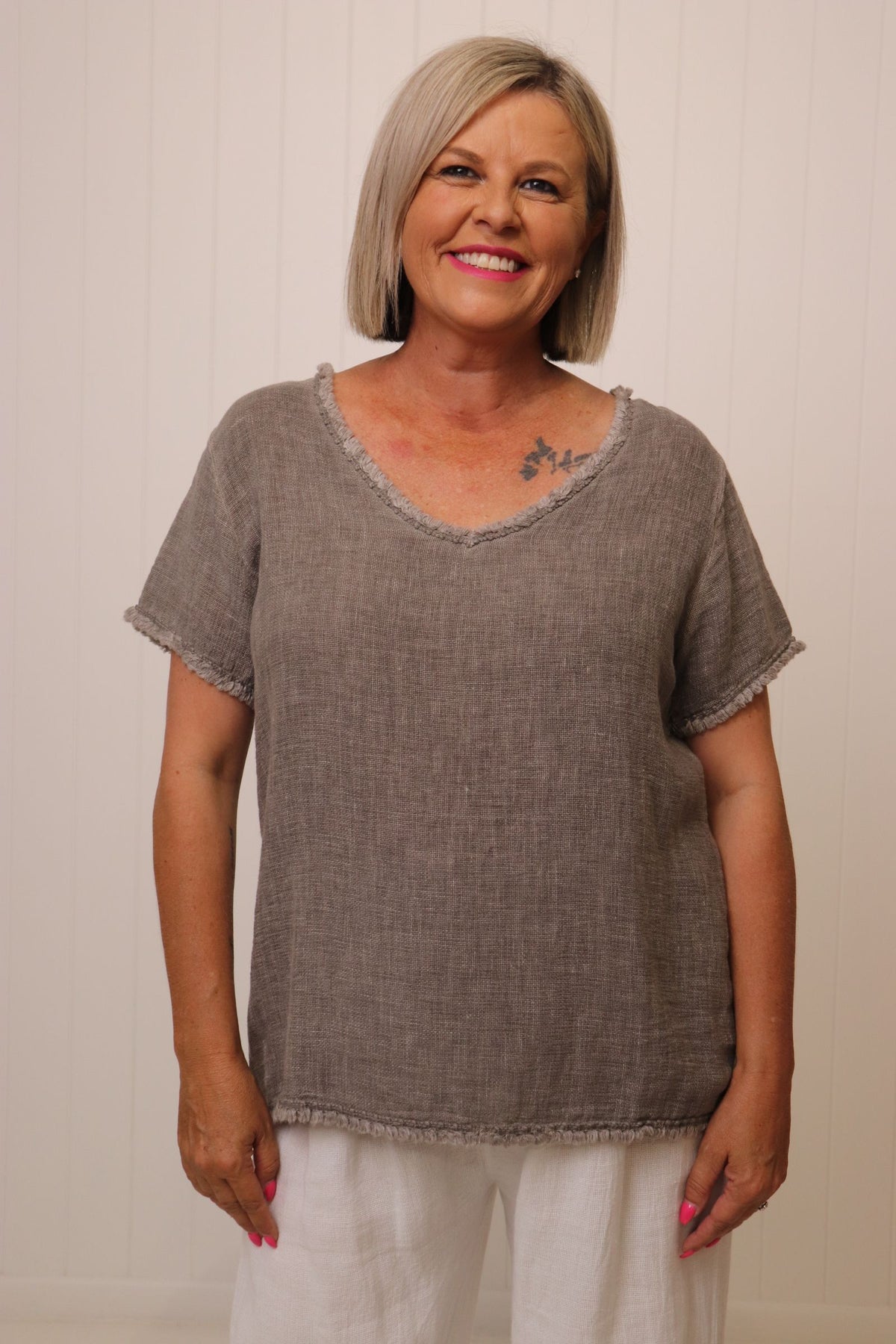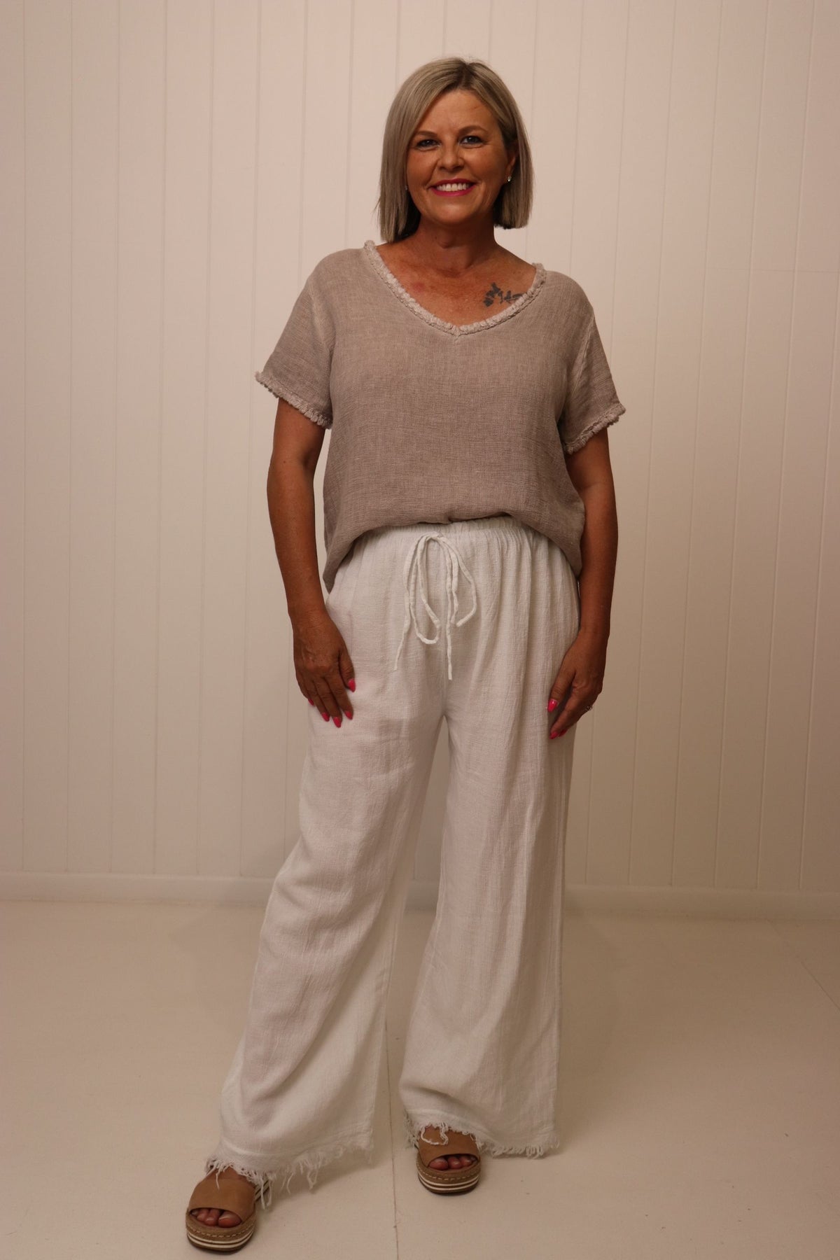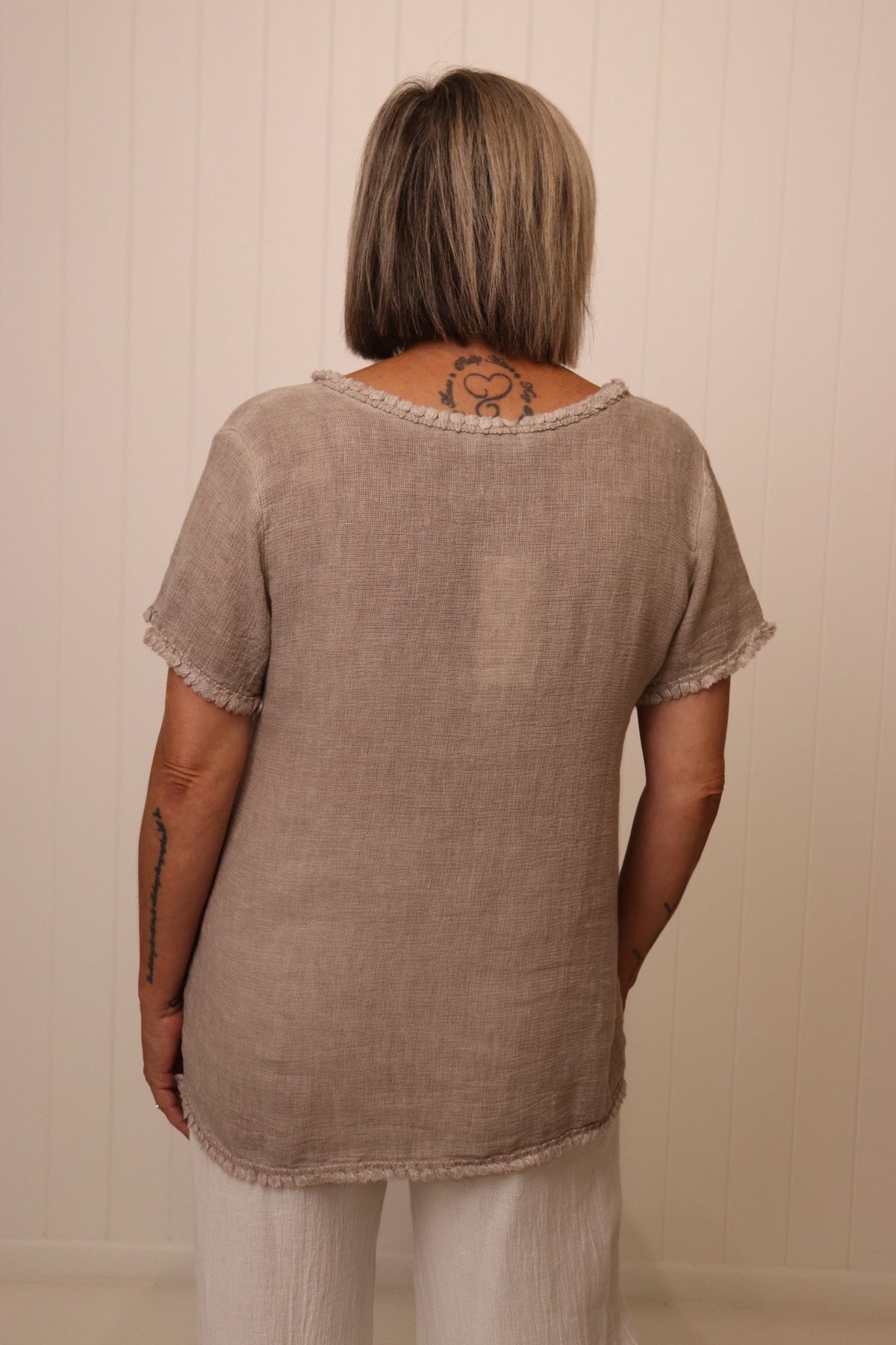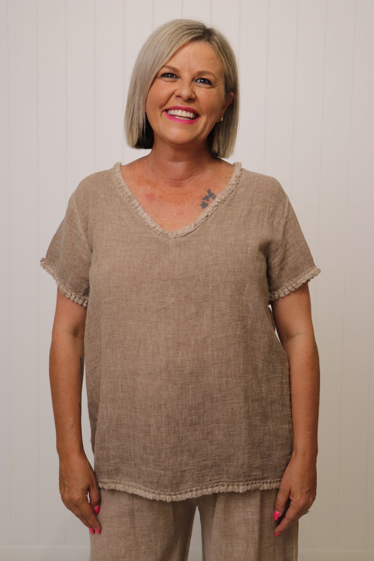 The Chloe Top is a perfect blend of practicality and effortless style. Made in Italy from a linen and cotton blend, it offers a lightweight, breathable feel. Featuring a soft V-neckline and delicate fringe detailing along the neckline, sleeves, and hemline, this top adds a touch of unique charm to any outfit. Designed in a versatile one-size fit, it comfortably suits sizes 8-14.