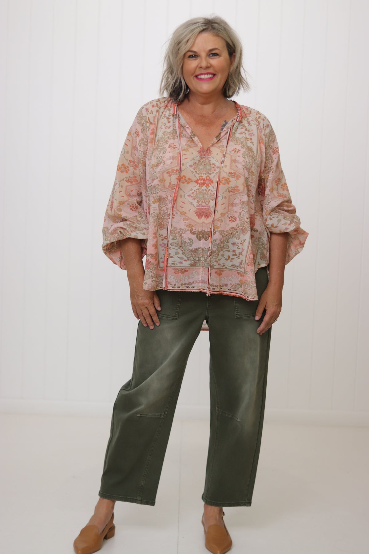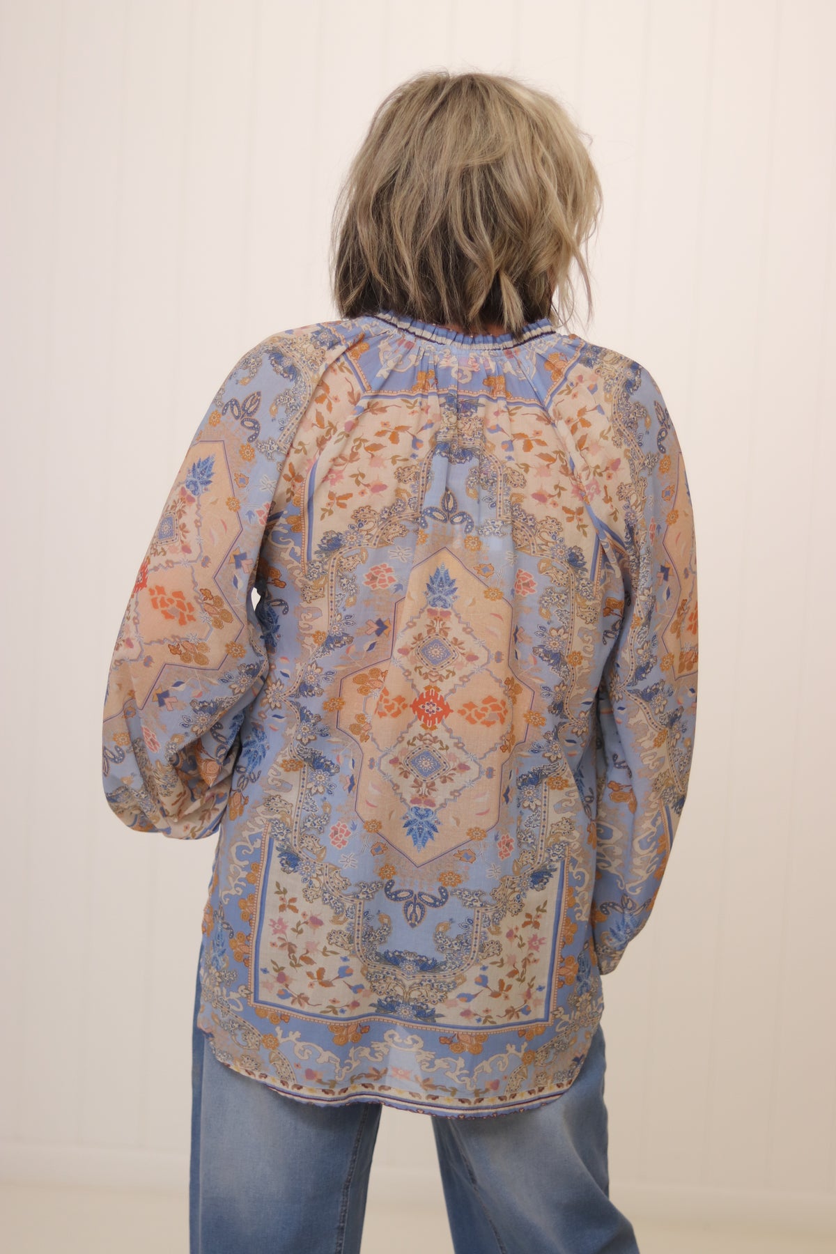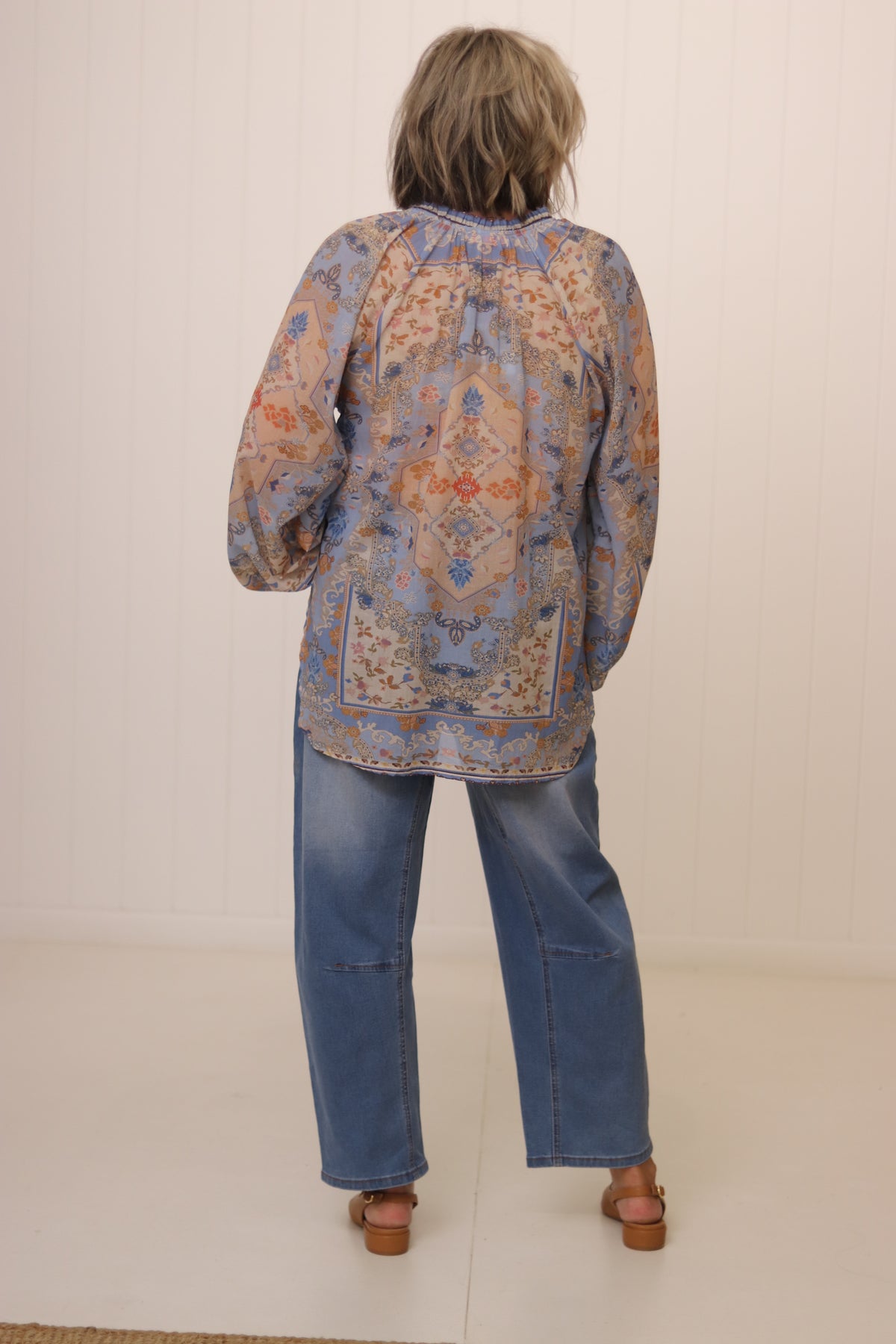 The Emily shirt is a gorgeous soft & floaty shape that features feminine balloon sleeves with stunning positioned prints. The delicate gathers around the neckline add another sweet touch!