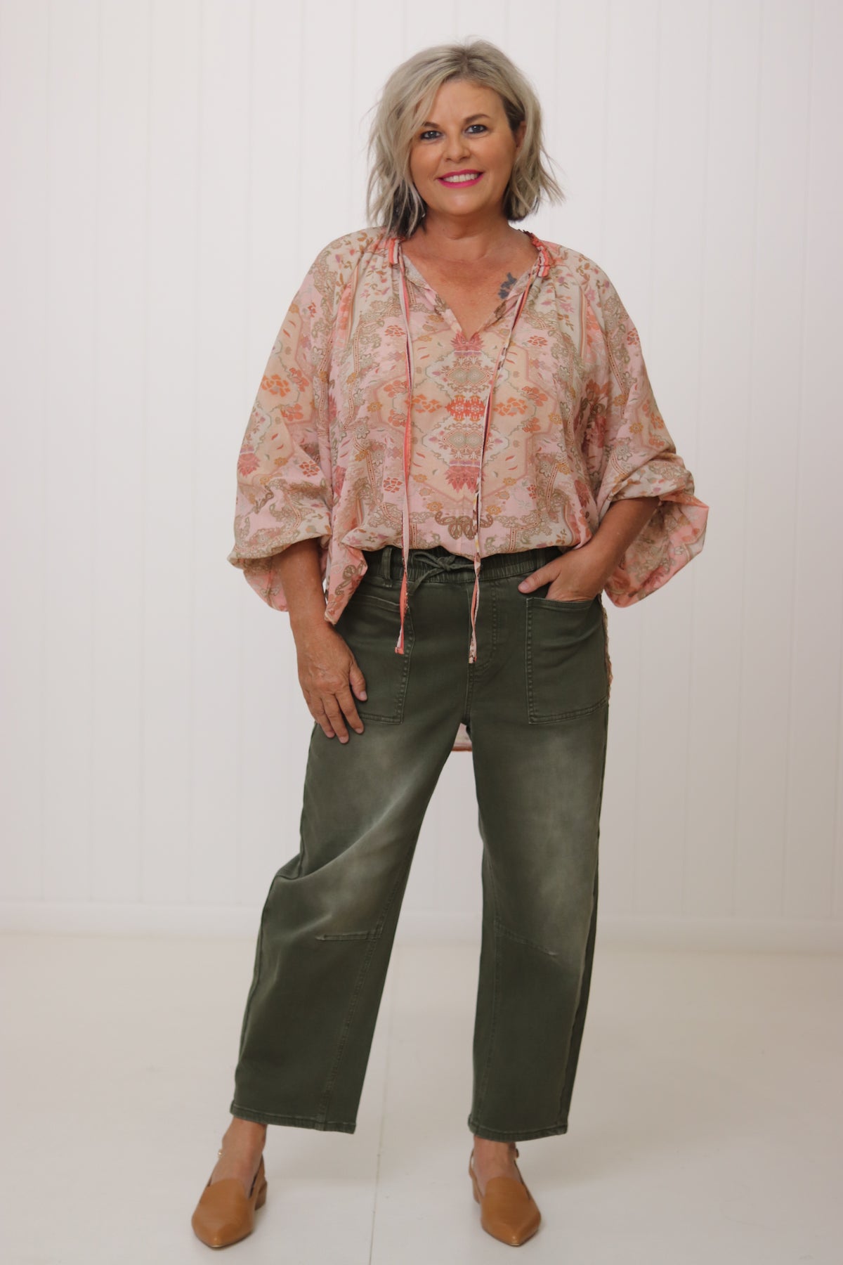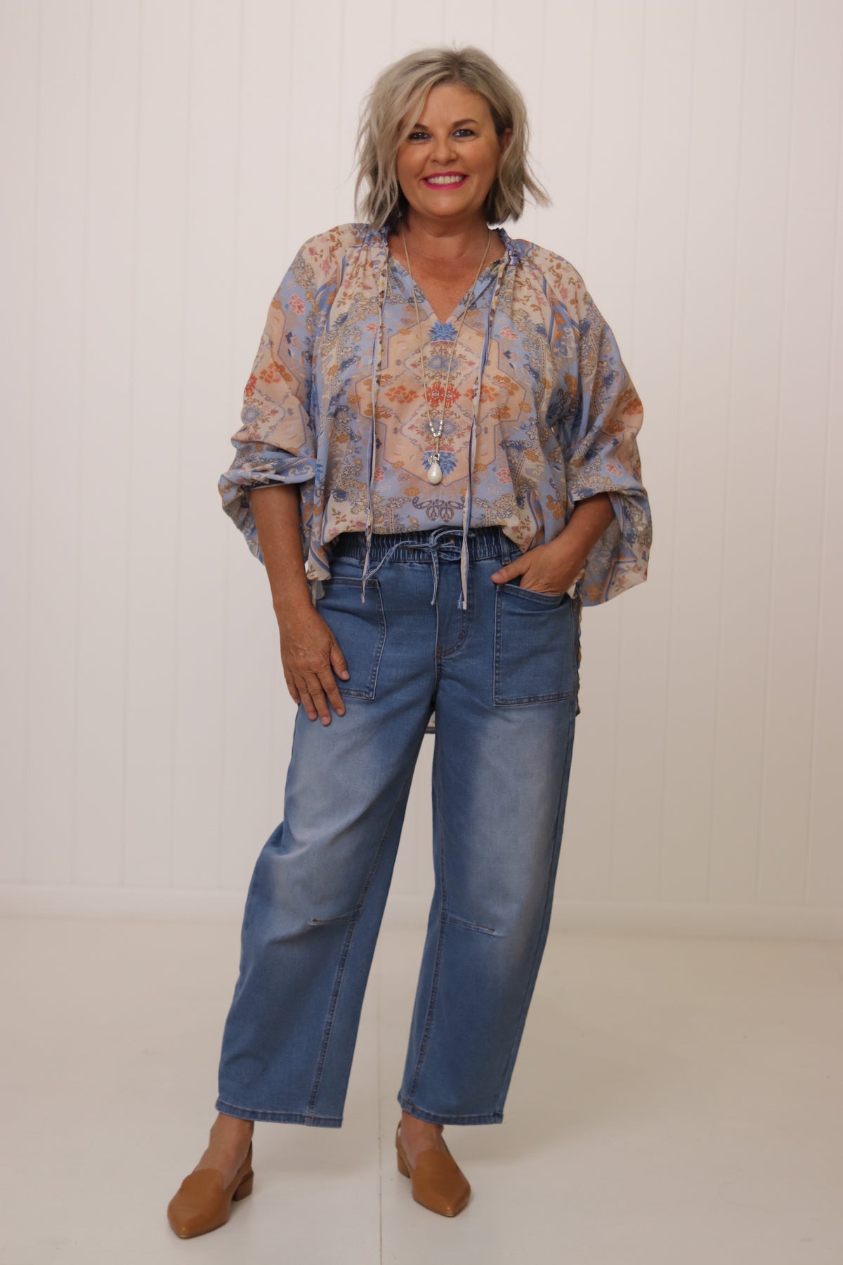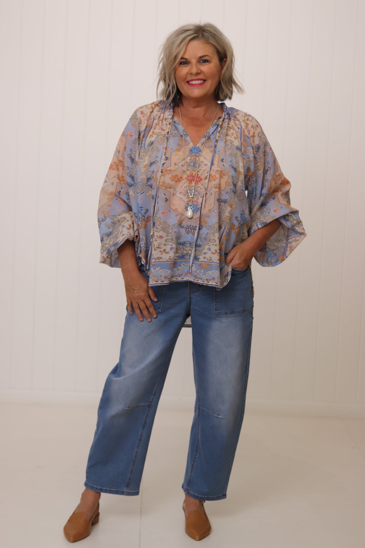 Kay has styled here with our best selling Leo Jeans in Blue Wash with the Blue & Khaki with the Blush.