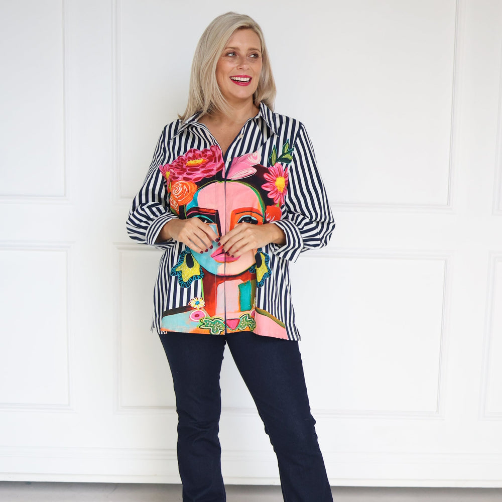 From the fabulous Frida dress, we're introducing the long-sleeved Frida Shirt! Made from 100% cotton, it effortlessly combines playful style with comfort. This shirt features a colourful, floral Frida Kahlo print with pink and white stripe design, and looks fantastic with jeans or linen.