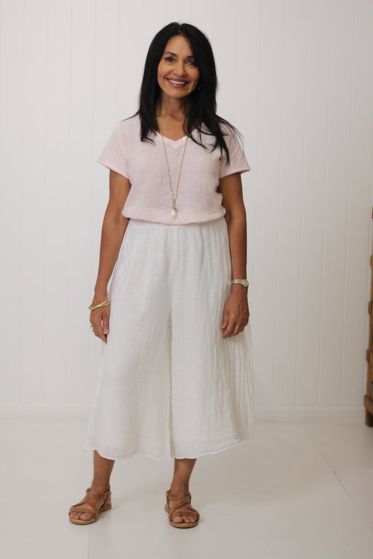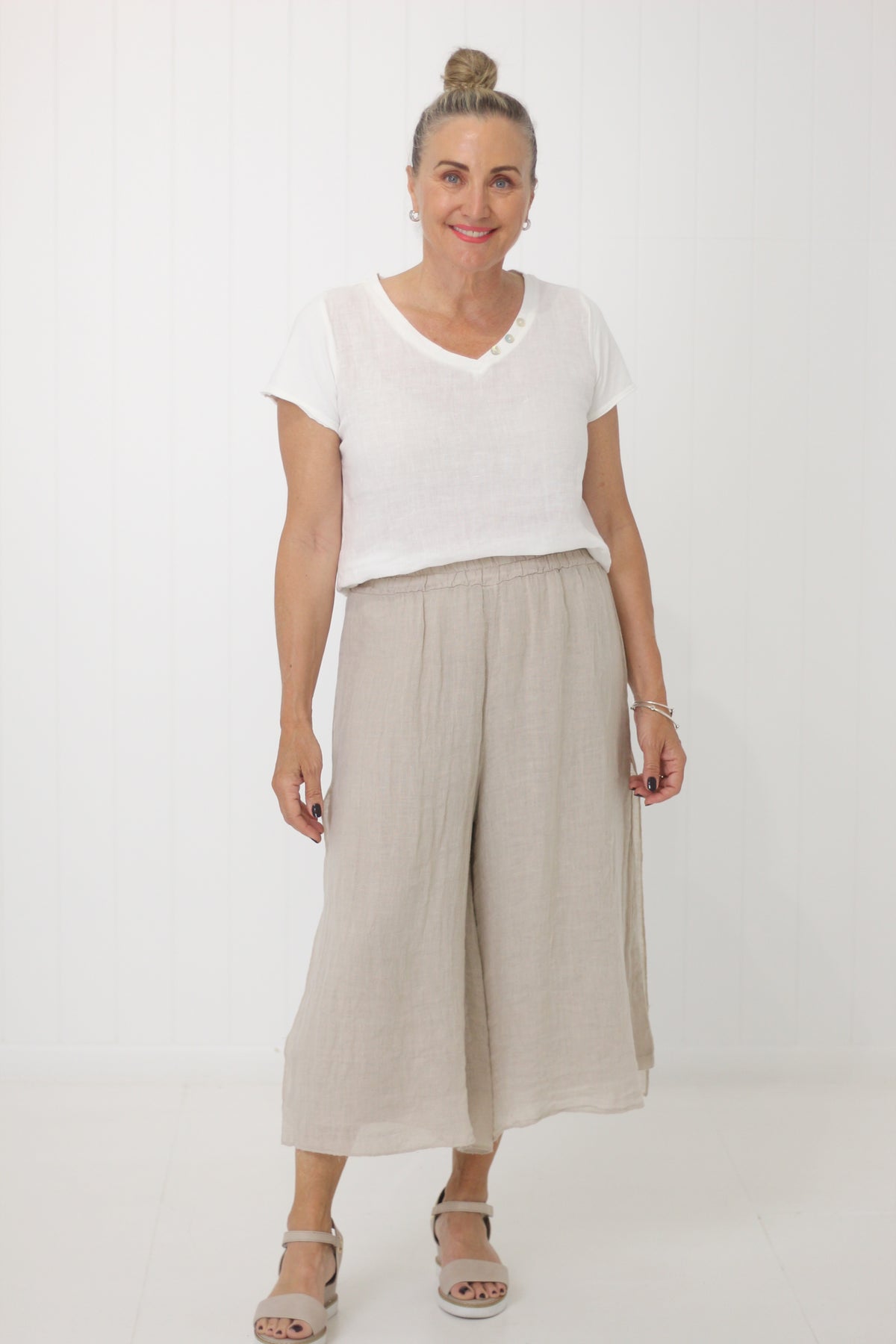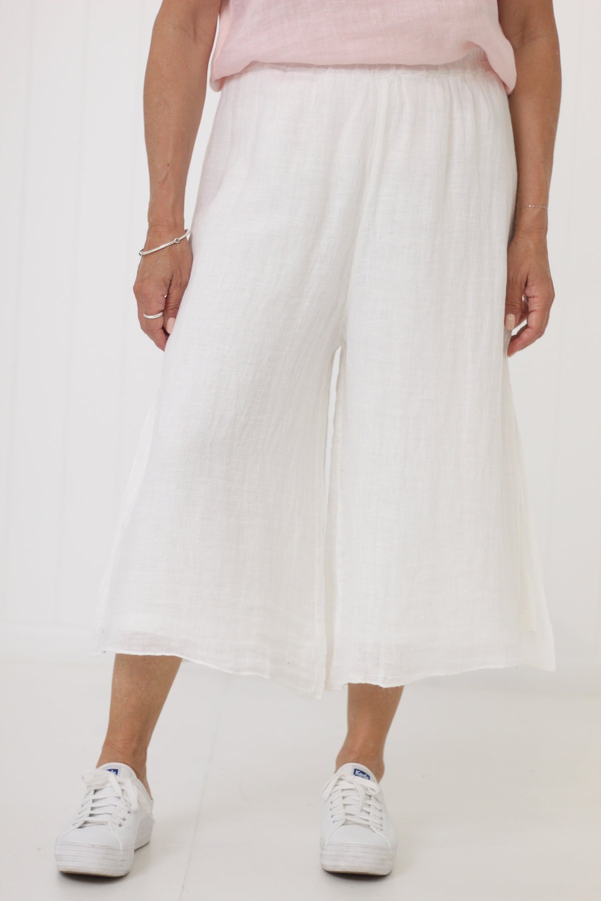 Step into summer with the stylish Hope Pant, crafted from lightweight linen for effortless comfort. These wide-leg, cropped pants offer a feminine, flowy silhouette, complemented by a soft gauze overlay that adds a touch of elegance and texture. Designed for both style and comfort, they feature convenient side pockets—because who doesn’t love pockets? Perfectly paired with any of our chic Sweet Charlotte Studio tops for a look that’s as fashionable as it is comfortable.