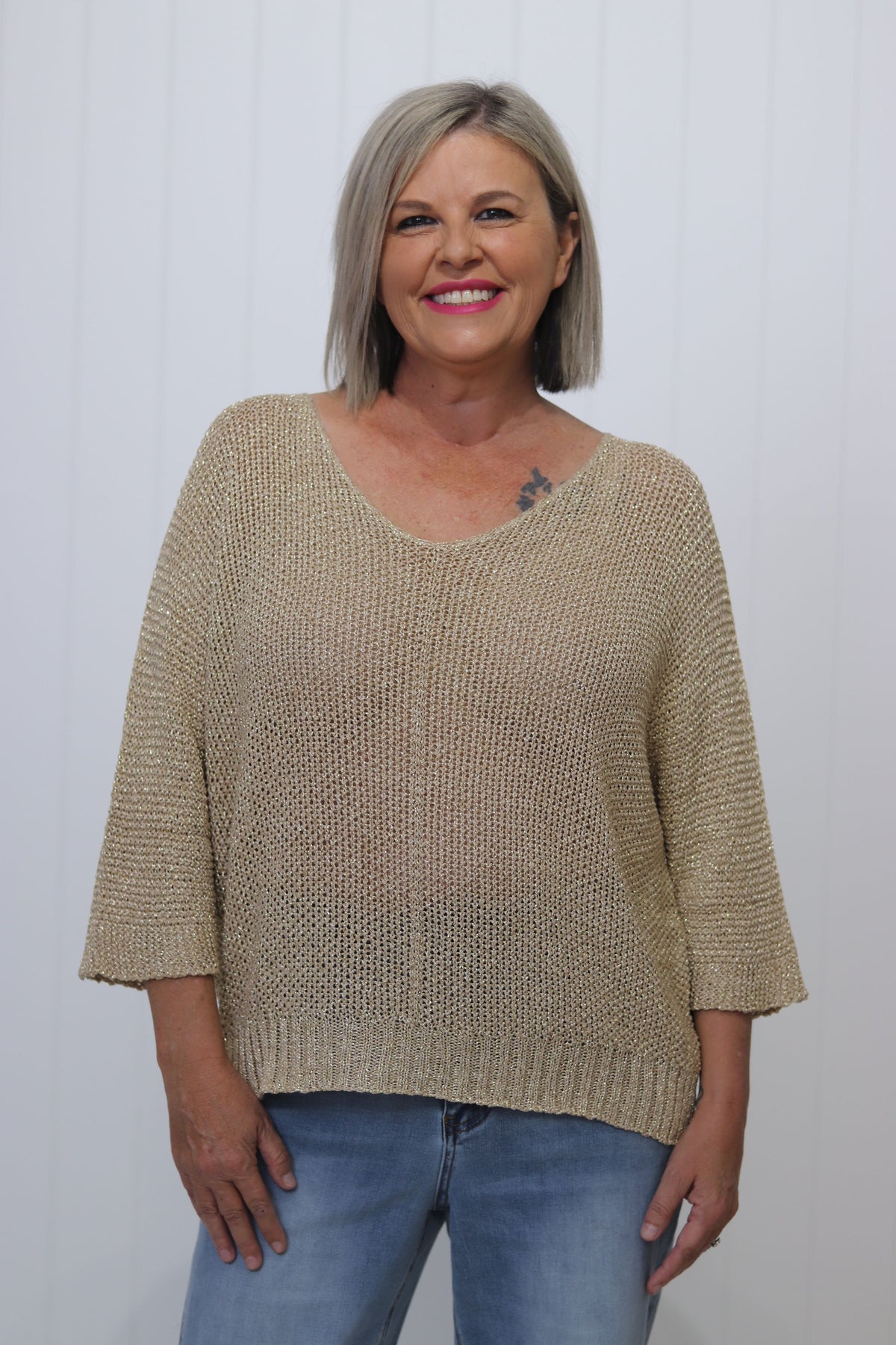 The Issy Top features a lightweight knit fabric with a sheer finish, offering breathability and subtle elegance. Its round V neckline and 3/4 length sleeves provide a flattering silhouette, while a delicate touch of sparkle adds refined sophistication. Perfect for layering or wearing alone, this top combines comfort with a polished look suitable for various occasions.