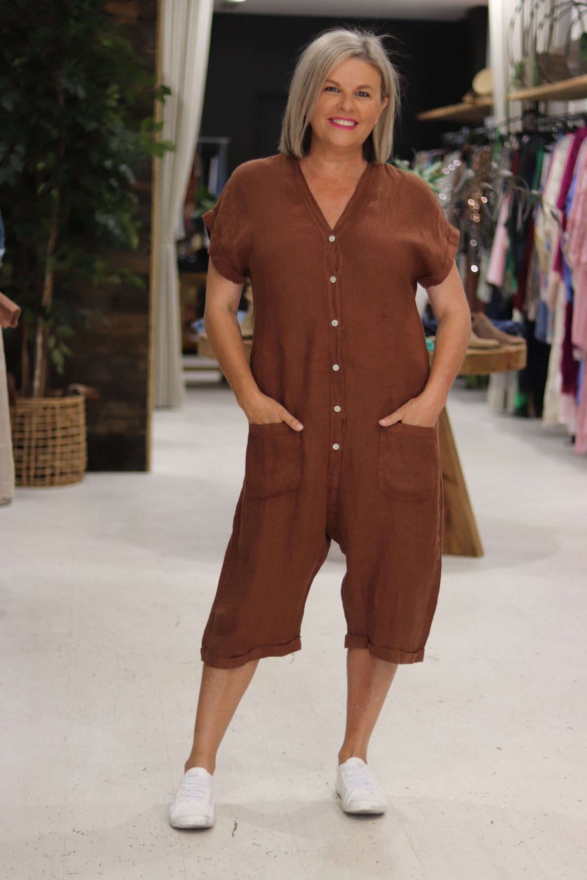 The Jessie Jumpsuit is crafted from lightweight 100% linen, offering breathable comfort for any season. Featuring a versatile V-neck and button-down front, it combines ease with style. Practical front and back pockets add functionality, while short sleeves and a mid-length pant cut ensure a flattering fit. Ideal for effortless sophistication, this one-piece is a smart addition to your wardrobe.