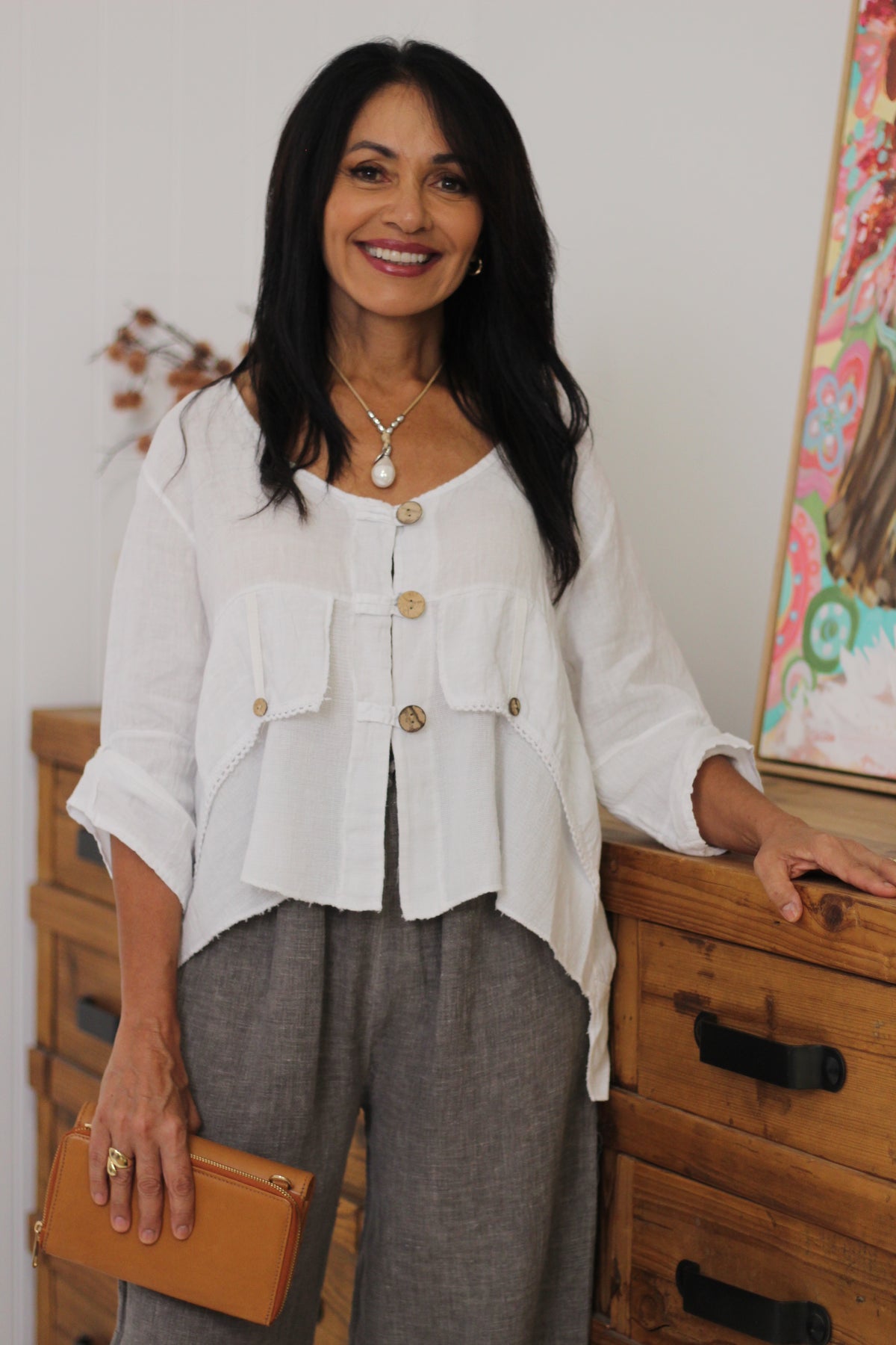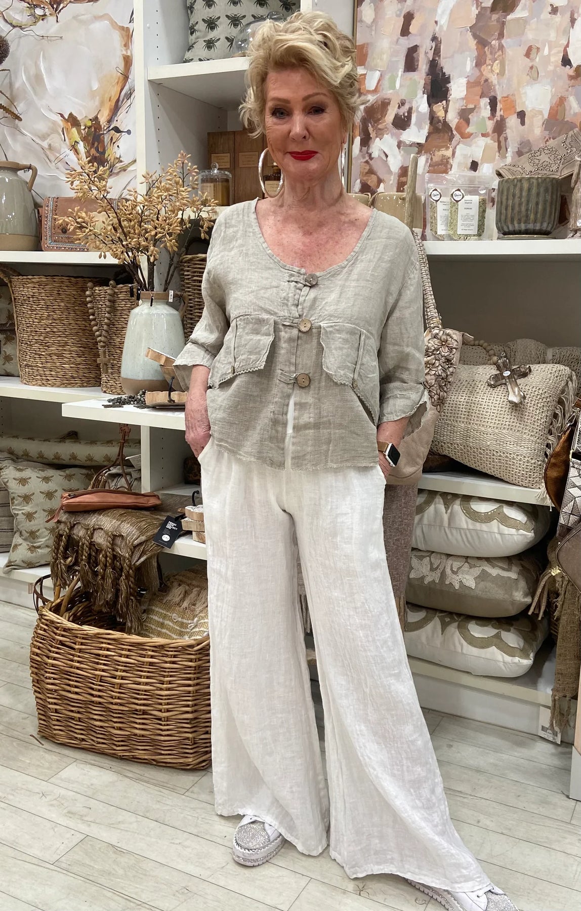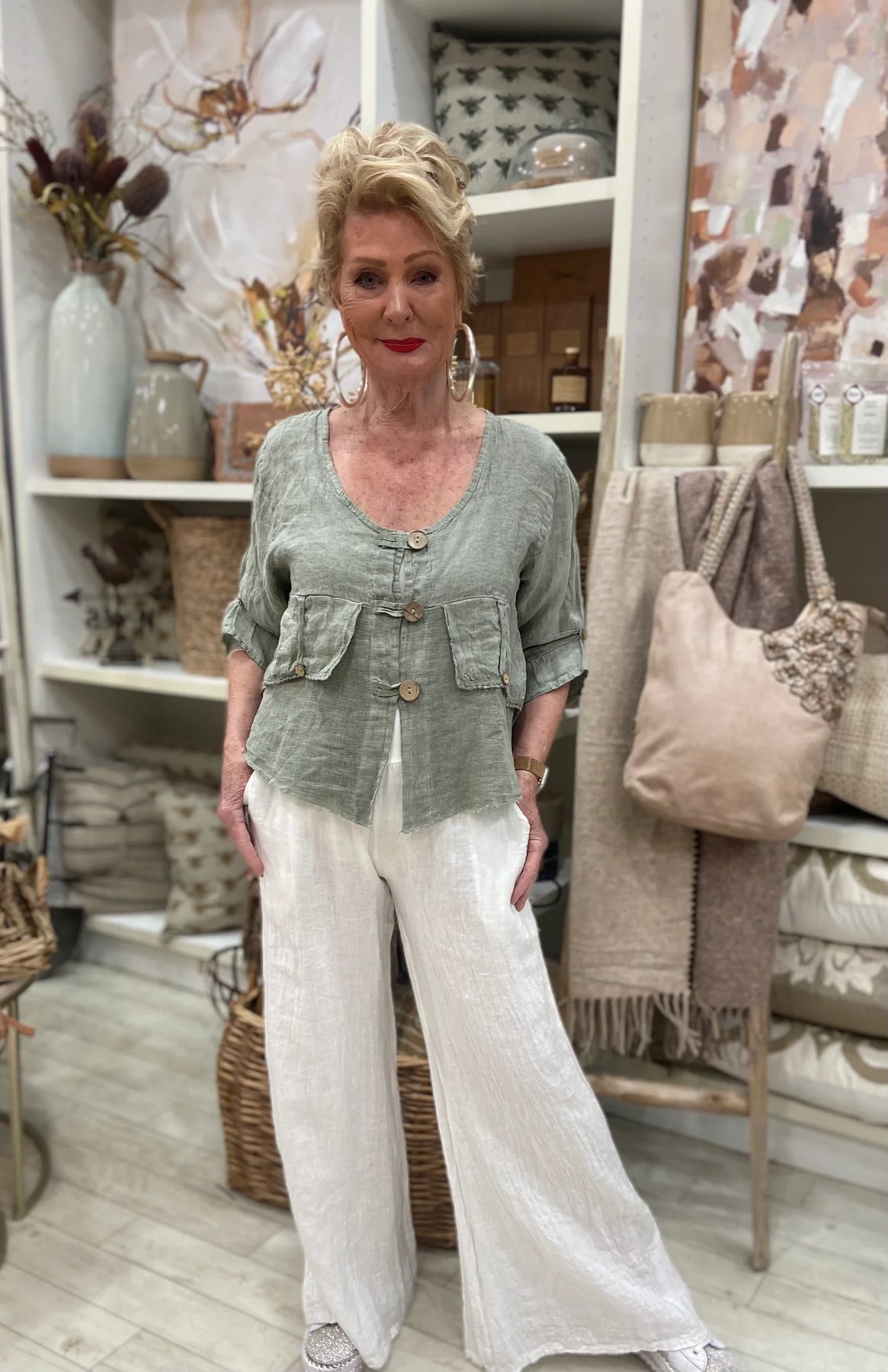 Drina is a size 8 and has styled the Jordyn Top with the Tamara Pant and the Immacolata Pant.