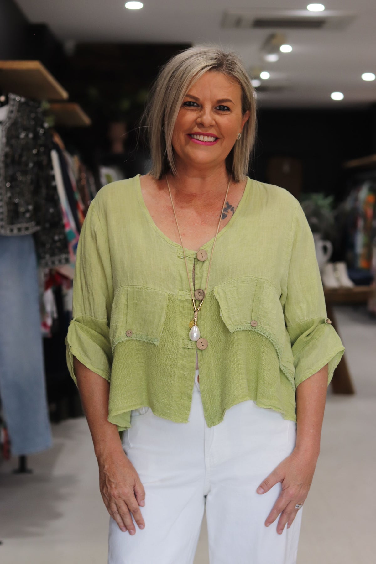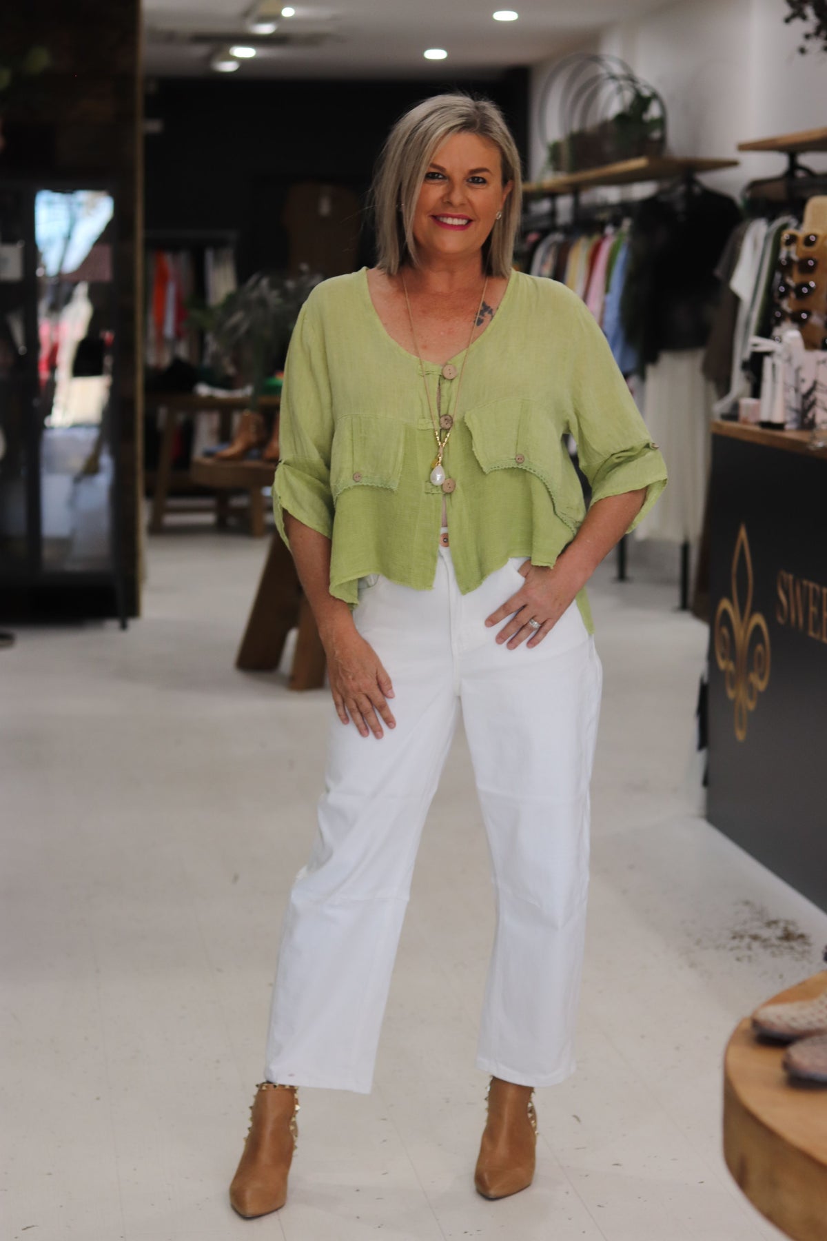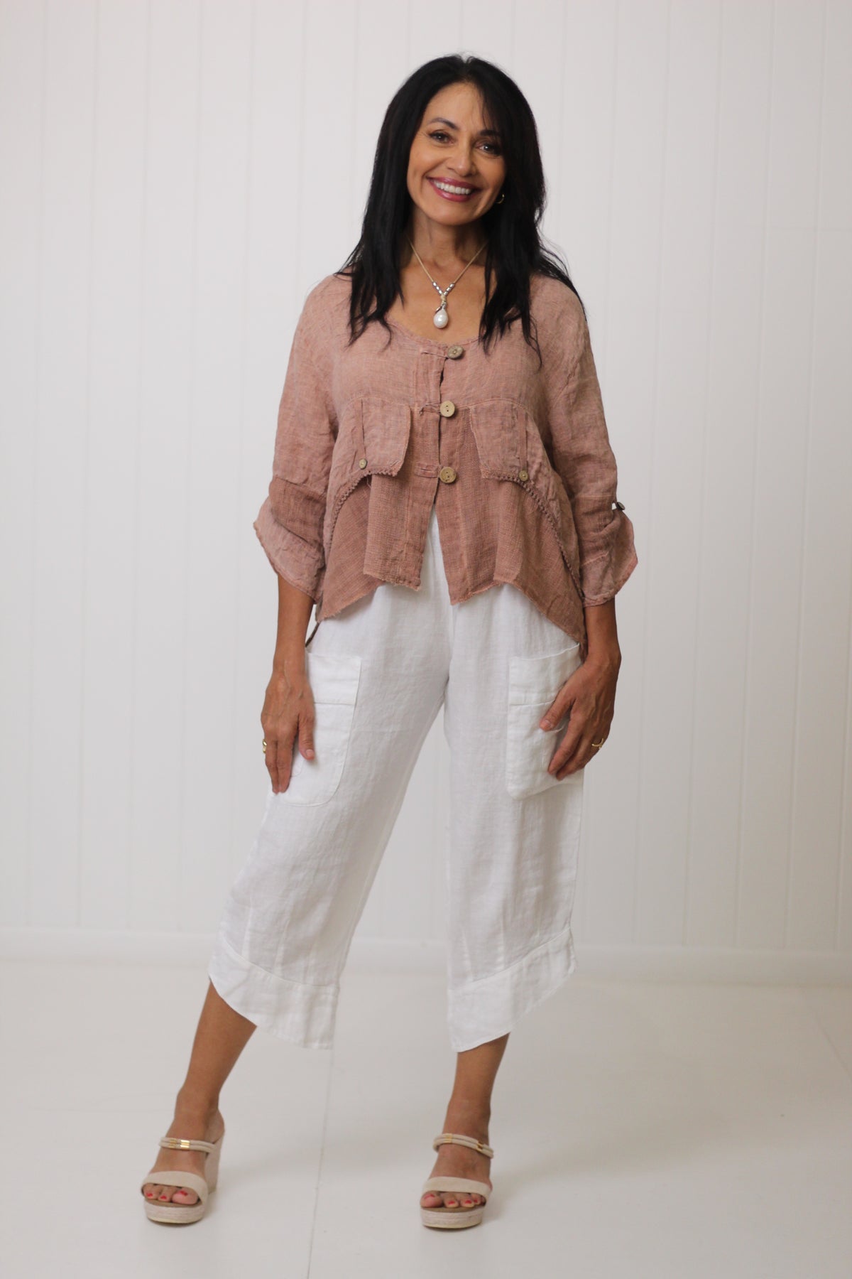 Drina is a size 8 and has styled the Jordyn Top with the Tamara Pant and the Immacolata Pant.
