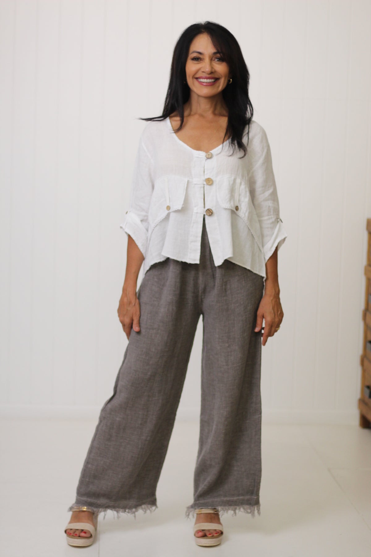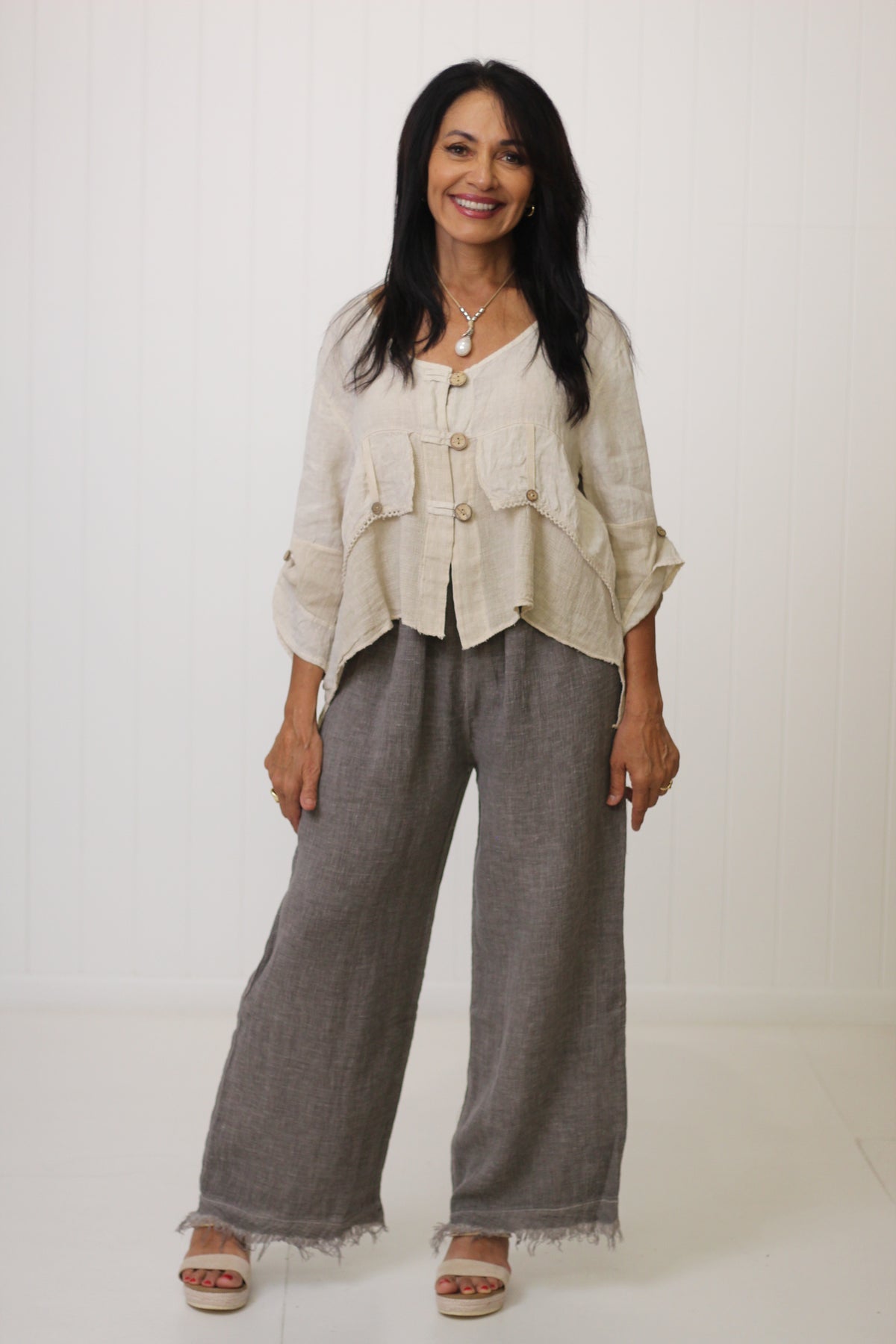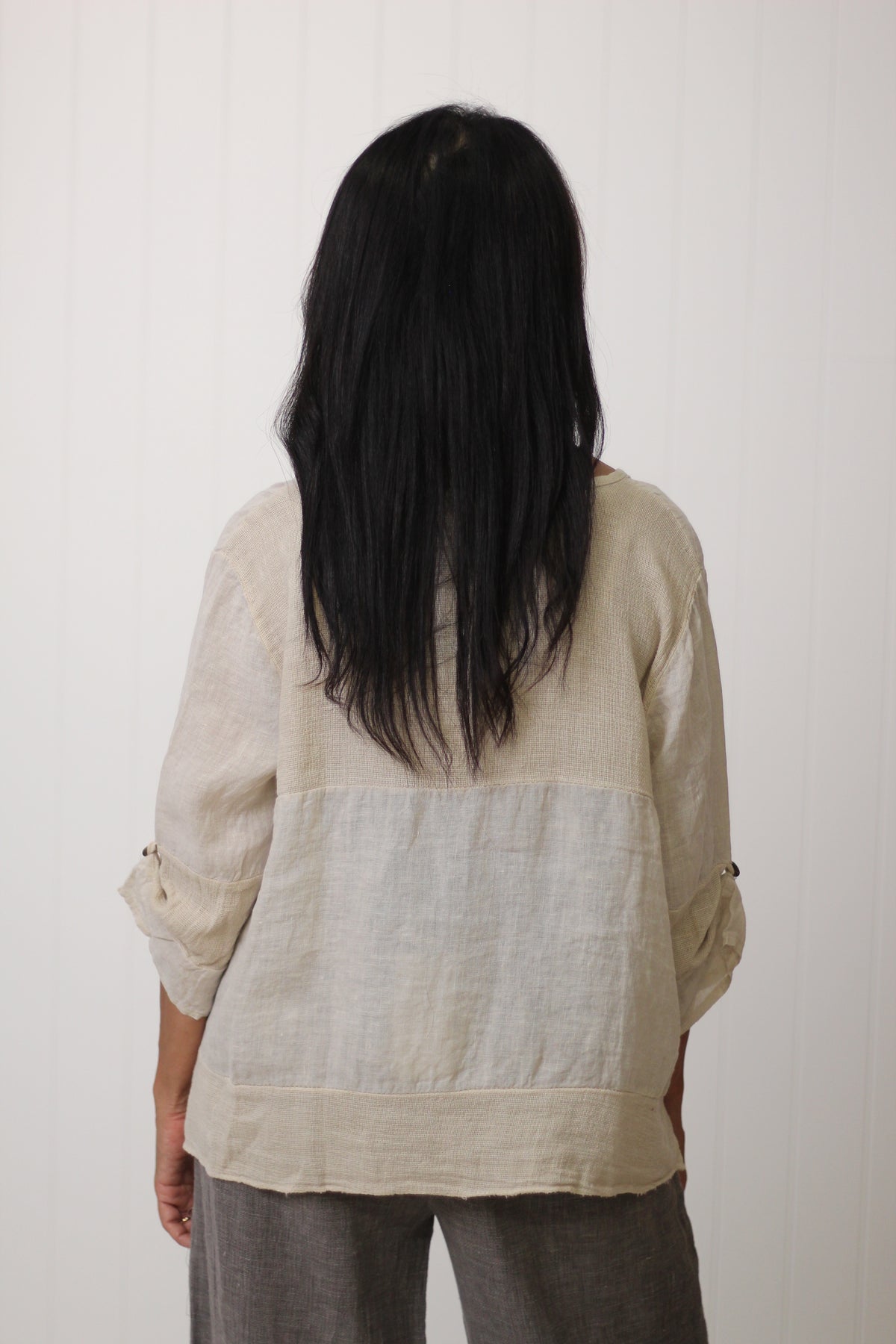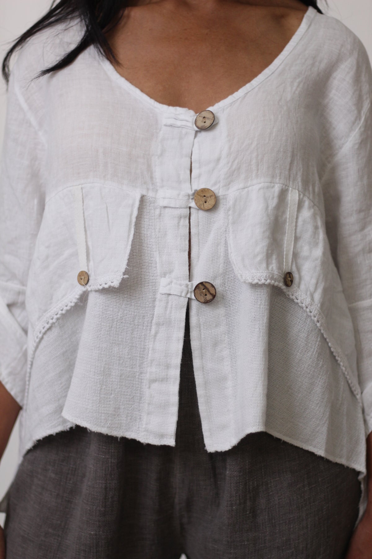 The Jordyn Top exudes effortless style, crafted from a breathable blend of linen and cotton gauze. Made in Italy, it showcases thoughtful details, including wooden buttons, long sleeves, and a distinctive high-low hemline.