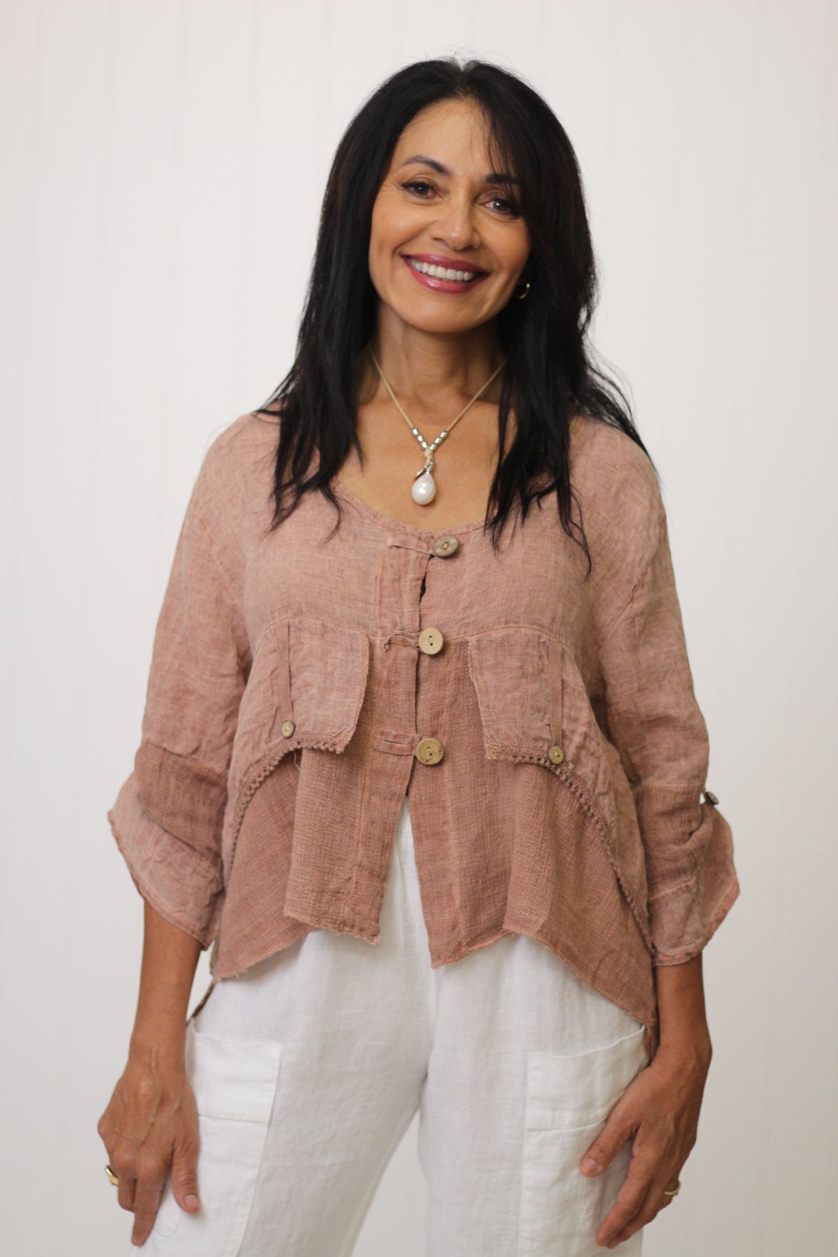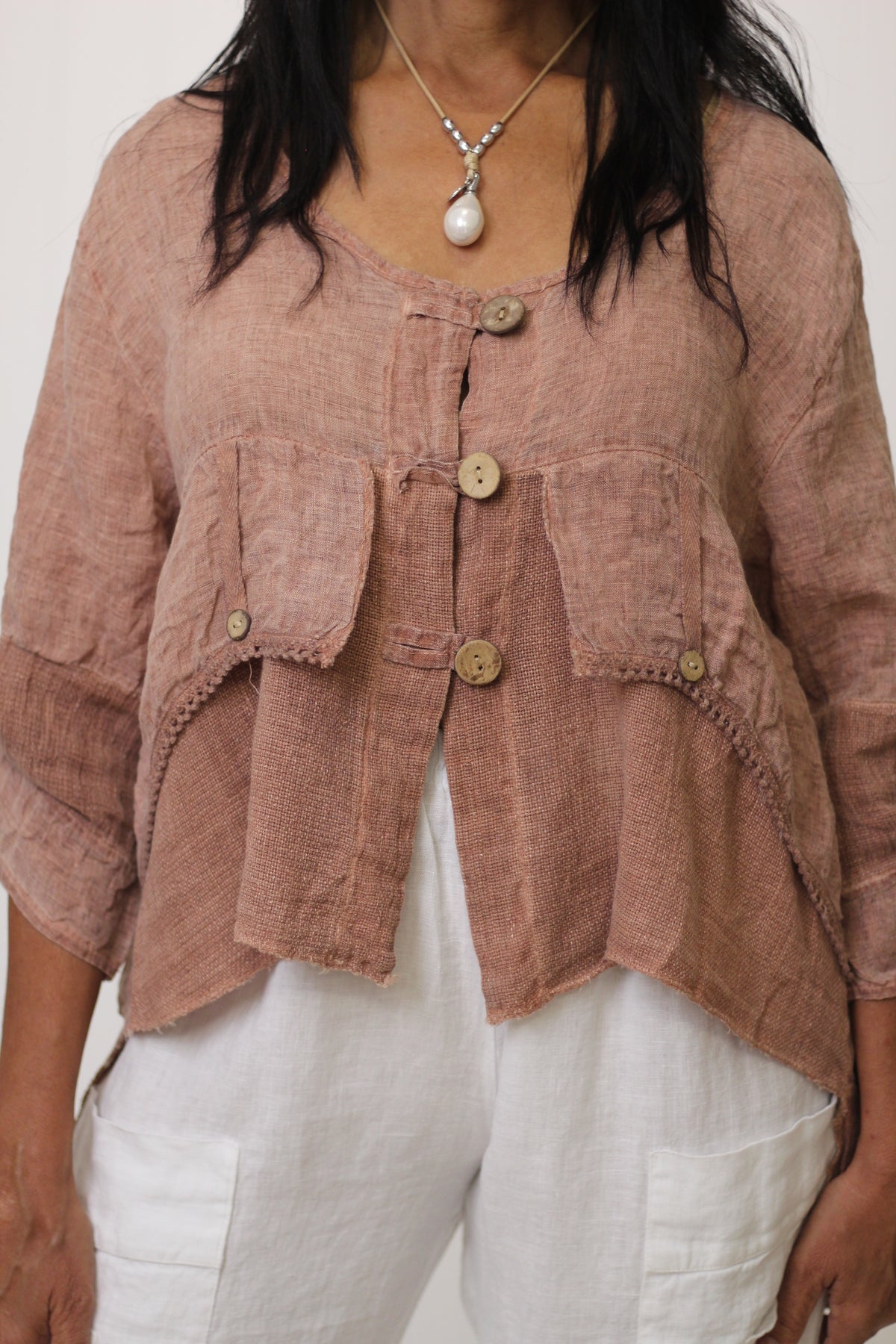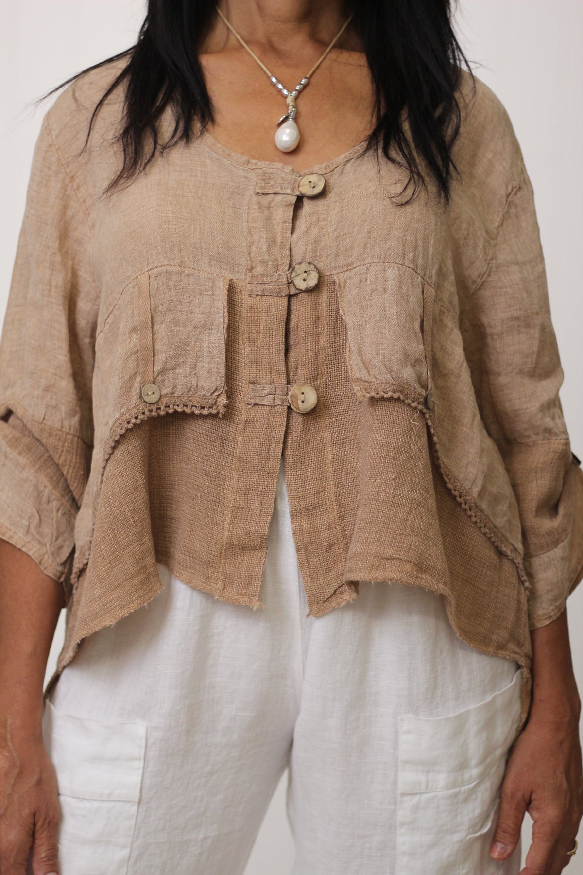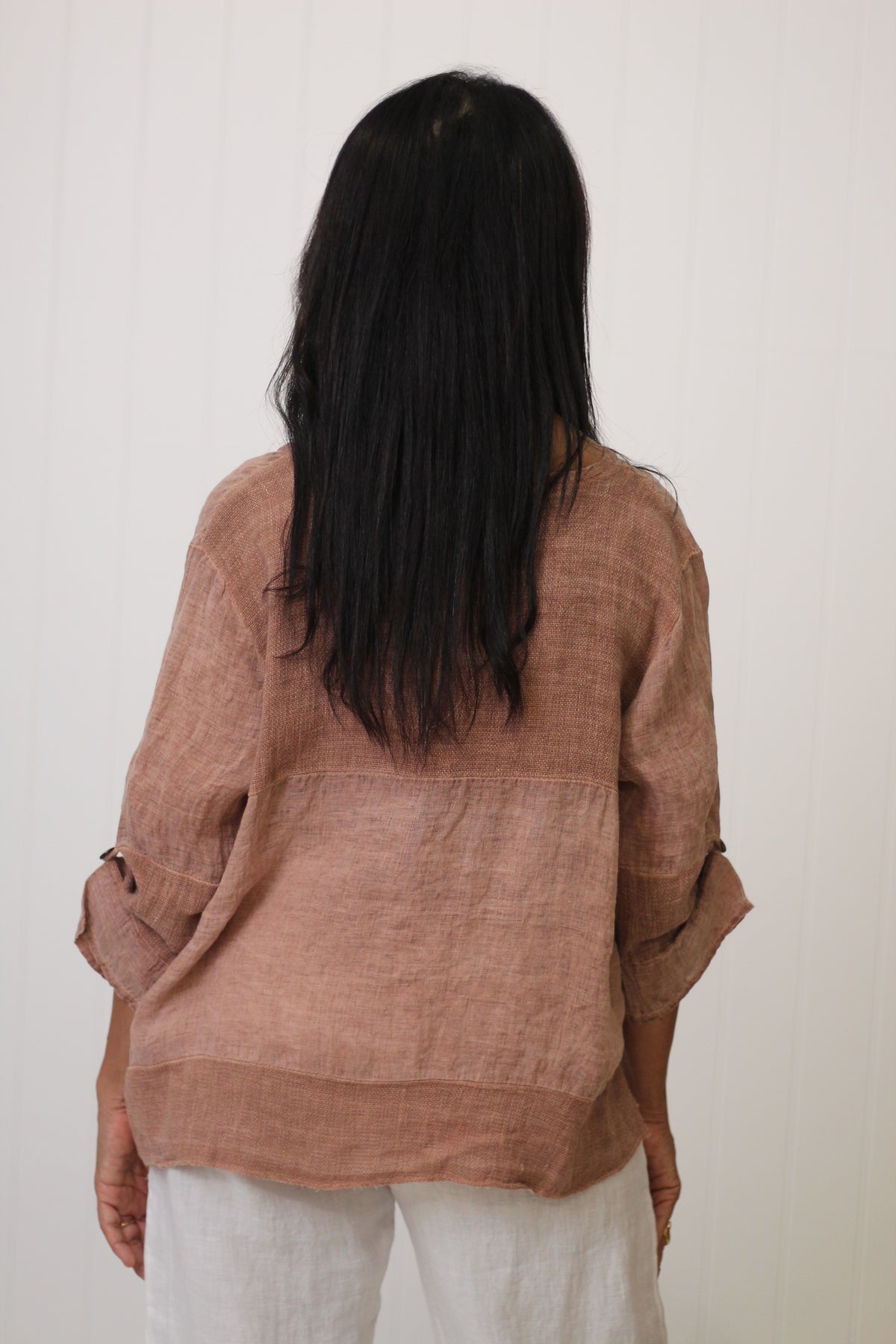 The Jordyn Top exudes effortless style, crafted from a breathable blend of linen and cotton gauze. Made in Italy, it showcases thoughtful details, including wooden buttons, long sleeves, and a distinctive high-low hemline.