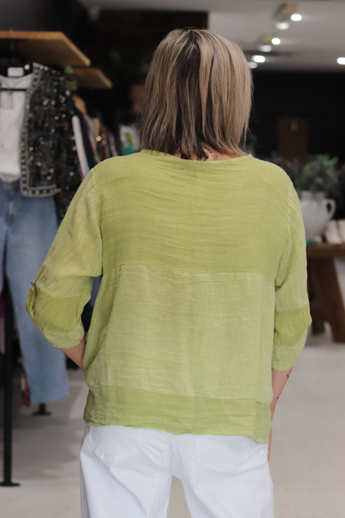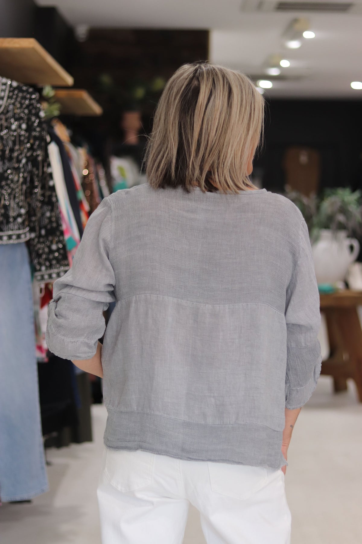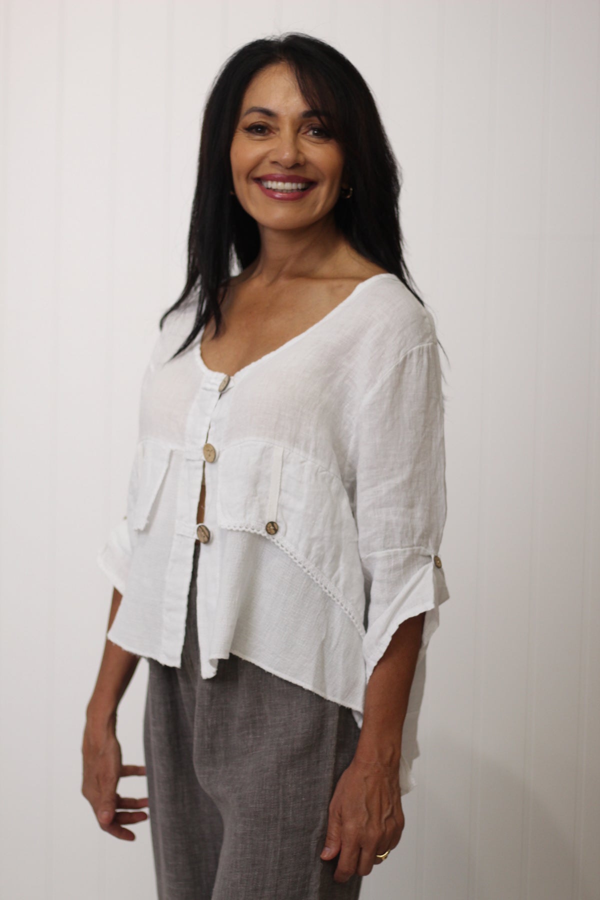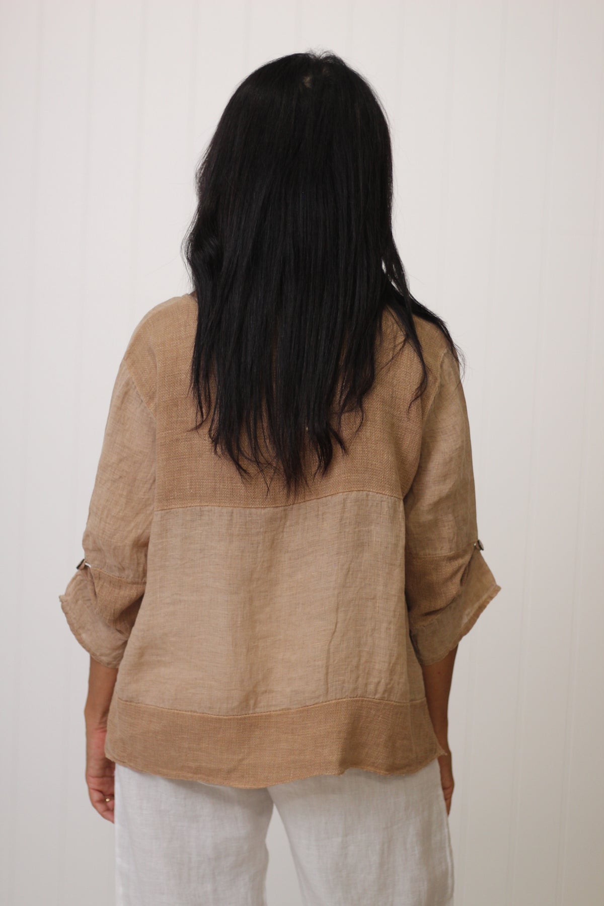 The Jordyn Top exudes effortless style, crafted from a breathable blend of linen and cotton gauze. Made in Italy, it showcases thoughtful details, including wooden buttons, long sleeves, and a distinctive high-low hemline.