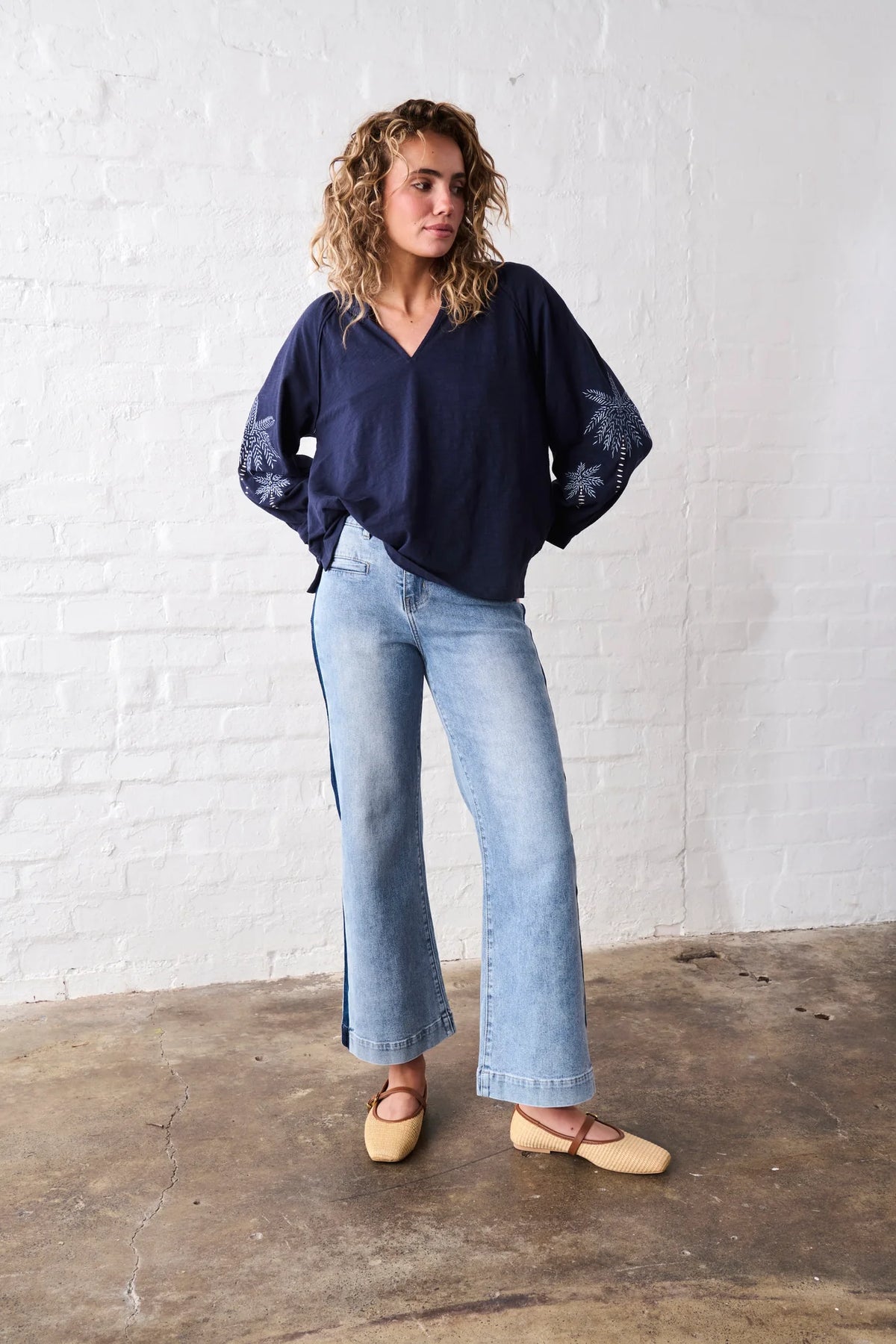 The relaxed Kimberley Top delivers all of its style in the thoughtful details. Its cool 100% cotton marle fabrication and subtle palm tree embroidery on the arms add unique touches. Extra detail comes through with the tailored, comfortable neckline and perfectly executed vee, while the ¾ arms are finished with a delicate buttoned cuff. Wear casually during the day, or to comfortably dress up for a summer evening barbecue.