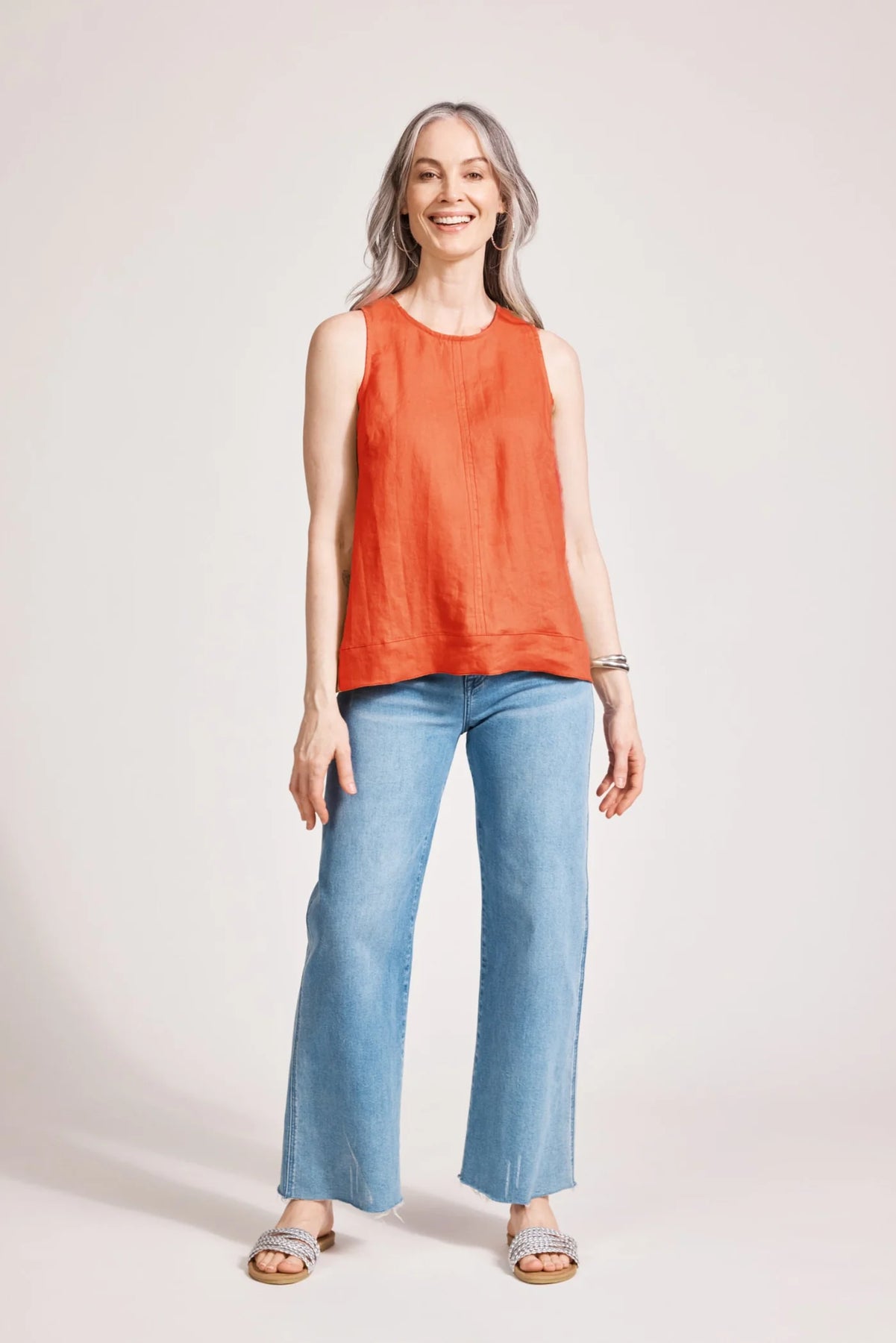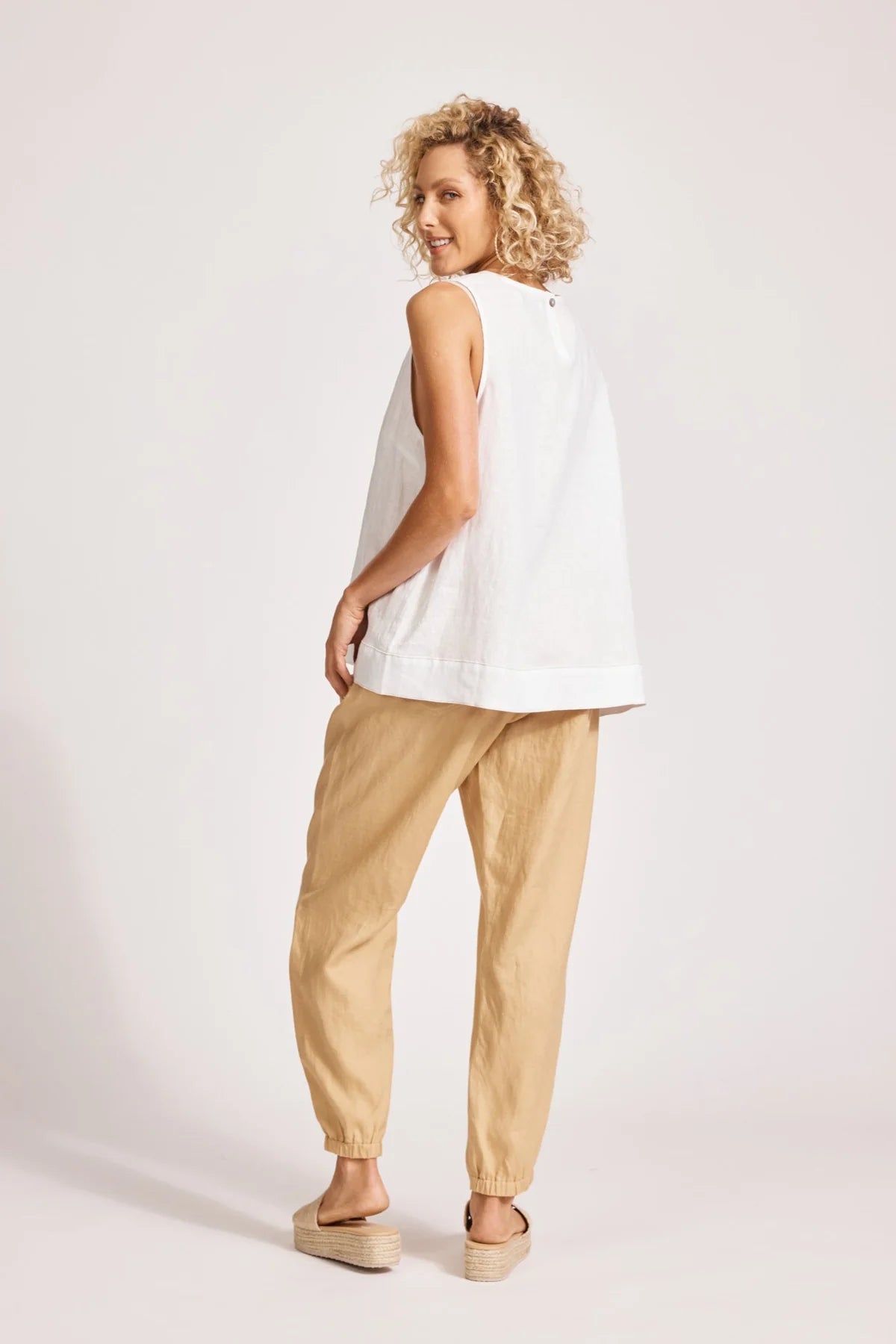 A relaxed linen tank with refined detailing. Crafted from 100% linen for breathable comfort. Features exposed shoulders, contrast decorative topstitching, button closure at the back neck, wide cuffed hem, and soft A-line silhouette.