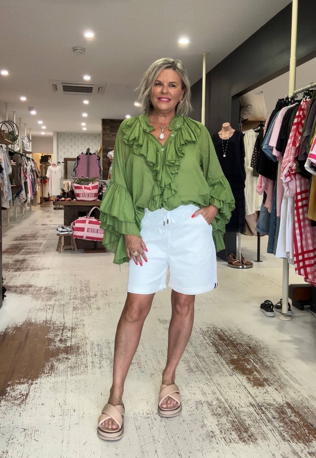 The Moselle Top features delicate feminine ruffles on the front and sleeves, complemented by a classic button-front design.