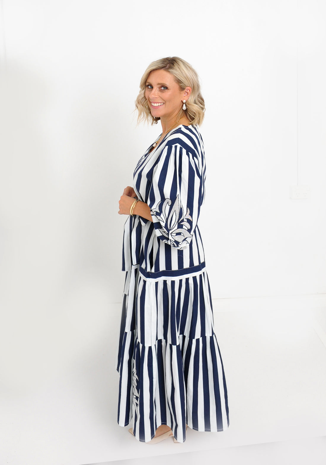 Versatile and effortlessly stylish, this dress transitions seamlessly from day to night—perfect for a casual brunch, a day at the office, or an evening out. The blend of breezy stripes and intricate detailing makes it a wardrobe staple that works for you around the clock. No need to bother with too many accessories here as the dress does all the work for you!