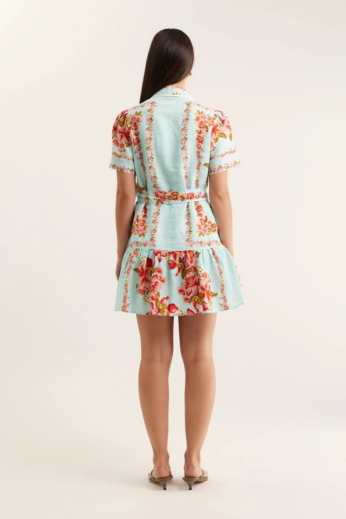 Stay cool and comfortable in our Renae Linen Dress Portofino. Made from 100% linen, this dress features a short sleeve and collared design, with a mint Portofino print and a concealed button placket. The gathered tiered skirt adds a touch of elegance, while the sash belt cinches the waist for a flattering silhouette. Keep it clean and fresh with a gentle hand wash.