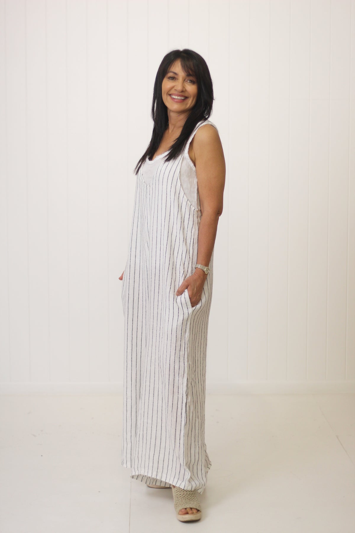 Drina is a size 8-10 and this garment is a one size. Drina has styled the Salvatore Overalls with the Raw Edge Cami underneath.