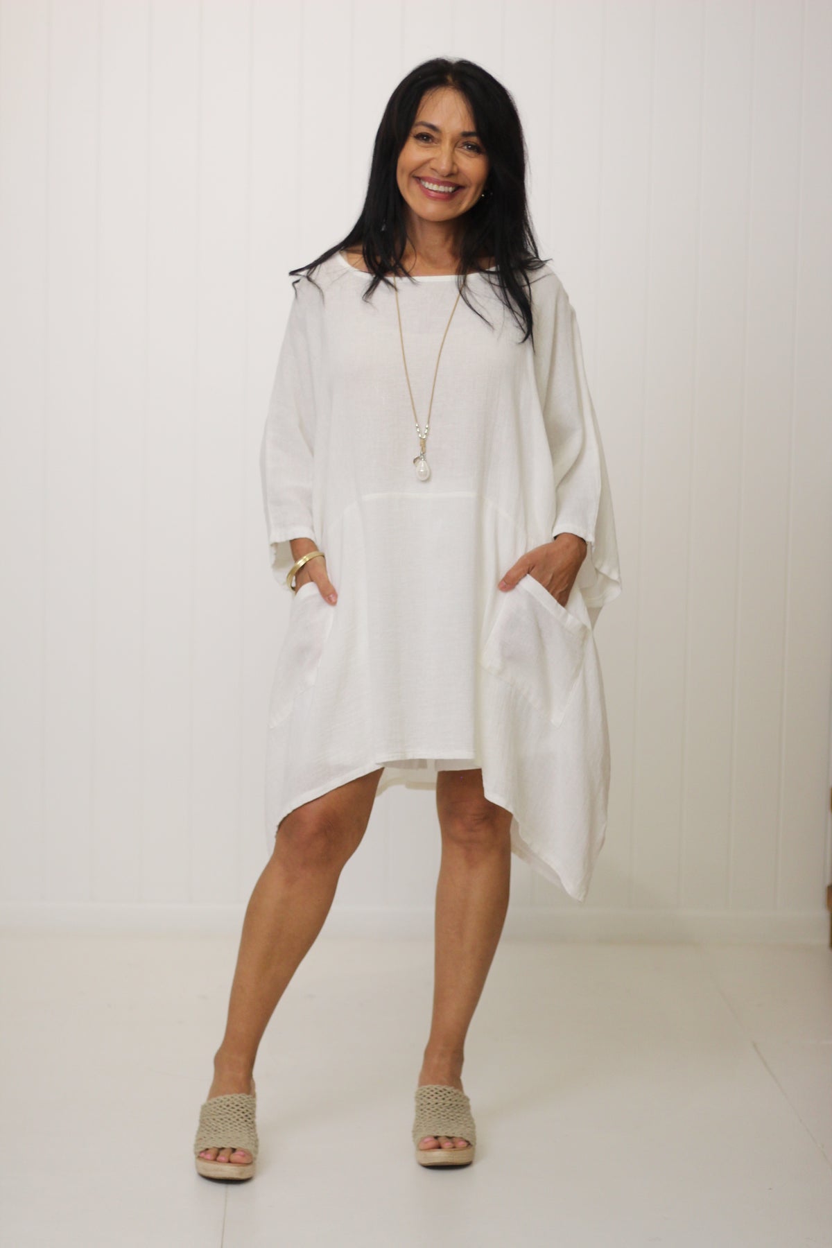The Sardinia Top in a luxurious Milano Weave. This is an essential style for our customers who love to layer! Divine soft linen falls beautifully with the front pockets adding to the drape effect.