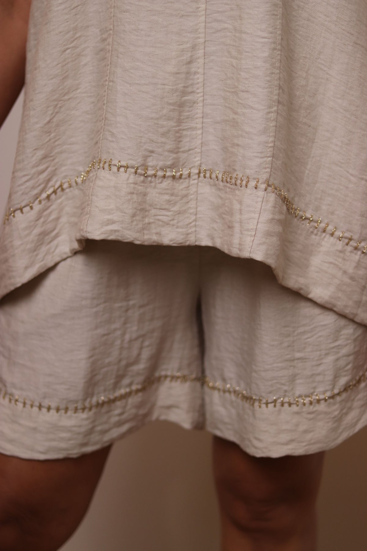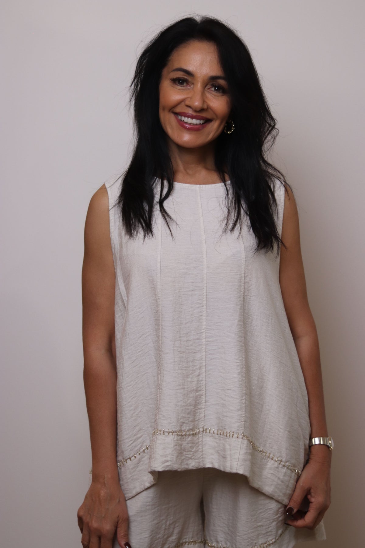 The Scarlett Stitch Top combines timeless linen fabric with expert craftsmanship. Featuring a sleeveless design and a classic round neck, it offers both comfort and effortless style. The subtle gold glitter stitching along the hemline of the top adds a refined touch of elegance, making this top a versatile piece for both casual and sophisticated occasions.