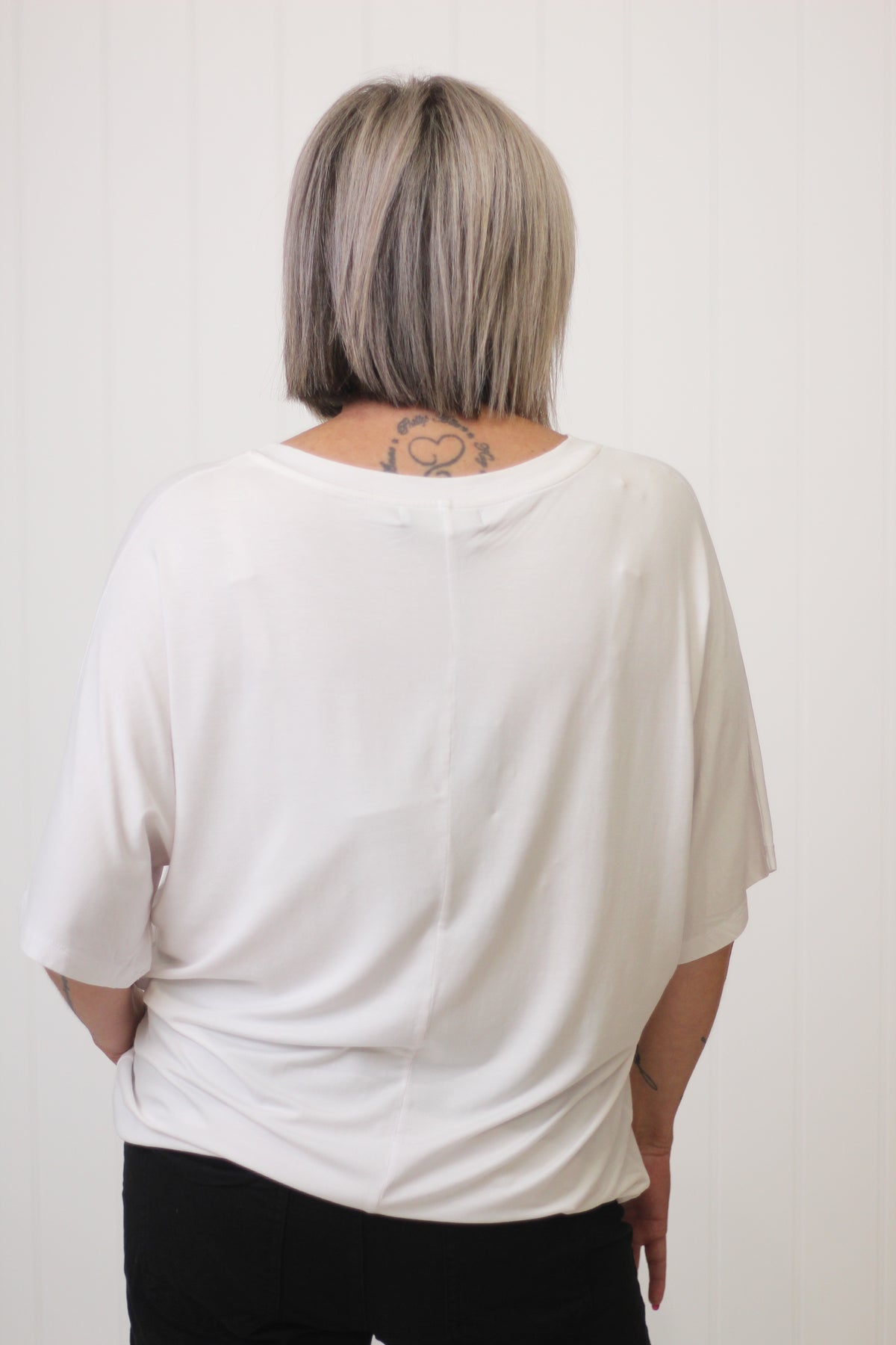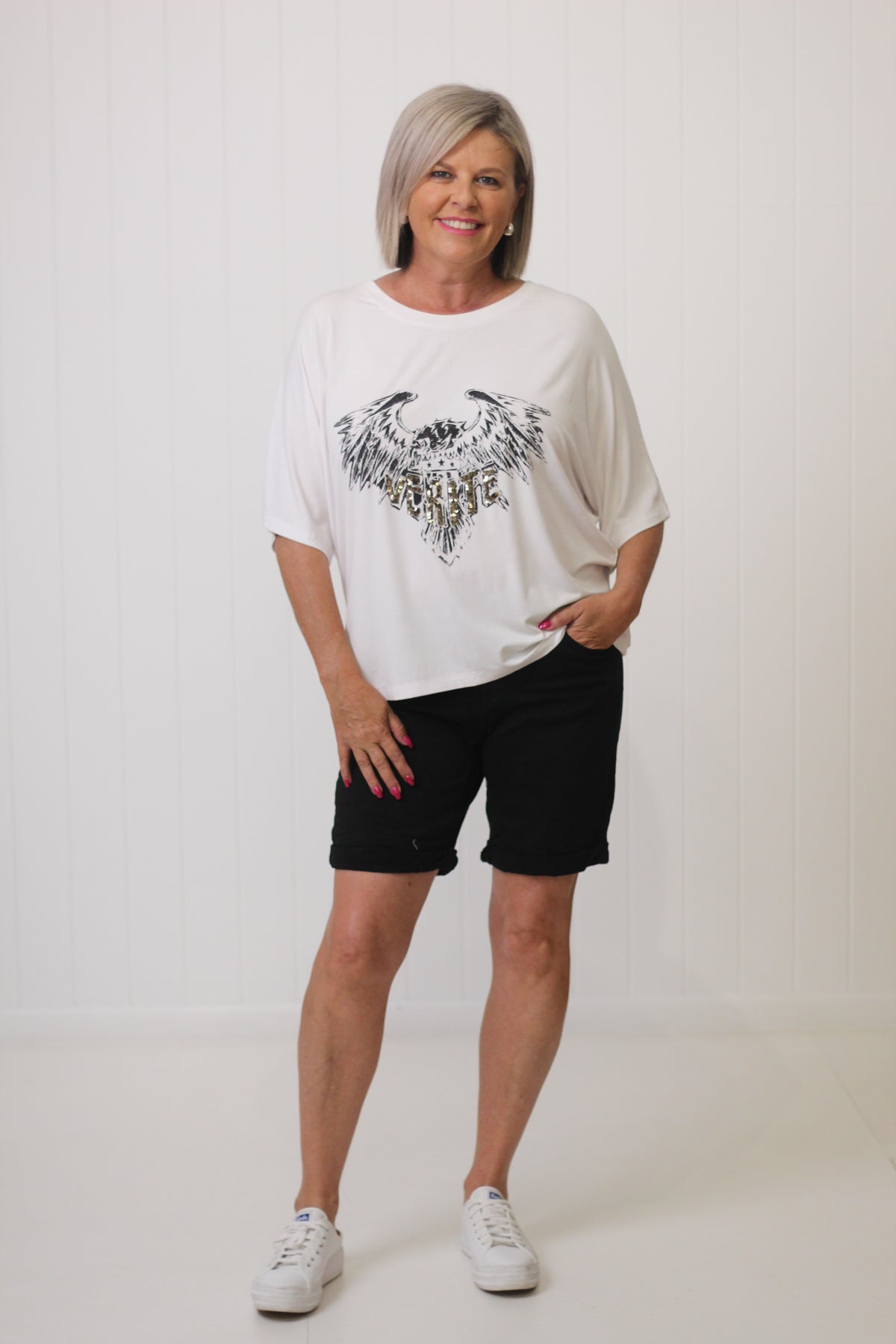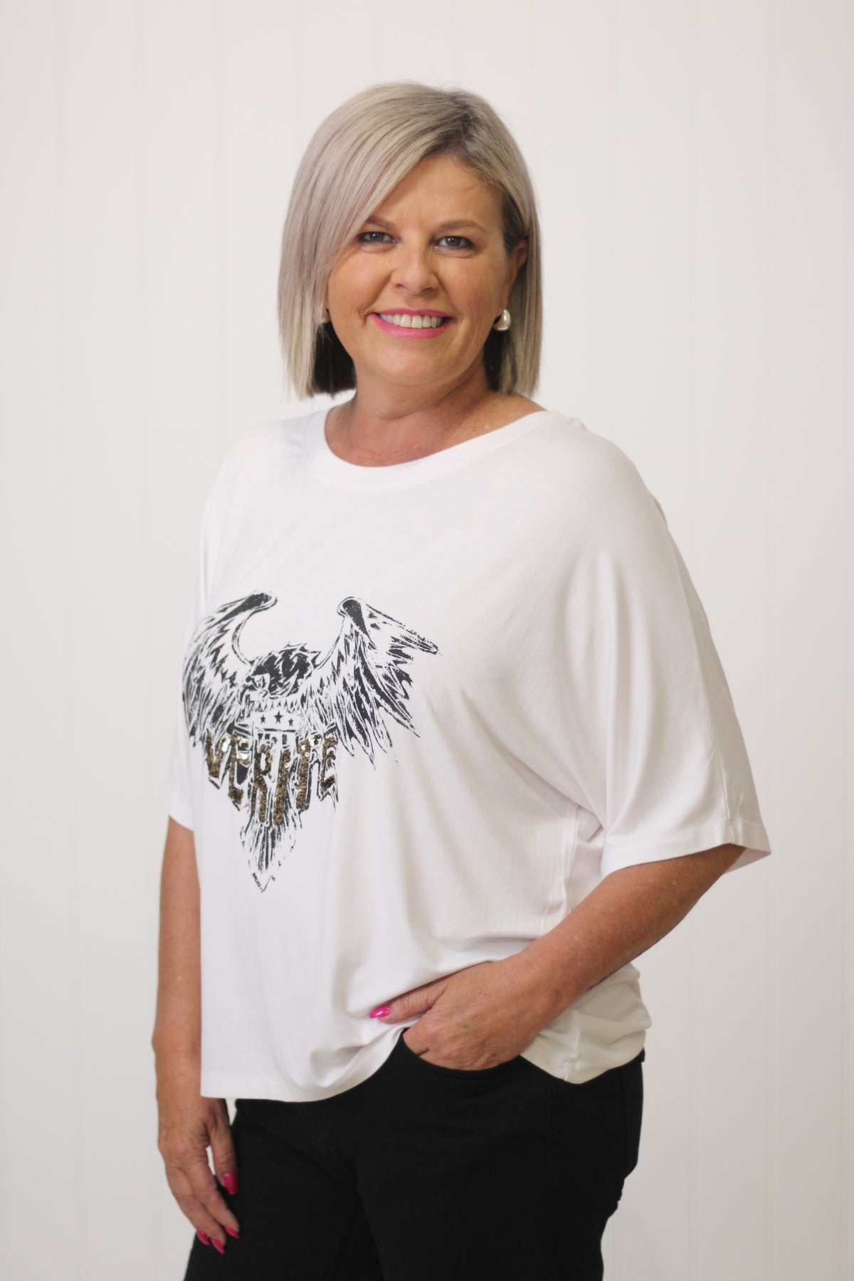 The Verite Top created from 100% rayon features a round neckline, 'Verite' embellished in sequins on the front, elbow length sleeves and a loose fit, flattering for all body shapes. Wear it loose for comfort or tuck at the front for a little more definition.