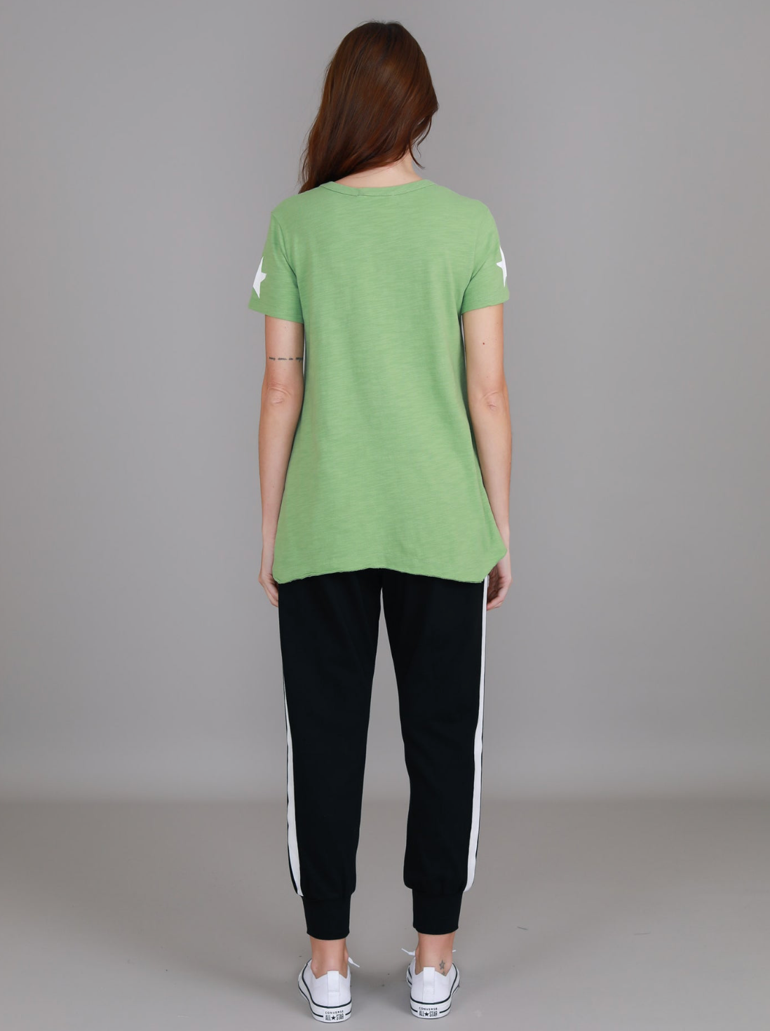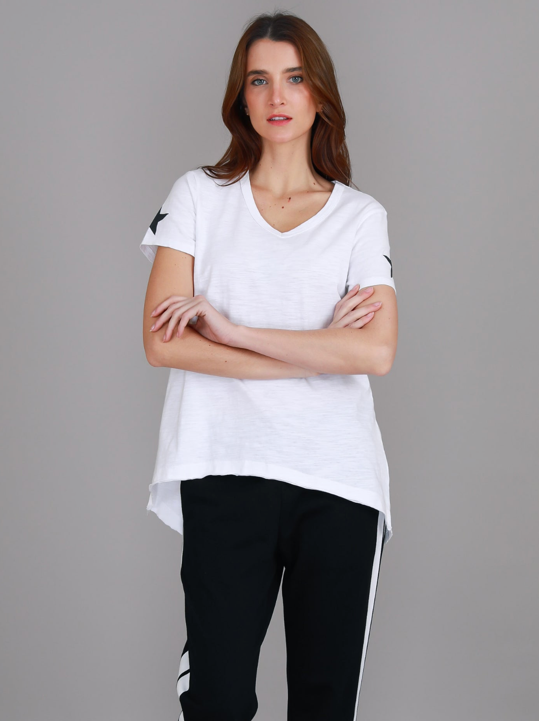 Discover the perfect balance of effortless style and timeless sophistication with Verona’s Twin Star T Shirt. Boasting a V-neck, a unique twin star print, and a raw edge hem - all crafted from the finest t shirt fabric - this chic piece is the epitome of classic and modern design.