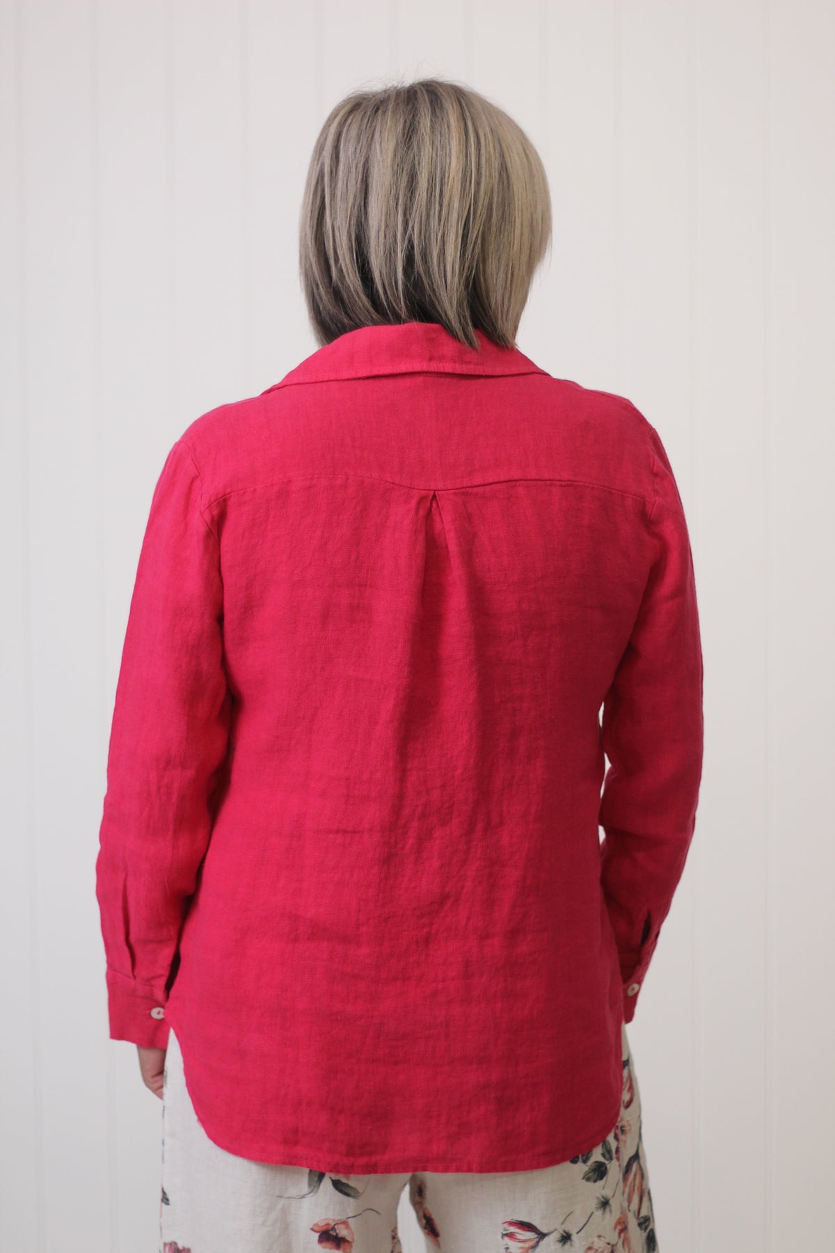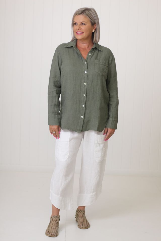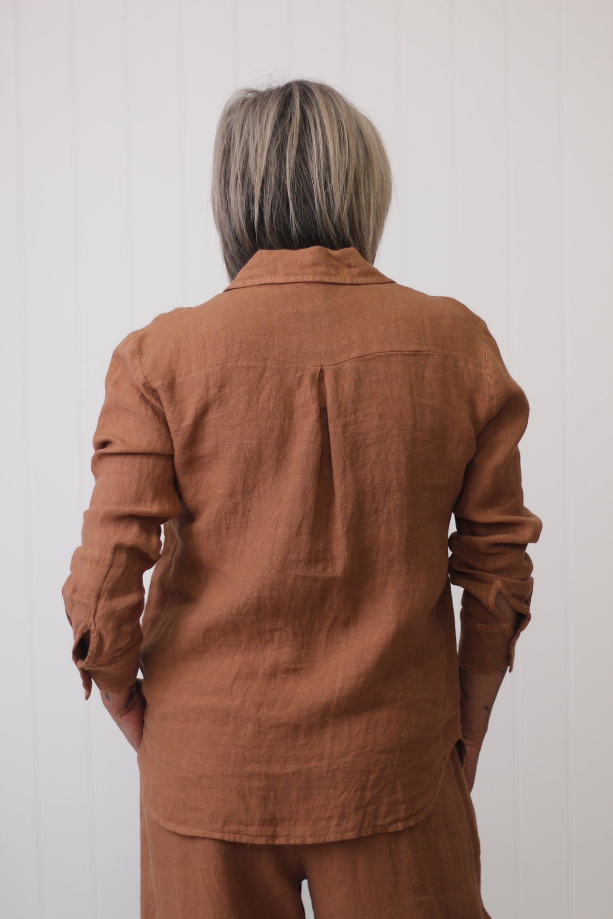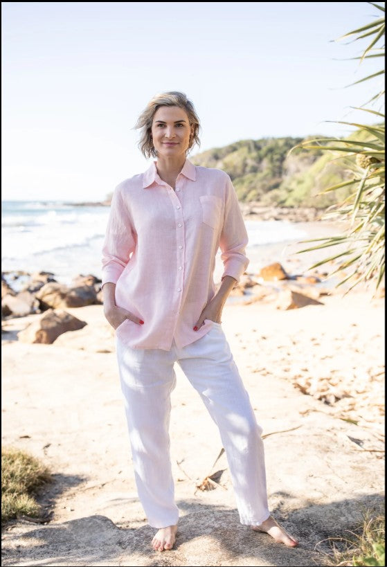 The Blair Top is a wardrobe staple that can be worn all year round. Made with soft Italian linen, this classic button down shirt features a full length sleeve that can be rolled up for a more casual look. Completed with a breast pocket for additional detail. This top is a timeless and versatile addition to any wardrobe. Available in a number of beautiful colours. May also be worn as a light jacket over a cami or tee, mix it up! Upsize for that baggy look that's in this season.
